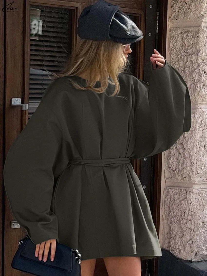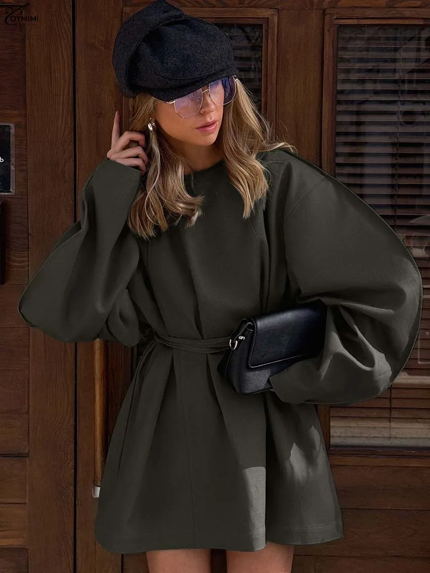 Oymimi Fashion Olive Drab Cotton Womens Dresses Casual Loose O-Neck Long Sleeve Dresses Elegant Lace-Up Mini Dress Streetwear