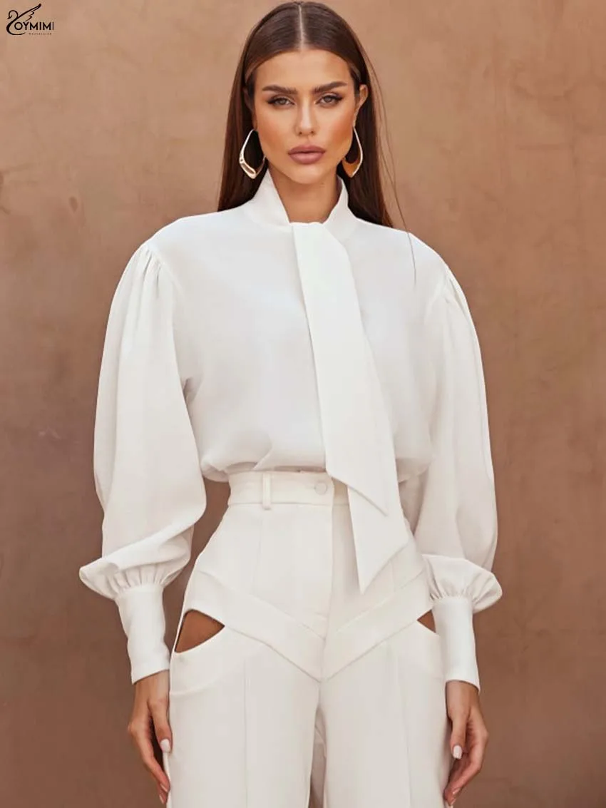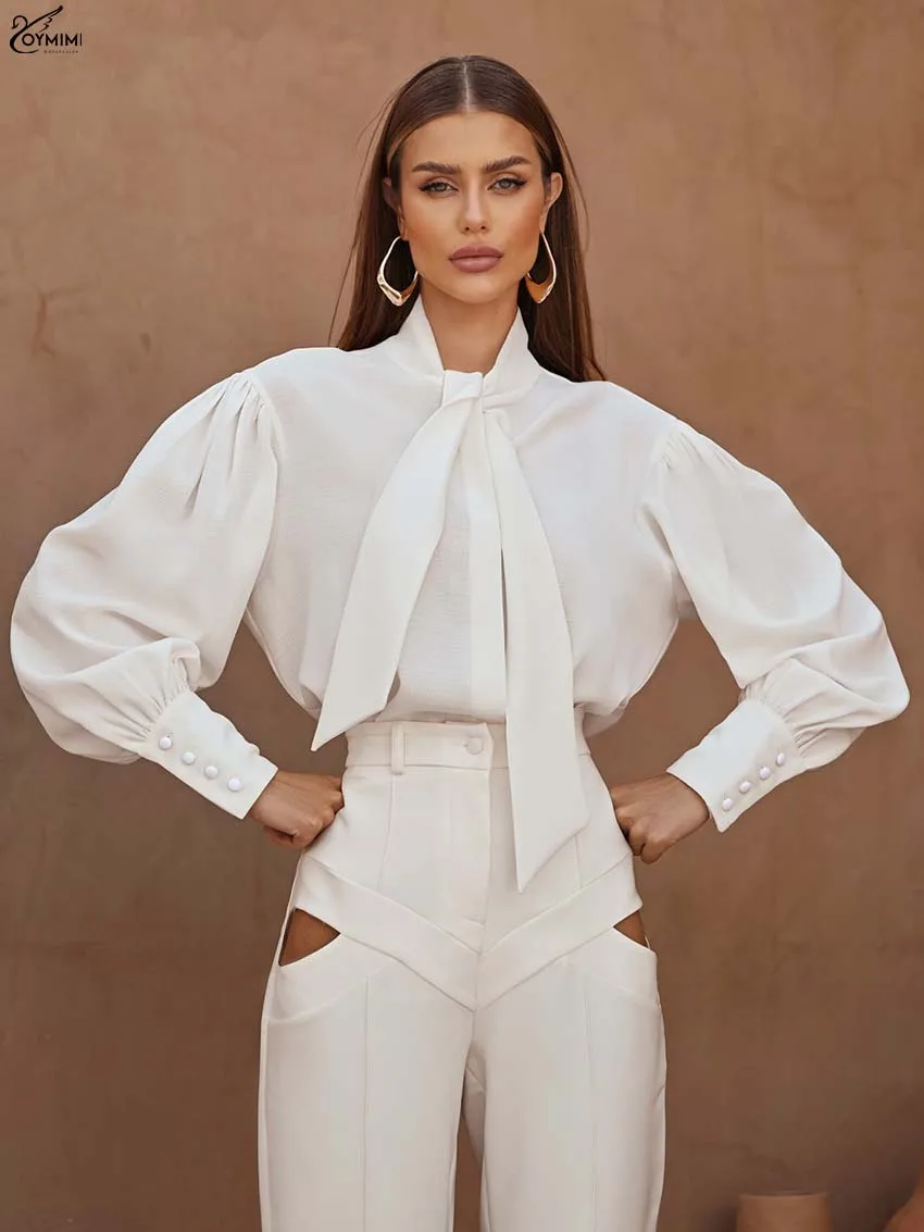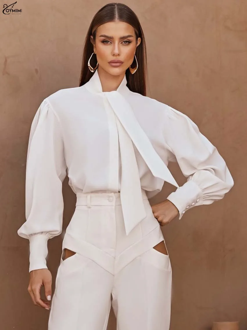 Oymimi Fashion White Lace-Up Neck Women's Shirt Casual Long Sleeve Single Breasted Blouses Elegant New Solid Loose Blouses 2025
