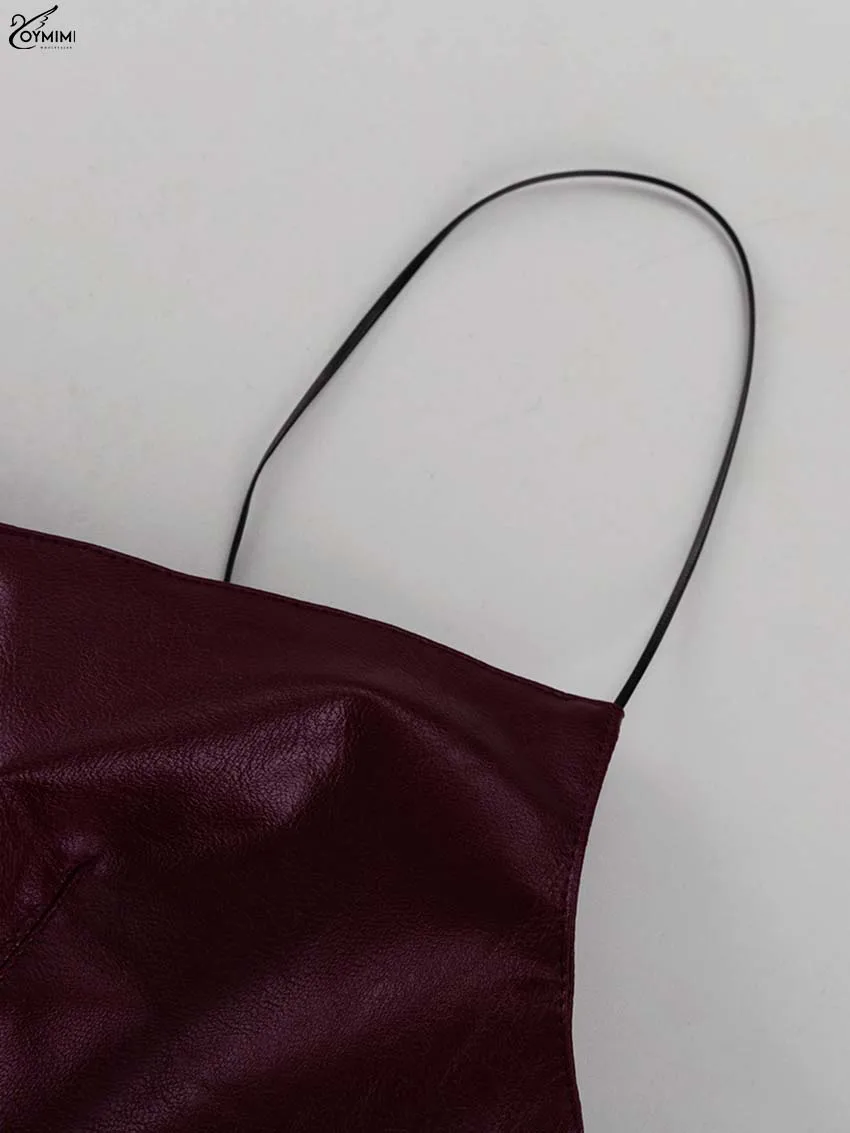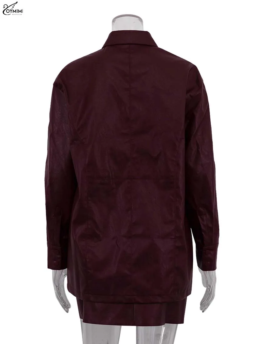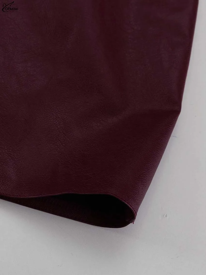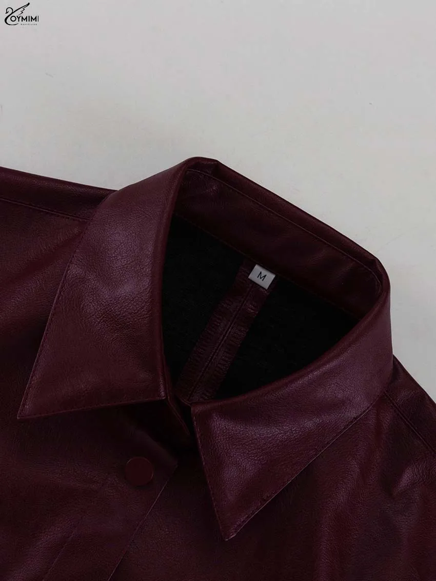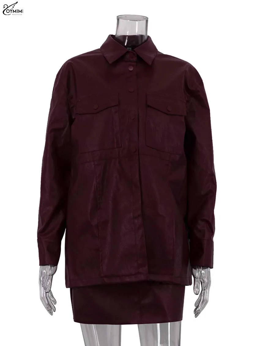 Oymimi Fashion Wine Red Pu Leather Women's Two Pieces Set Elegant Long Sleeve Button Shirts And Spaghetti Strap Mini Dress Sets