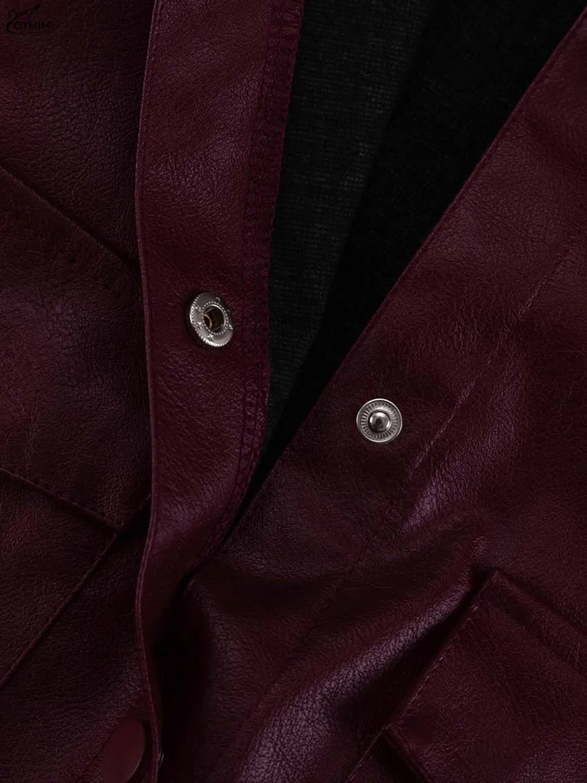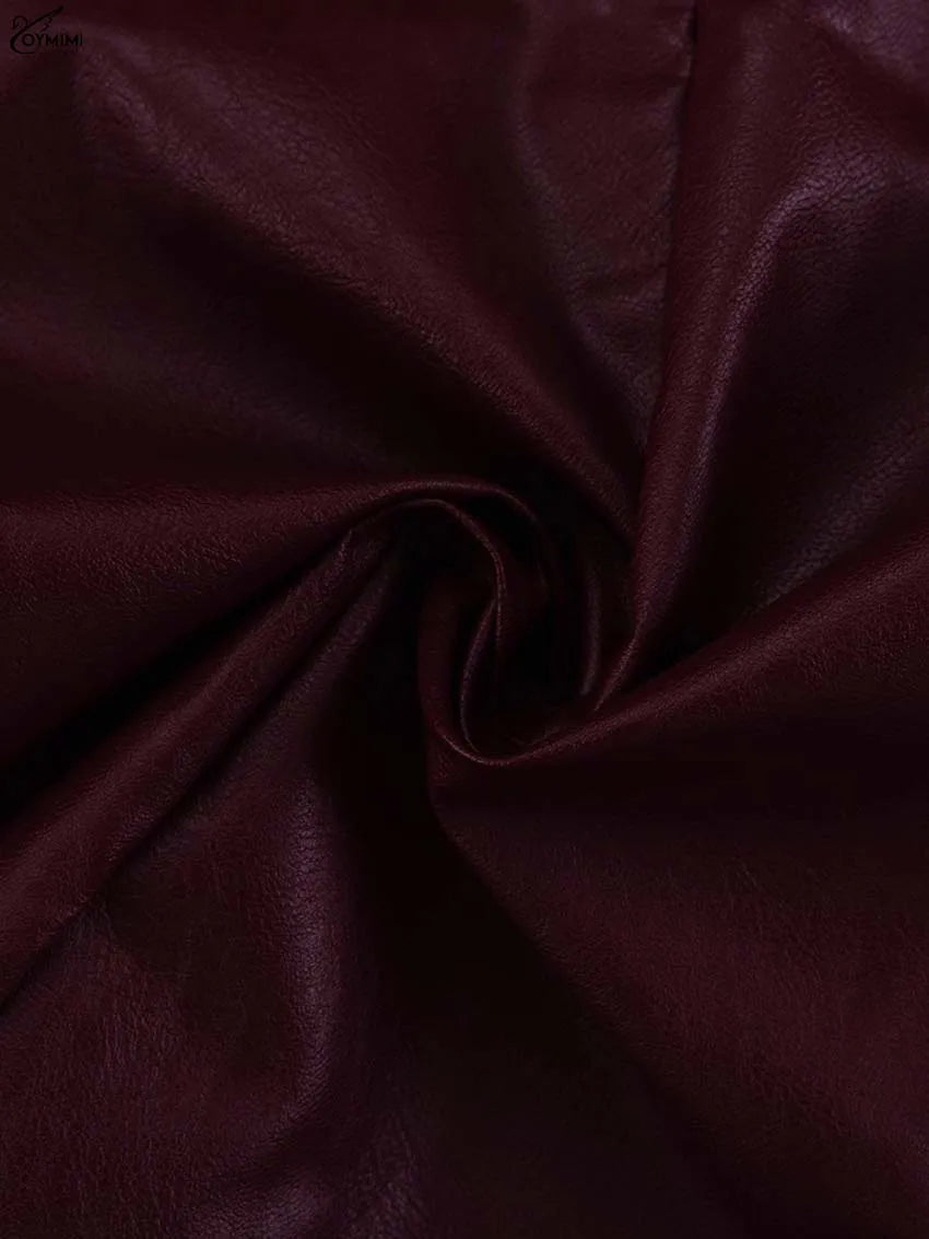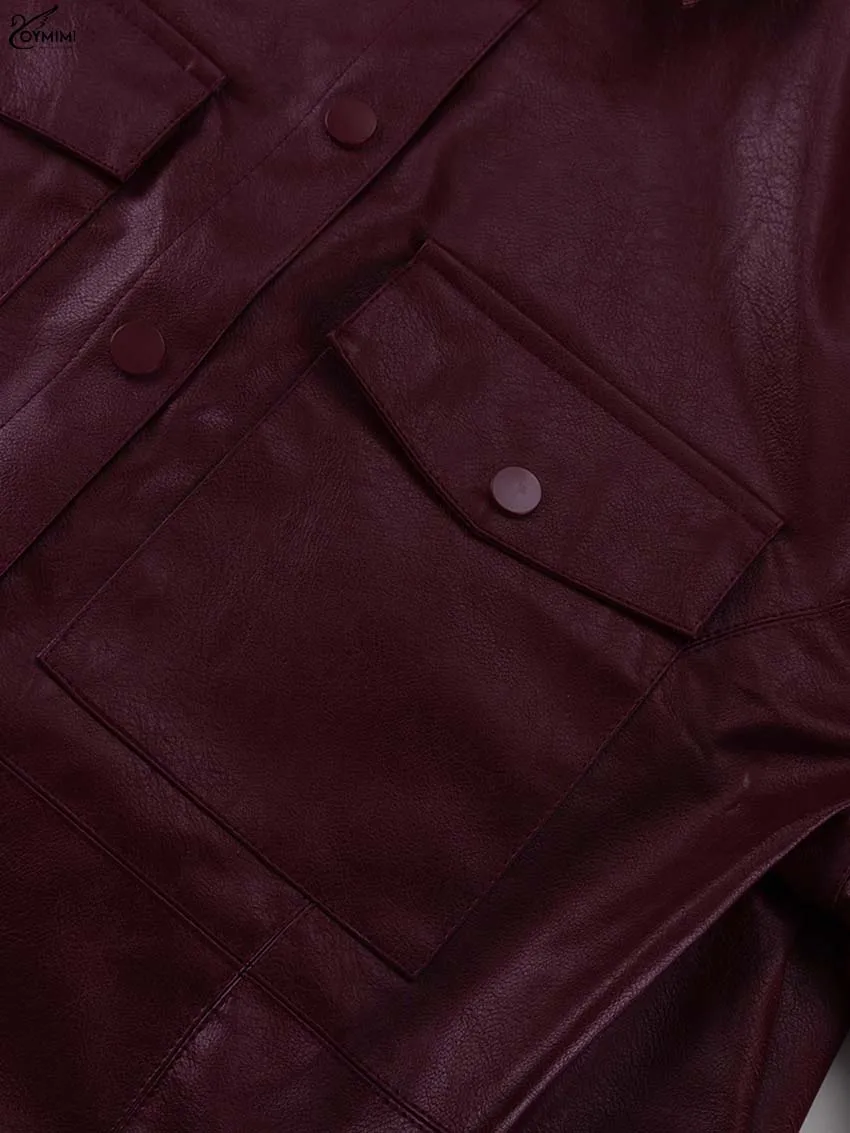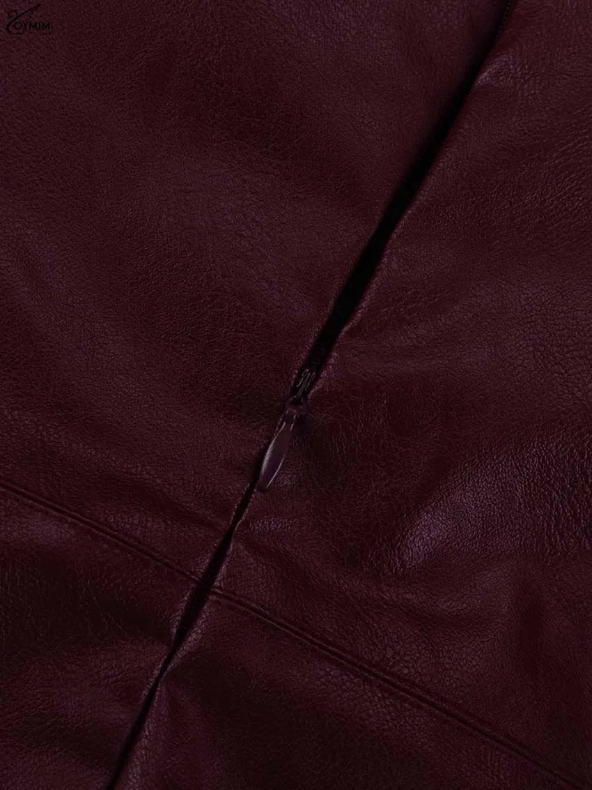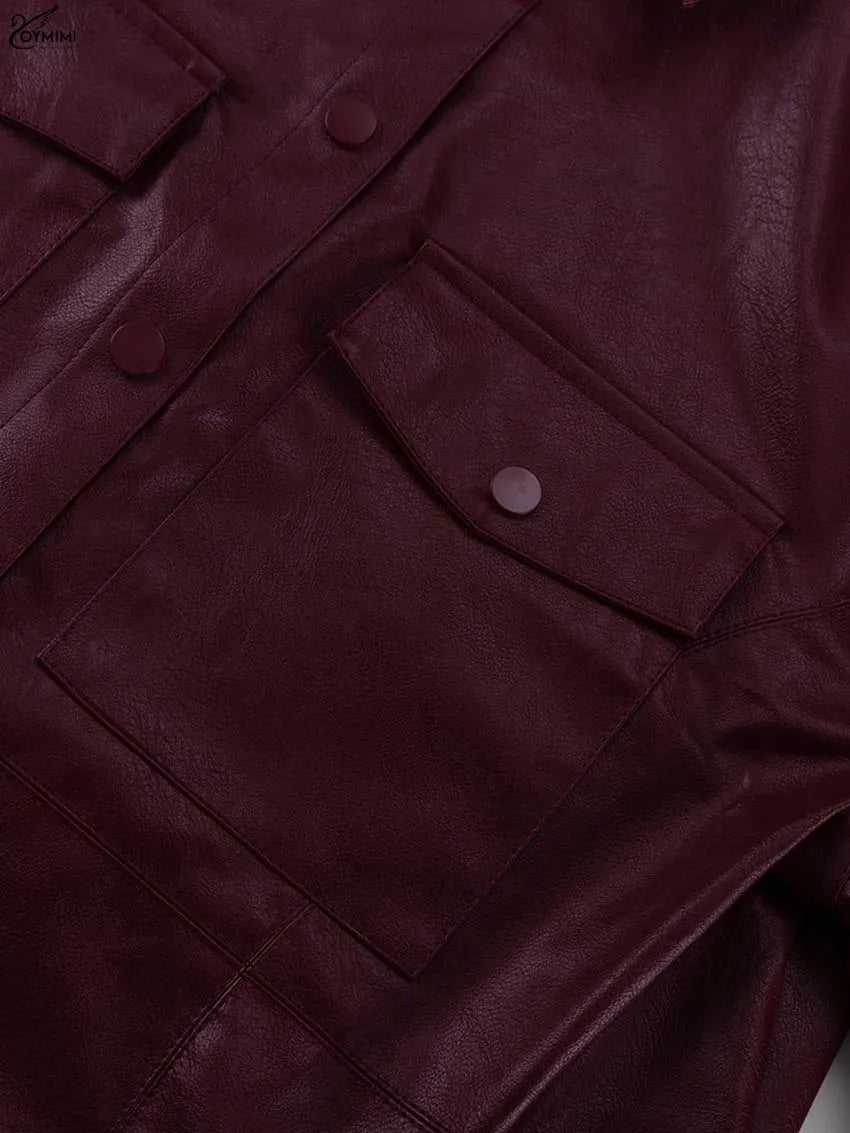 Oymimi Fashion Wine Red Pu Leather Women's Two Pieces Set Elegant Long Sleeve Button Shirts And Spaghetti Strap Mini Dress Sets