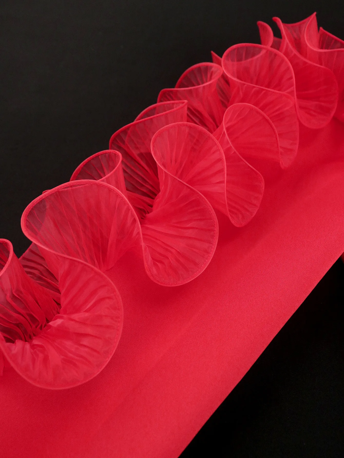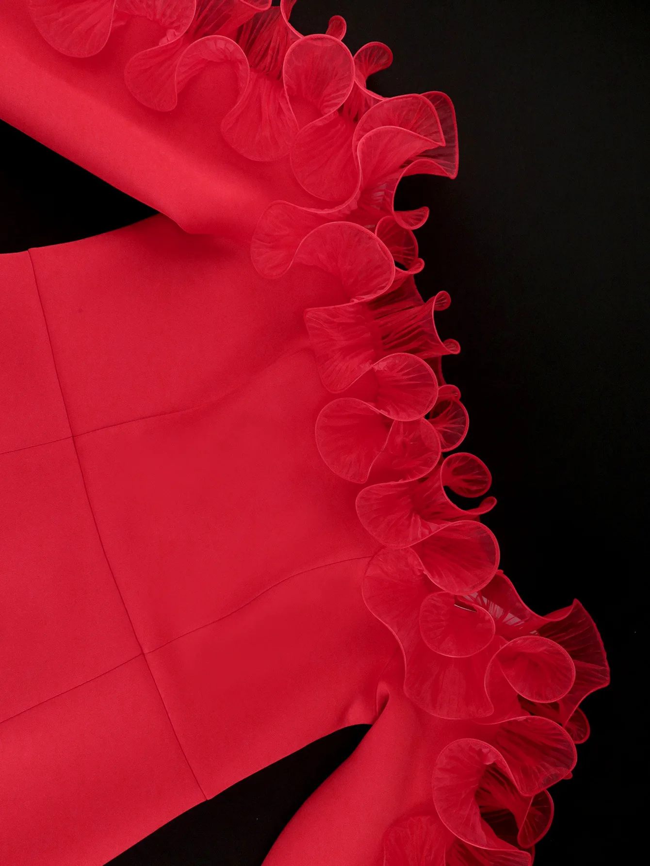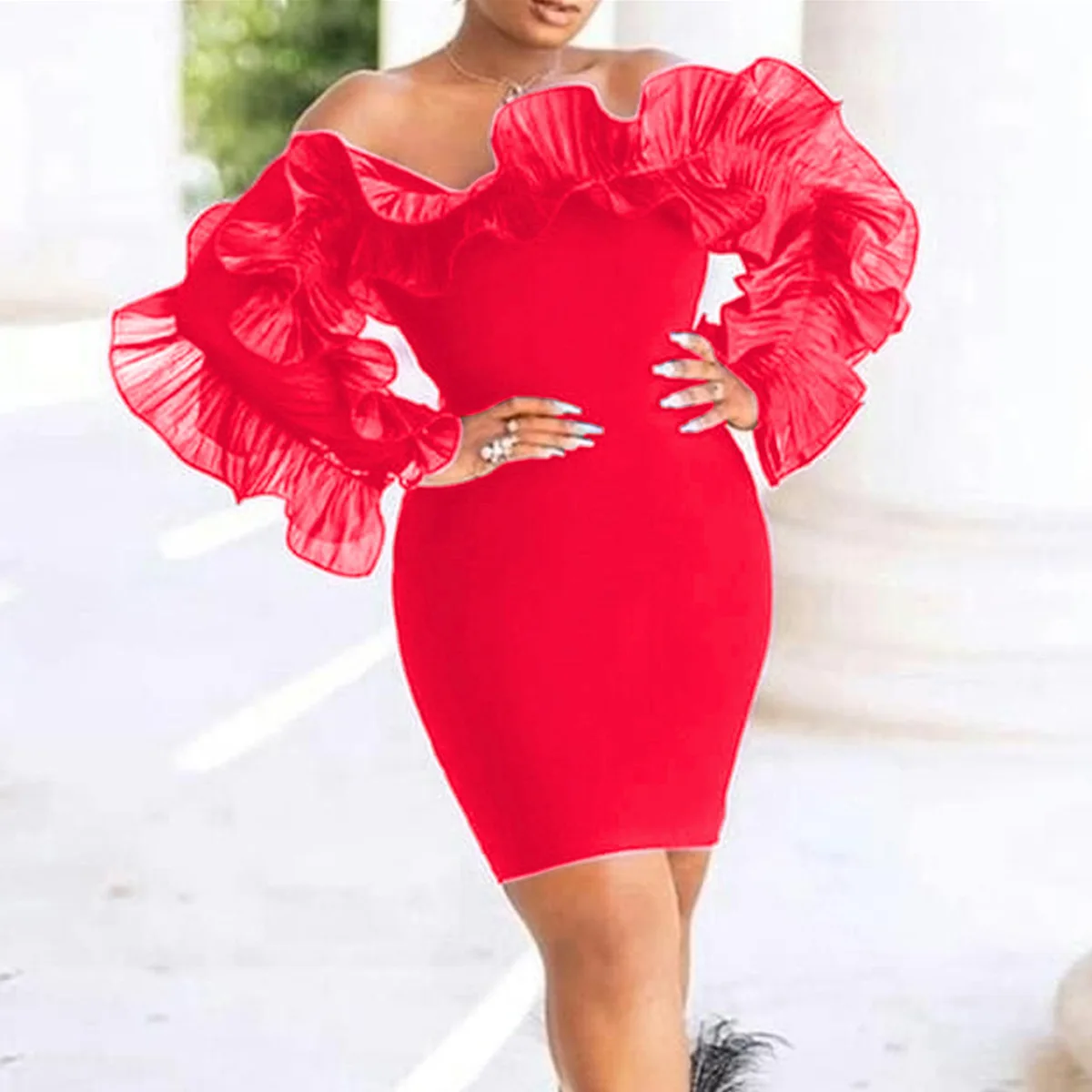 P28808 2024 Summer Off Shoulder Exaggerated Ruffle Ruched Mesh Bodycon Dress