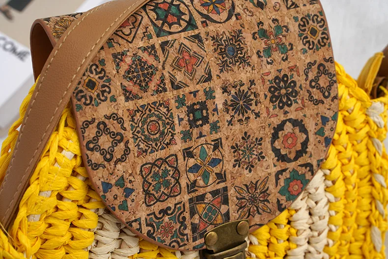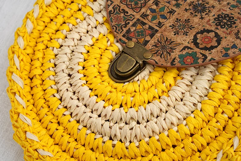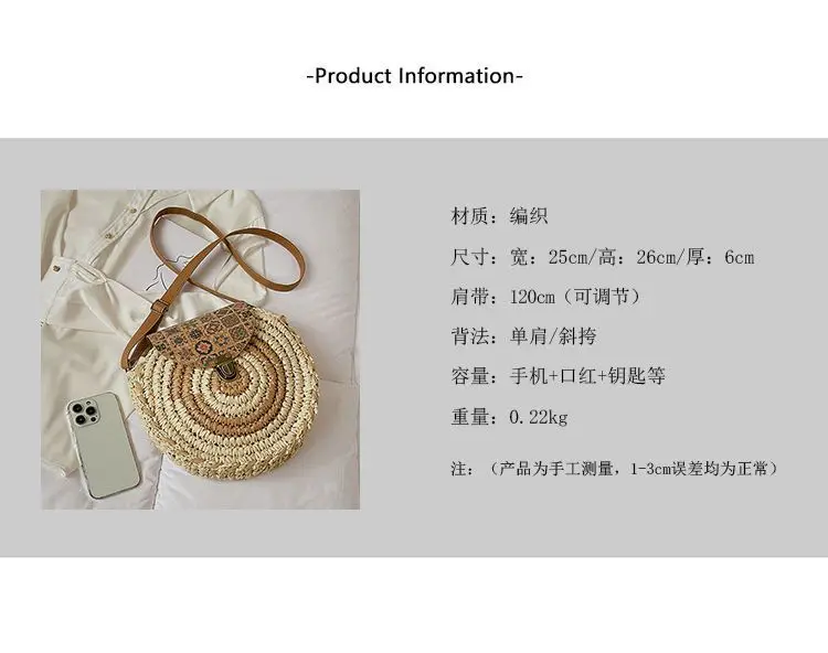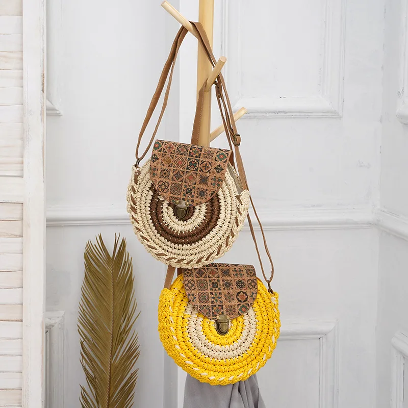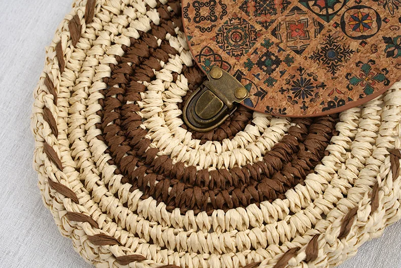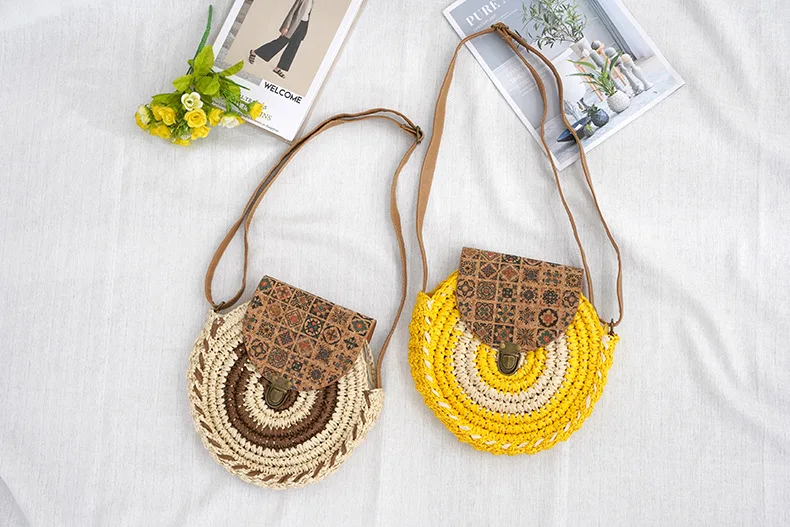 Paper Straw Woven Bag Copper Buckle Flap Round Bag Women Southeast Asian Ethnic Tote bag