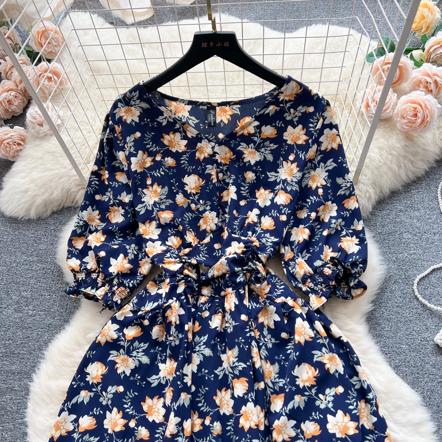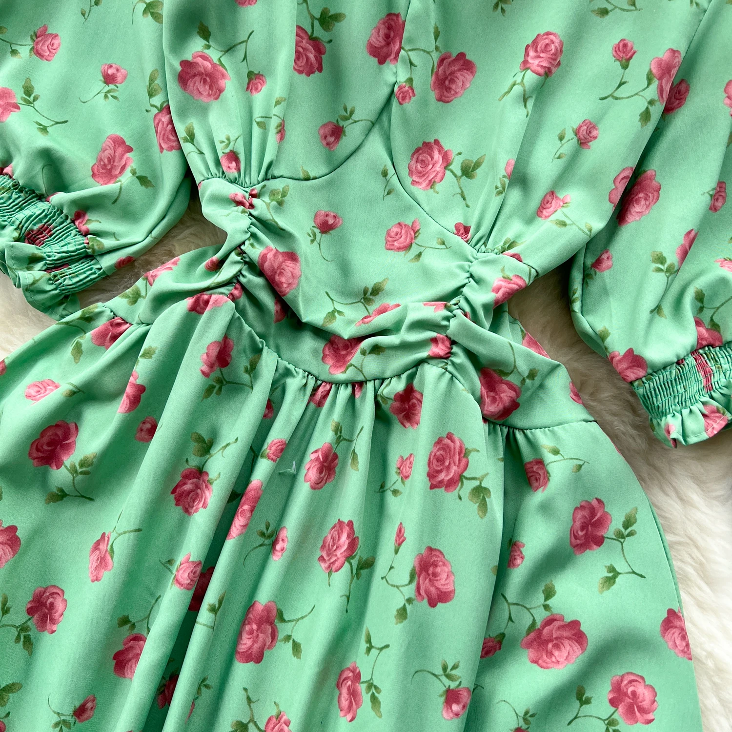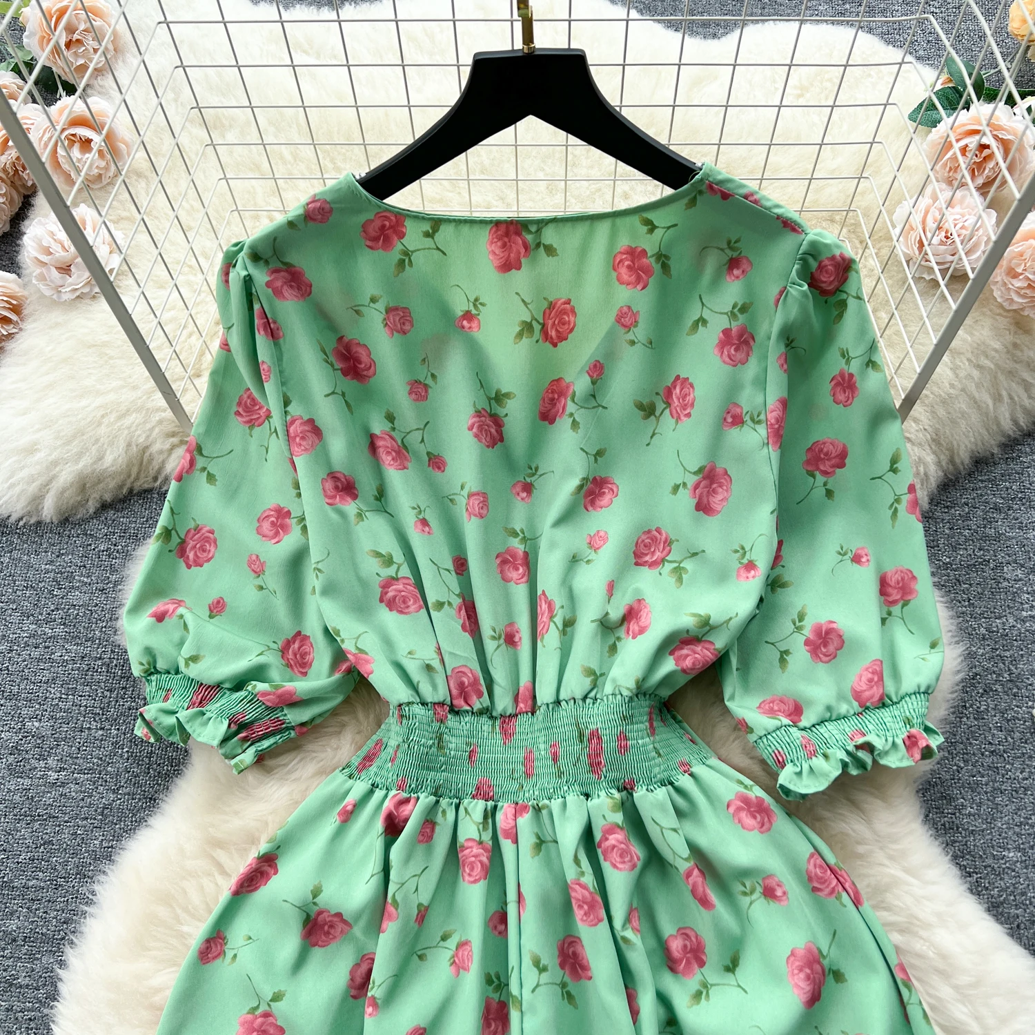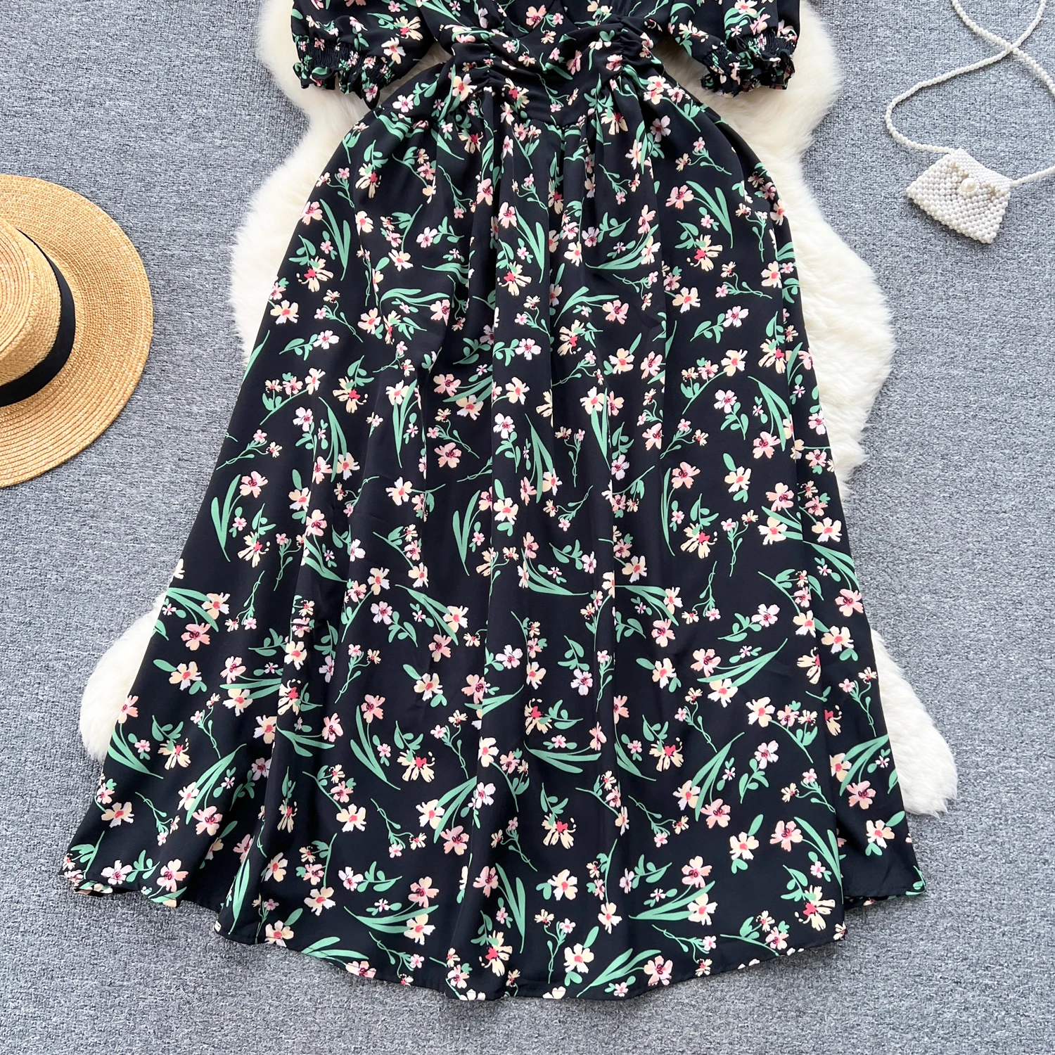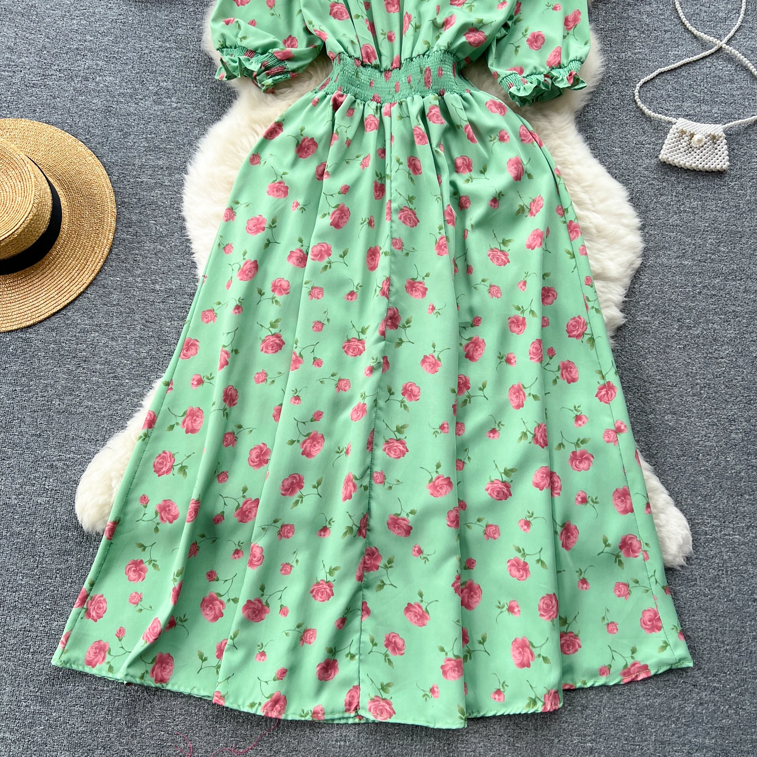 Pastoral French Fragmented Flower Bubble Sleeves Dress for Women Slim Waist Beach Vacation Dress