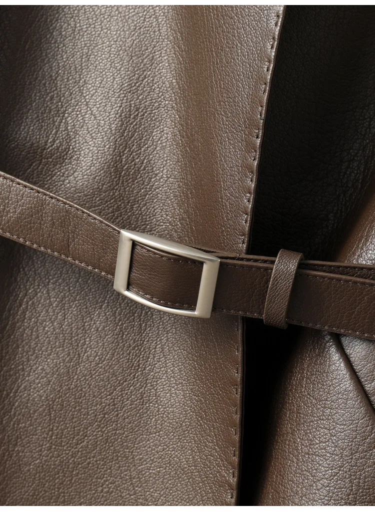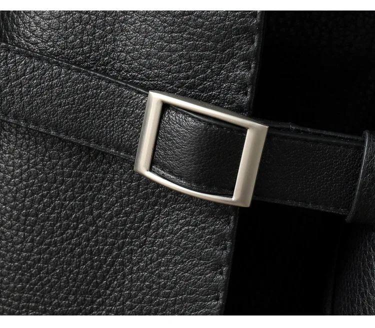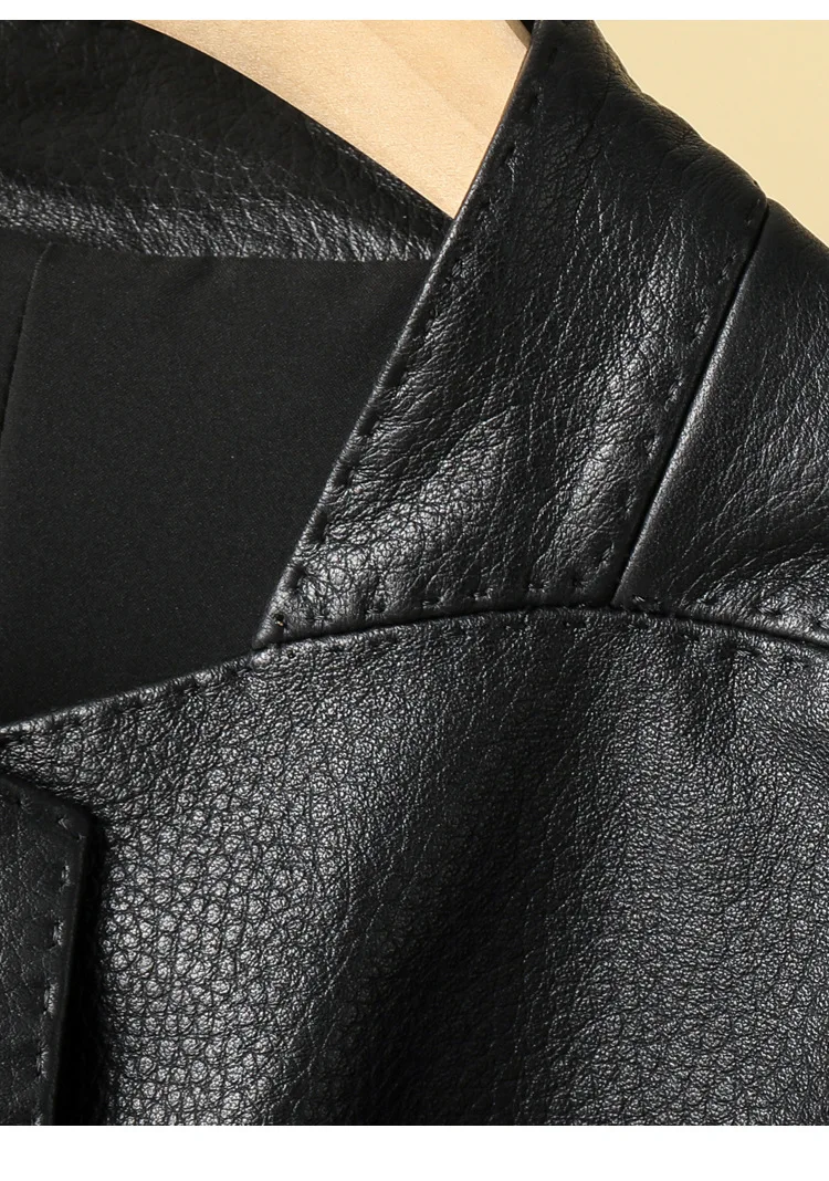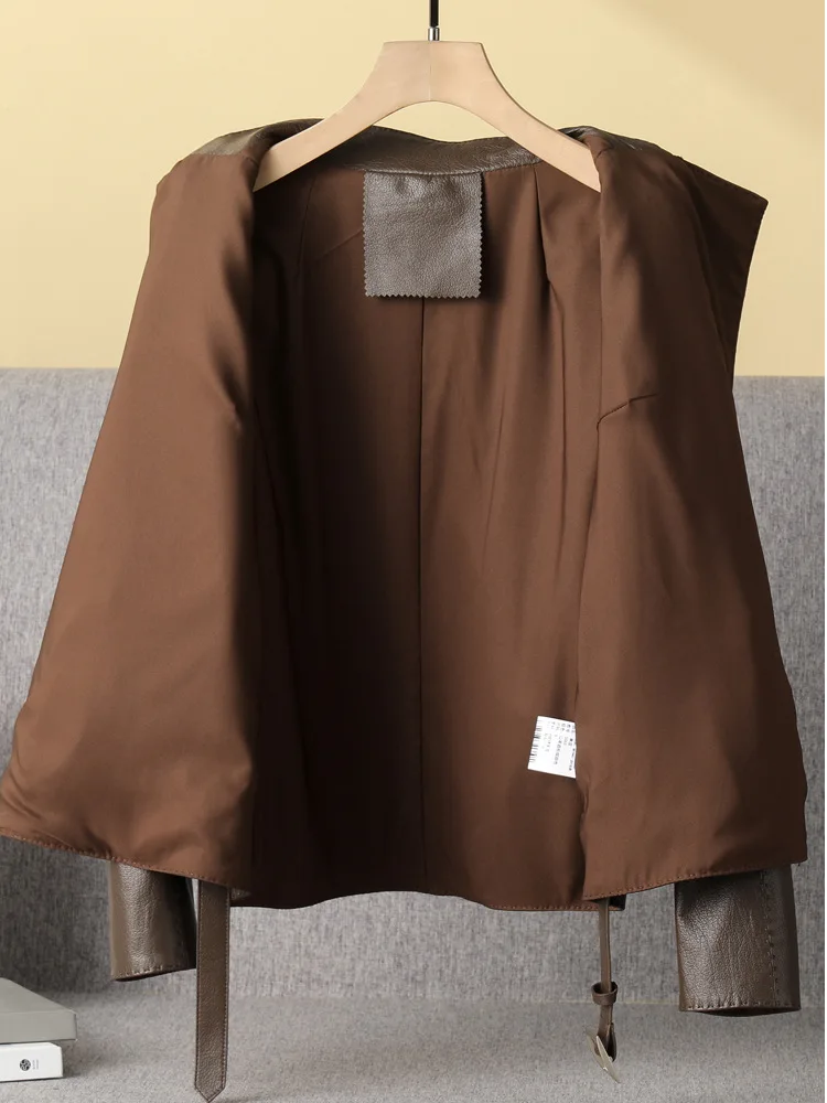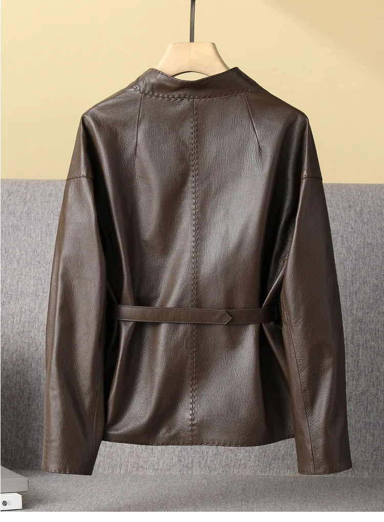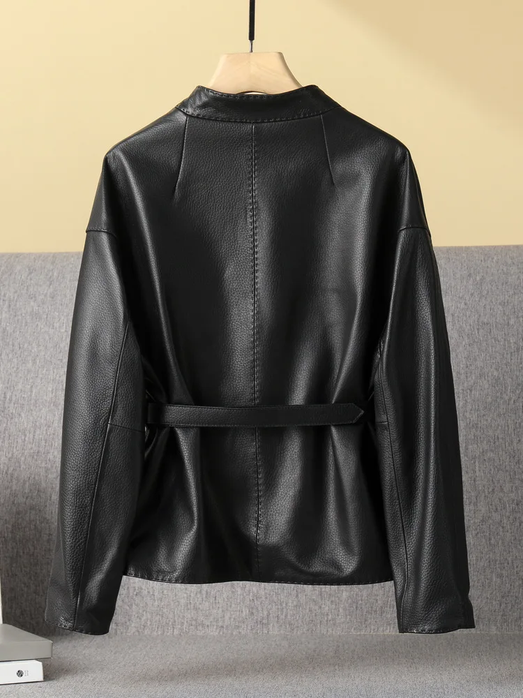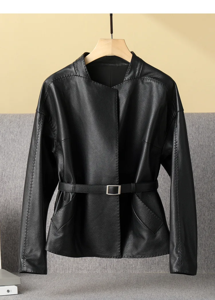 2023 New Sheepskin Lychee Pattern Genuine Leather Clothes Female Short Round Neck Collarless Girdle Belt Leather Jacket Coat Short