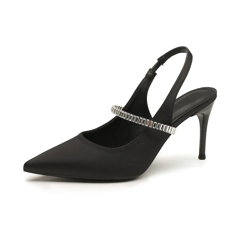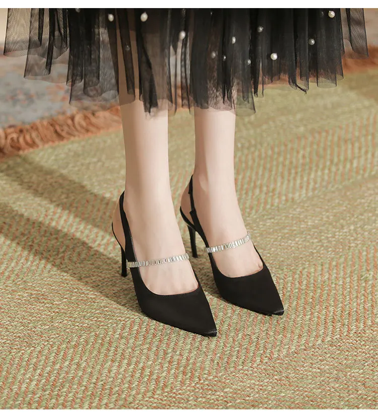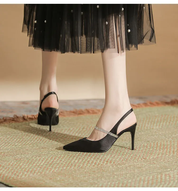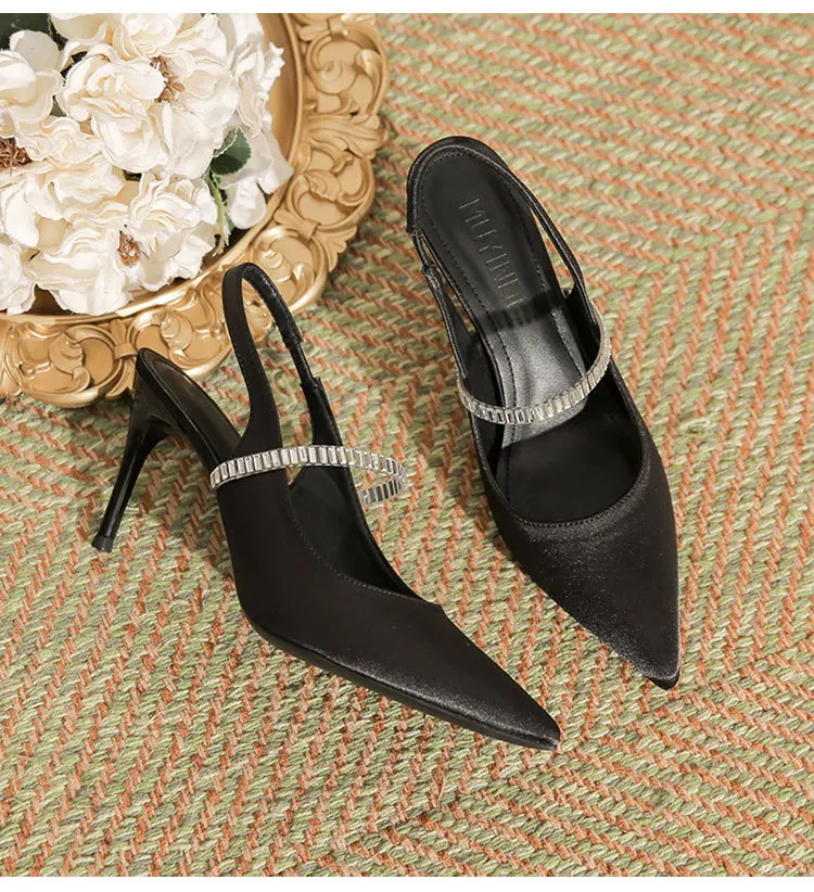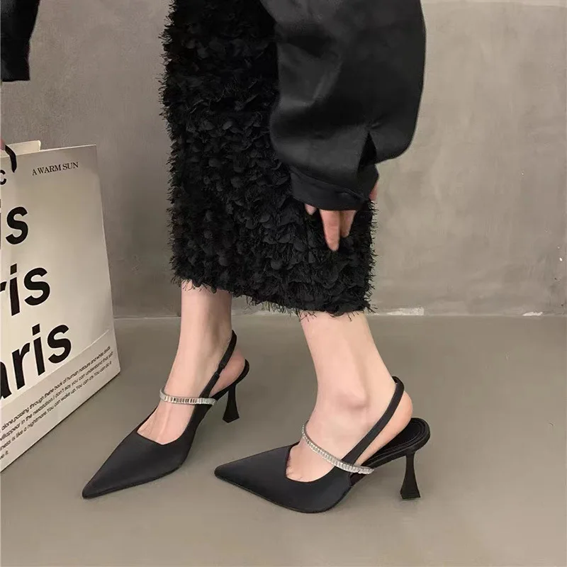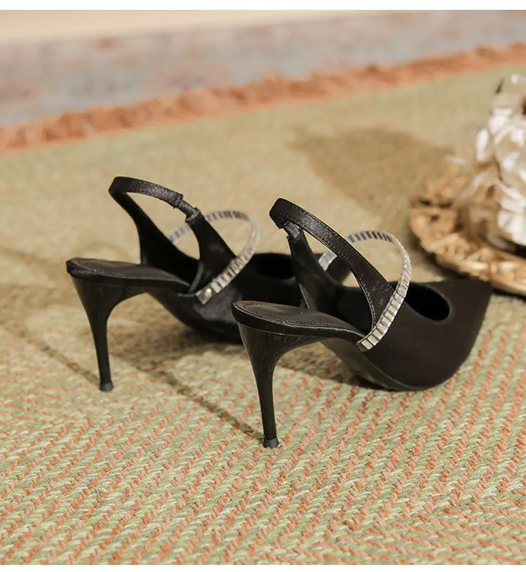 PDEP 2023 High heels sandals for ladies female black closed point toe sling back satin rhinestone stiletto heels shoes
