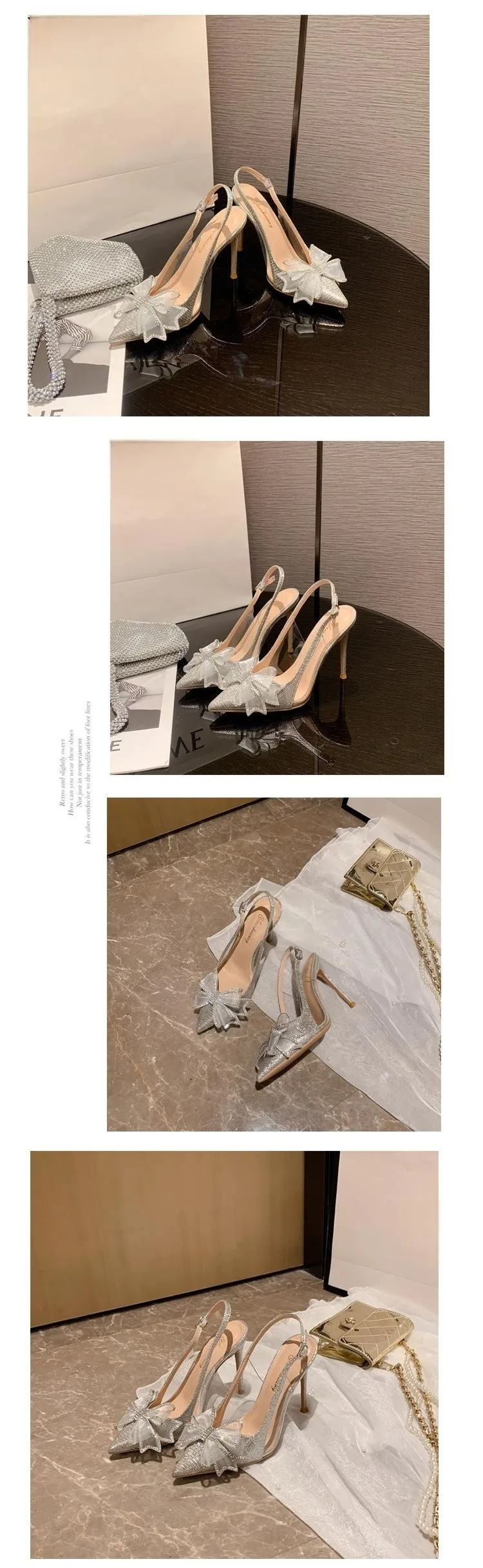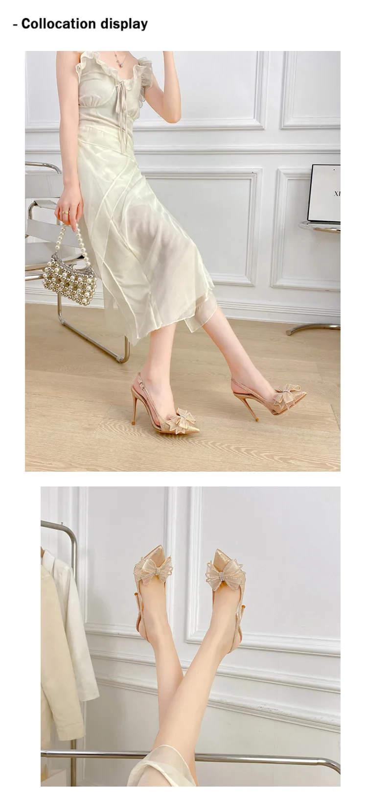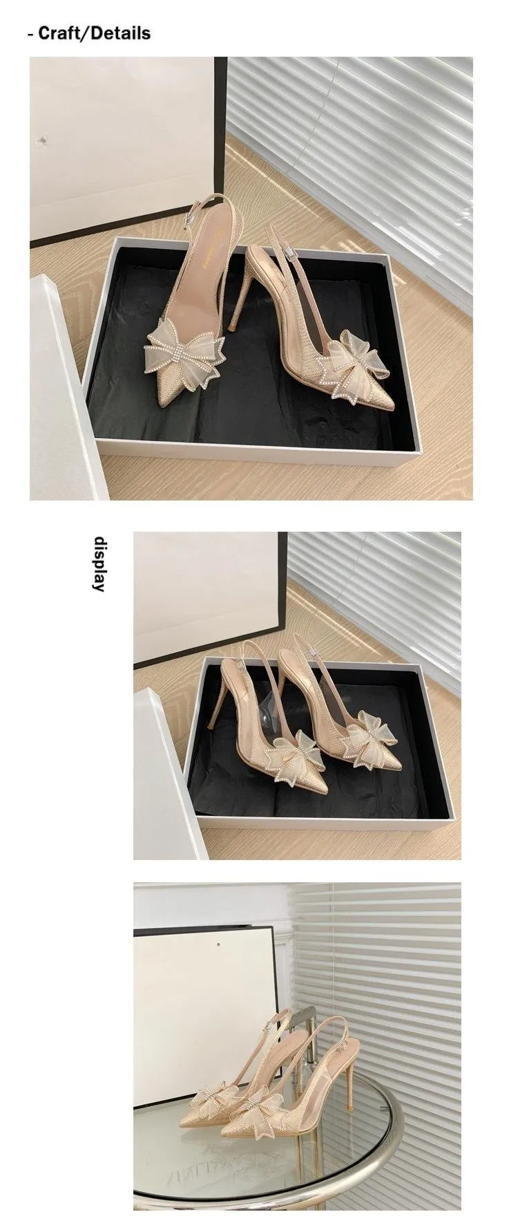 PDEP New stiletto point toe elegant bridal wedding shoes sling back rhinestone bow sexy ladies high heels shoes 2023