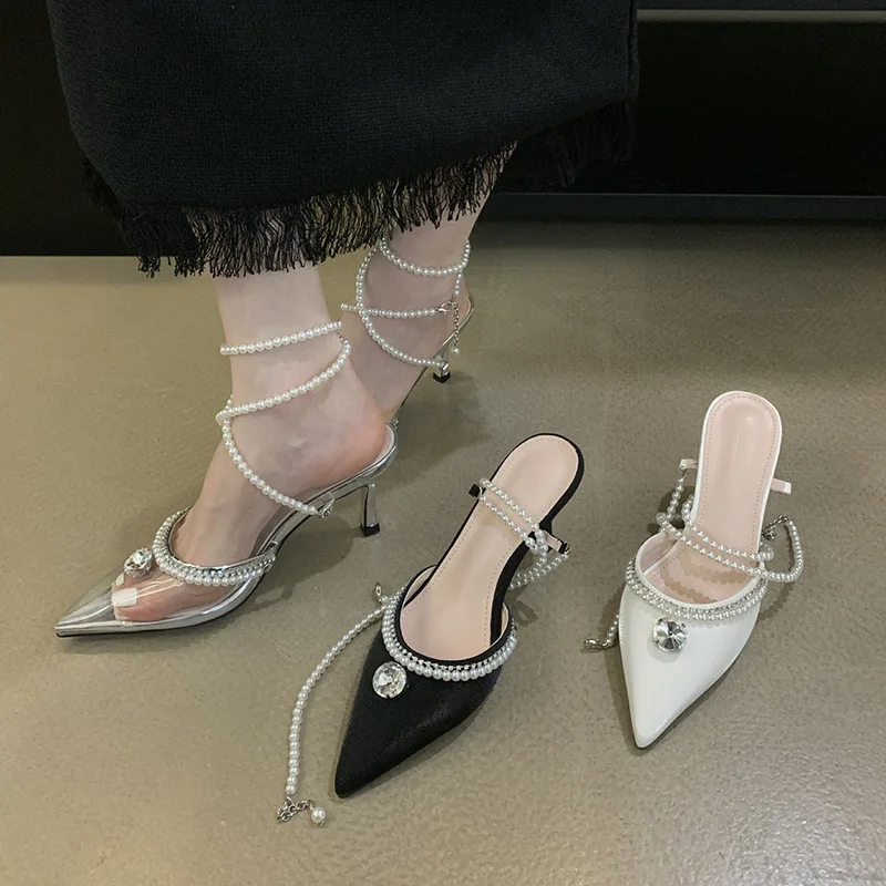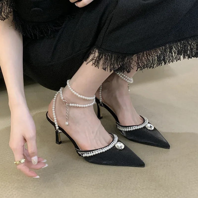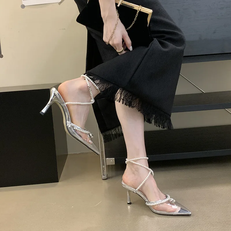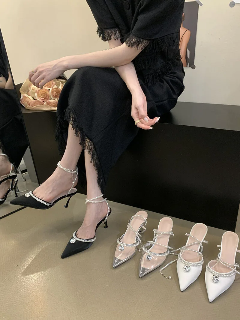 PDEP point toe Sandals 2023 summer new ladies stiletto high heel shoes for women rhinestones Korean pearl court pumps low heel