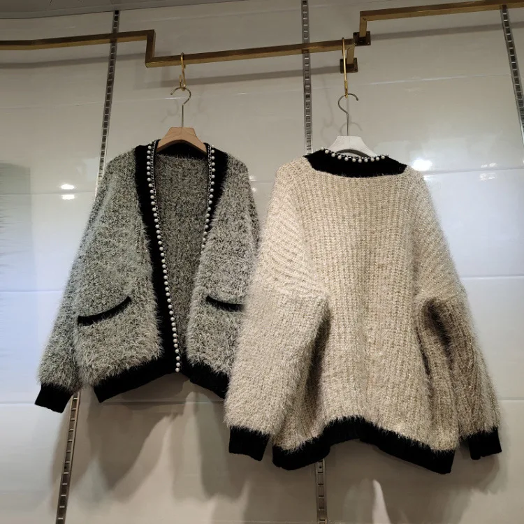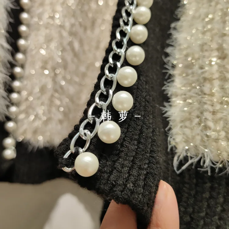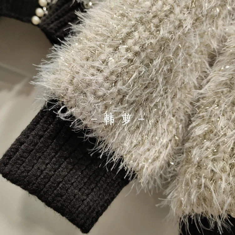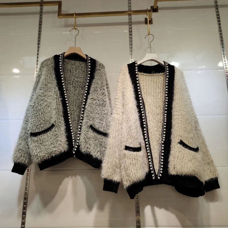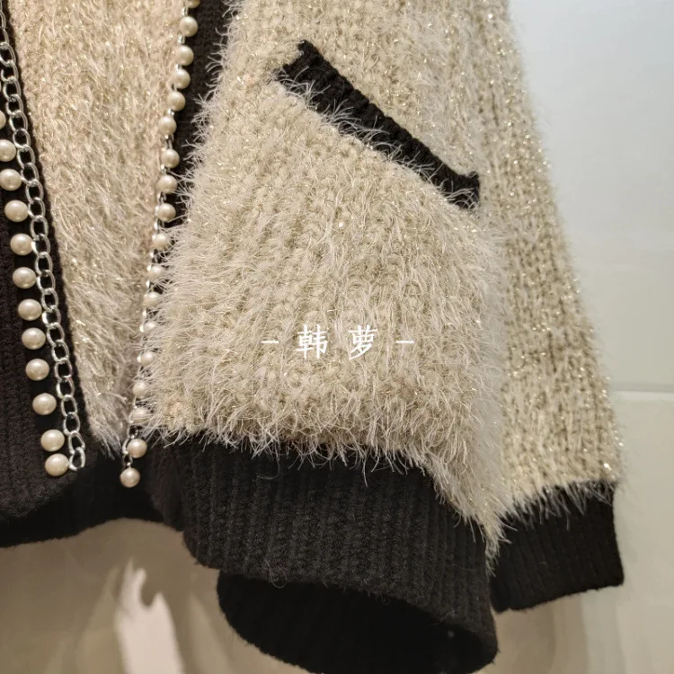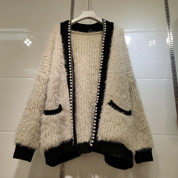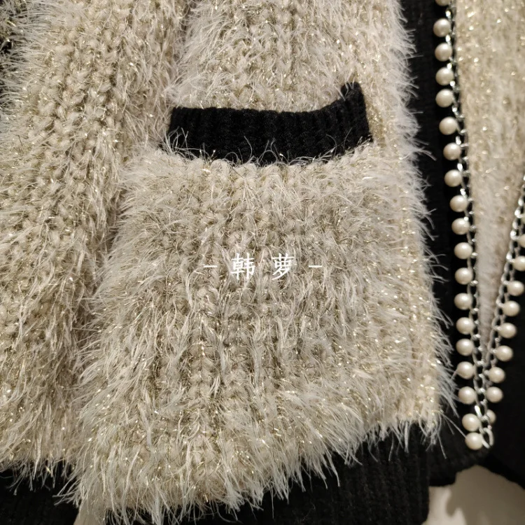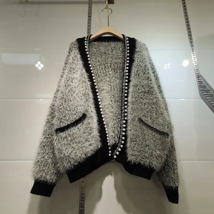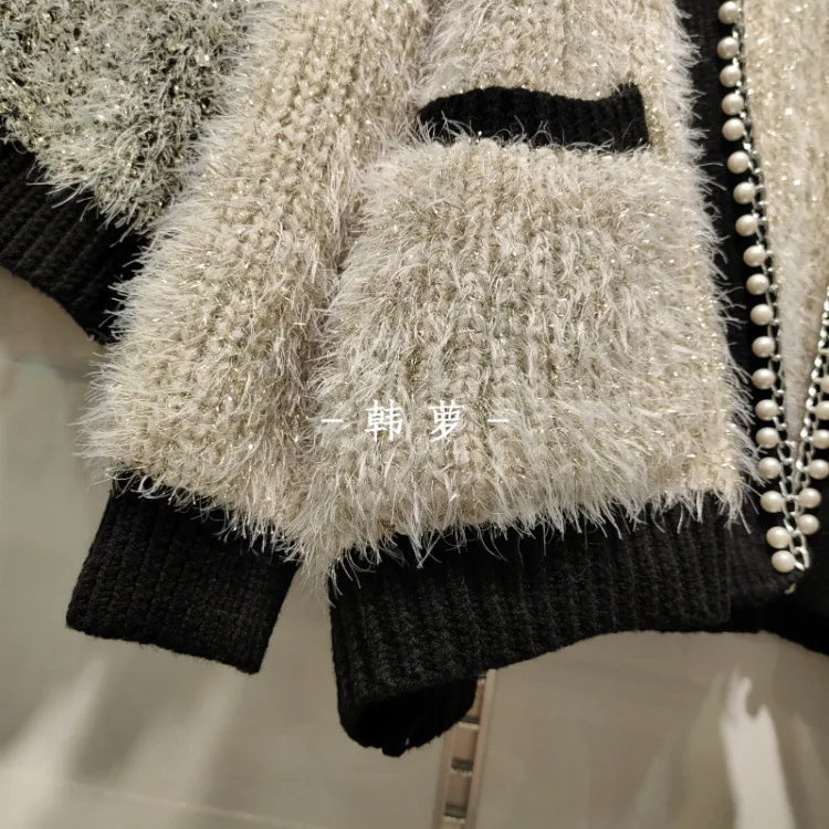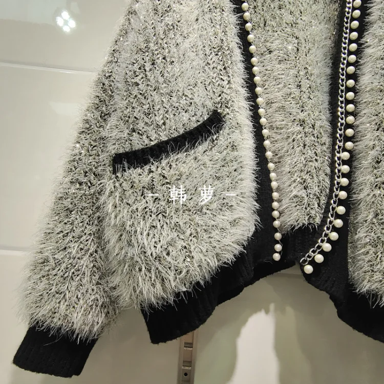 PDEP Women's Bright Silk Long mohair sweater Coat Autumn 2023 New long beading sequined Knitted Cardigan sweater for women