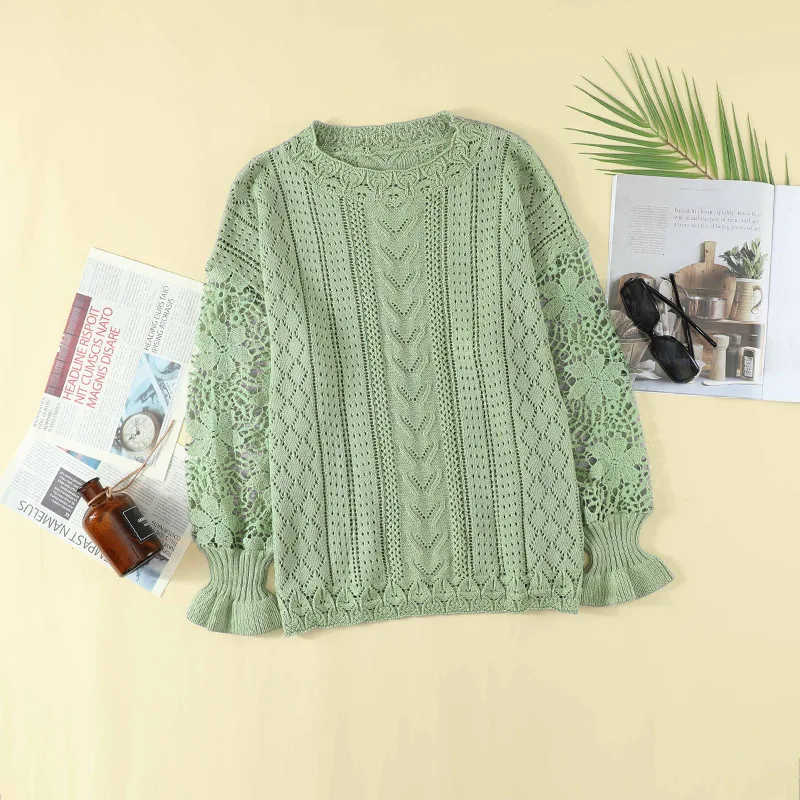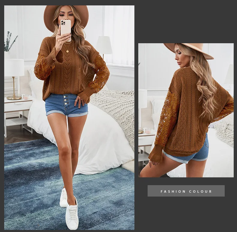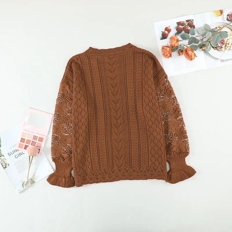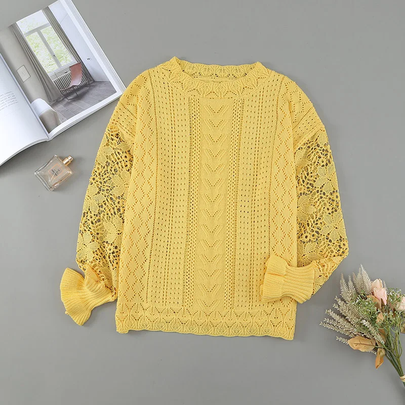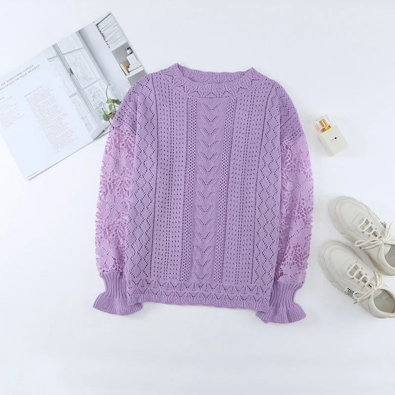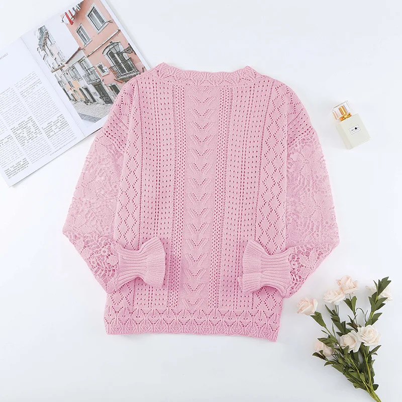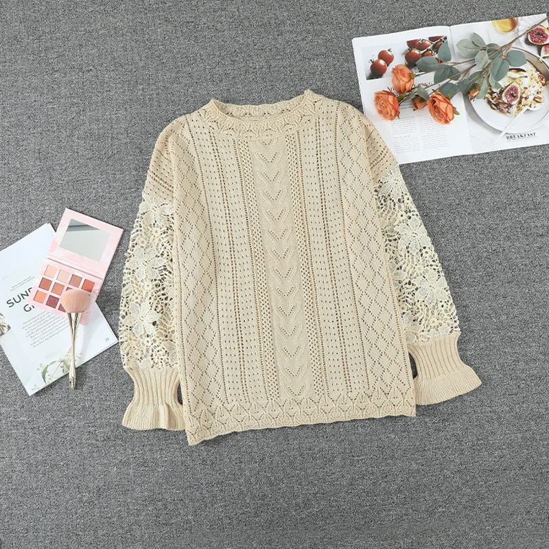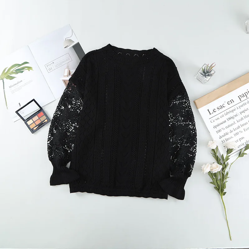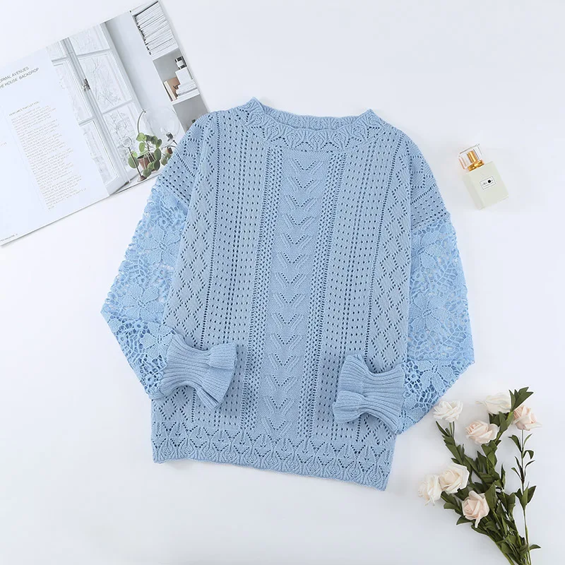 PDEP women's knitted sweater autumn and winter new long sleeved sexy lace top knitted pullover crochet sweater Embroidery