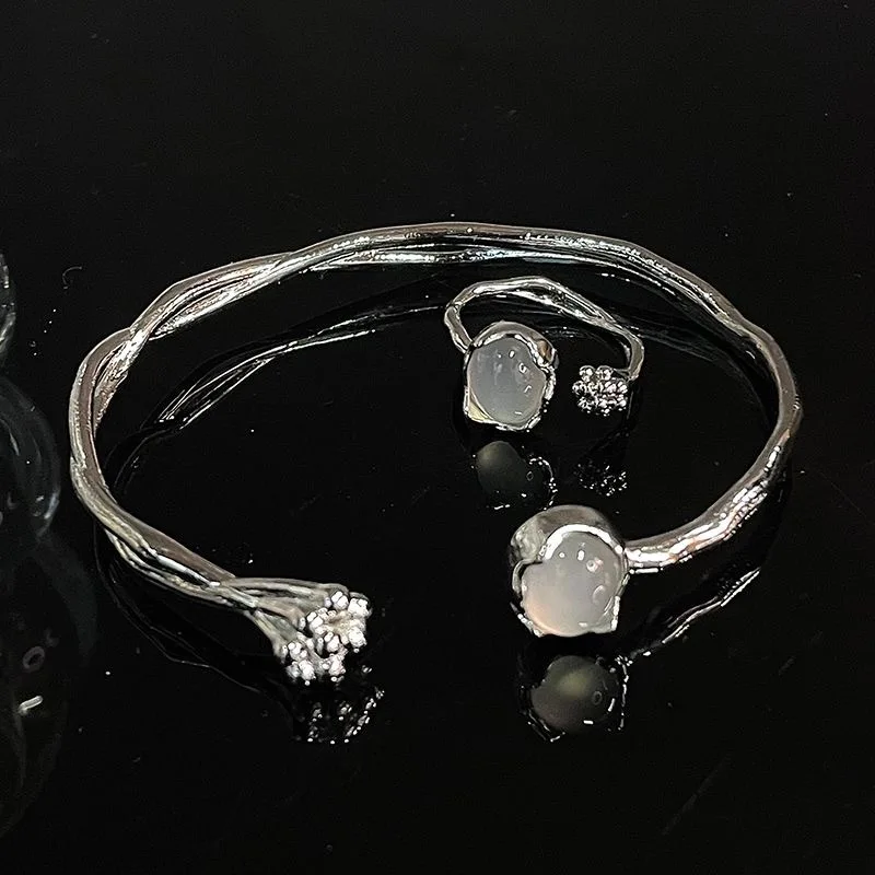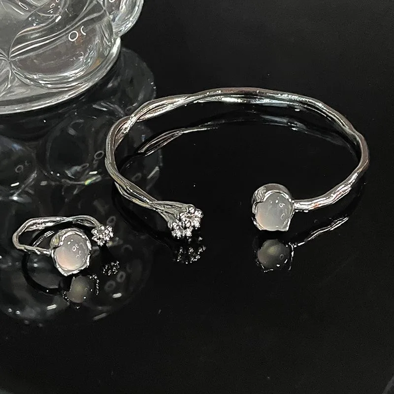 Personalised Bracelet Moonlight Stone Women Fashion Ring Opening French Gemstone Metal Bangle Ring Jewelry