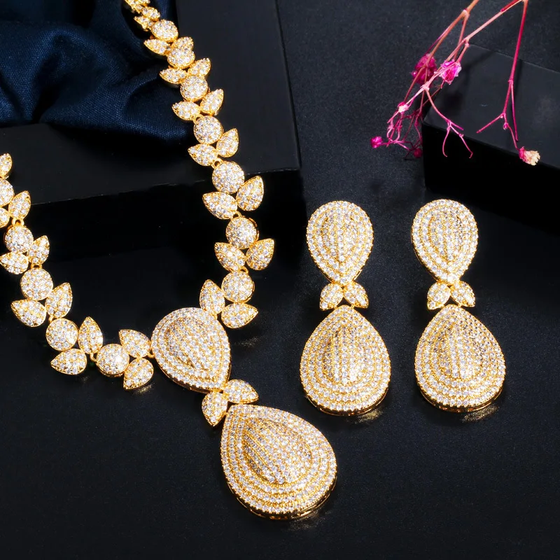 Personality full diamond gold jewelry sets women wedding luxury dangle drop earrings pendant necklace banquet Dubai bridal set