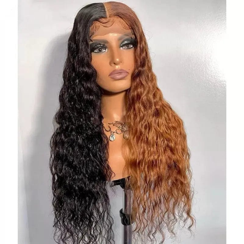 Personality Long Water Wave Wig Long Part Half Natural Black Half Medium Auburn Lace Front Wig