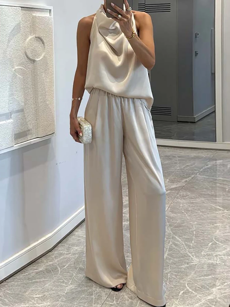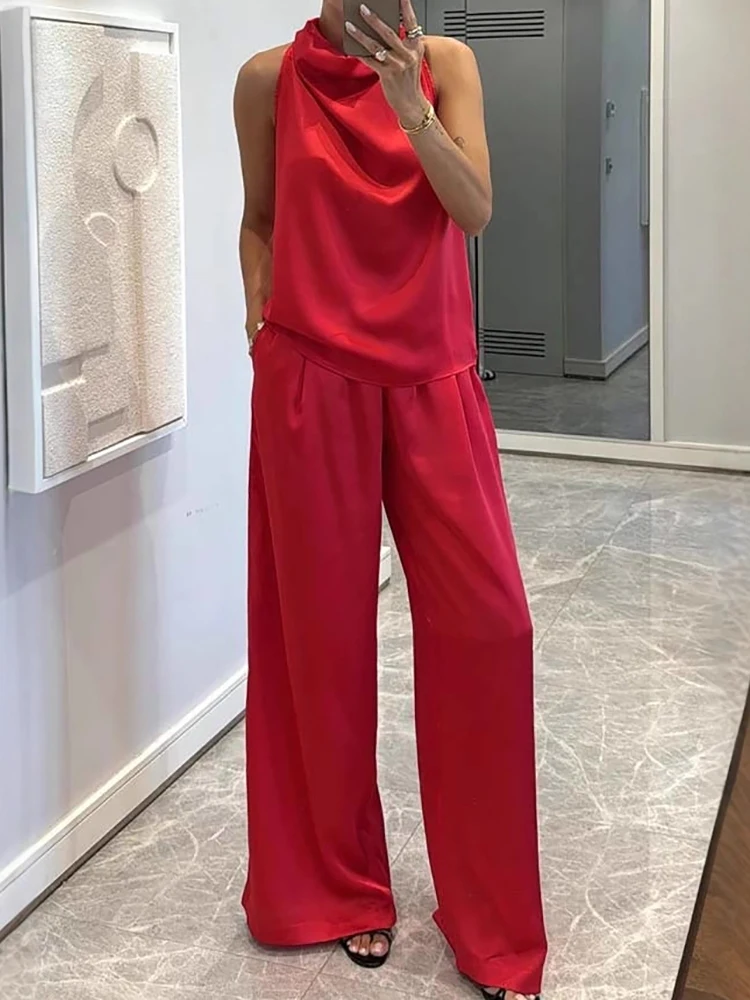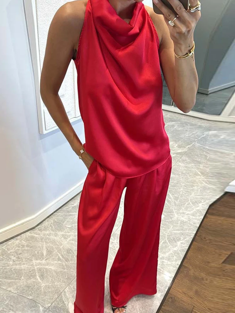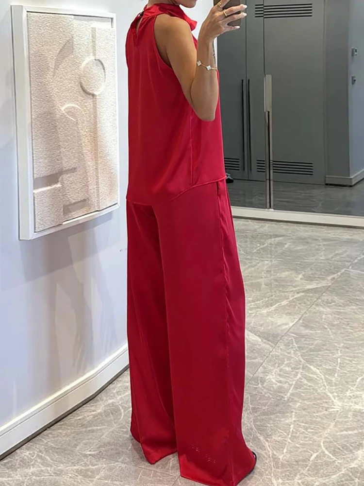 Pile Collar Sleeveless Top Wide Leg Pants 2CPS Sets, Women Summer Loose Elastic Waist Chic Outfit, Solid Patchwork Ladies Suits