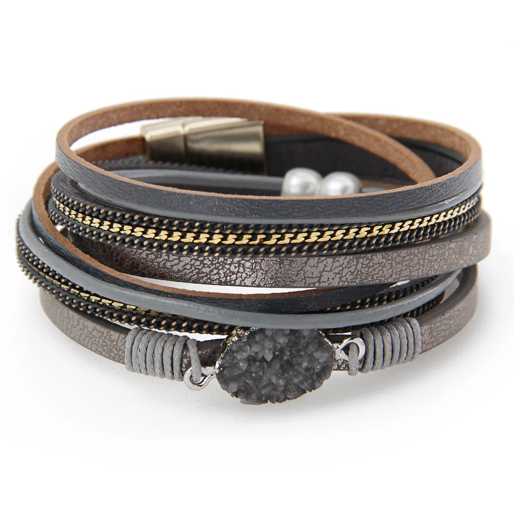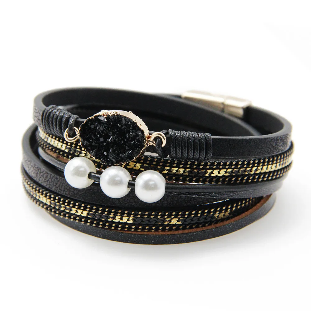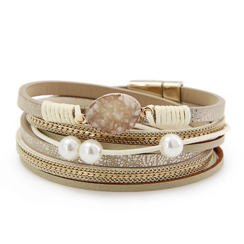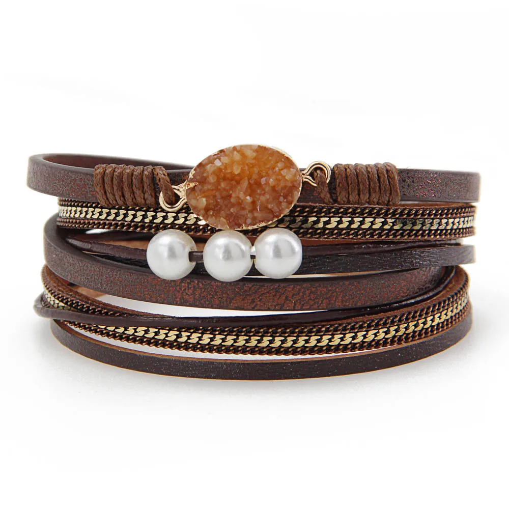 Pink Girl Multilayer Resin Beads Chain Link Brown Fashion Cuff Bangle Pearl Natural stone Leather Bracelets Women Female Jewelry