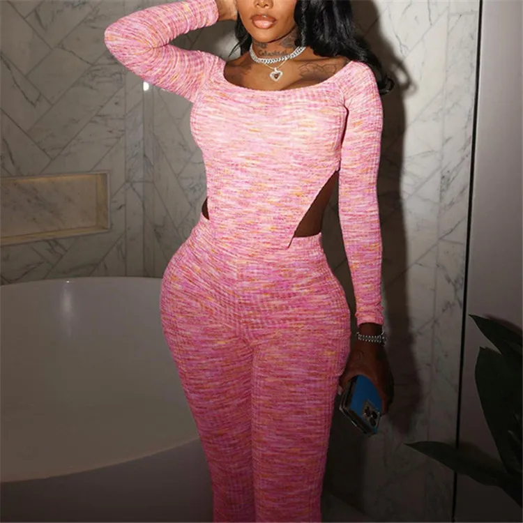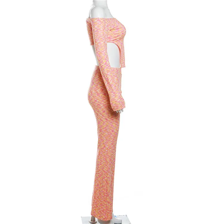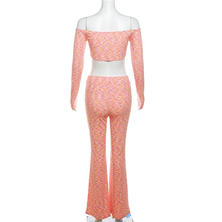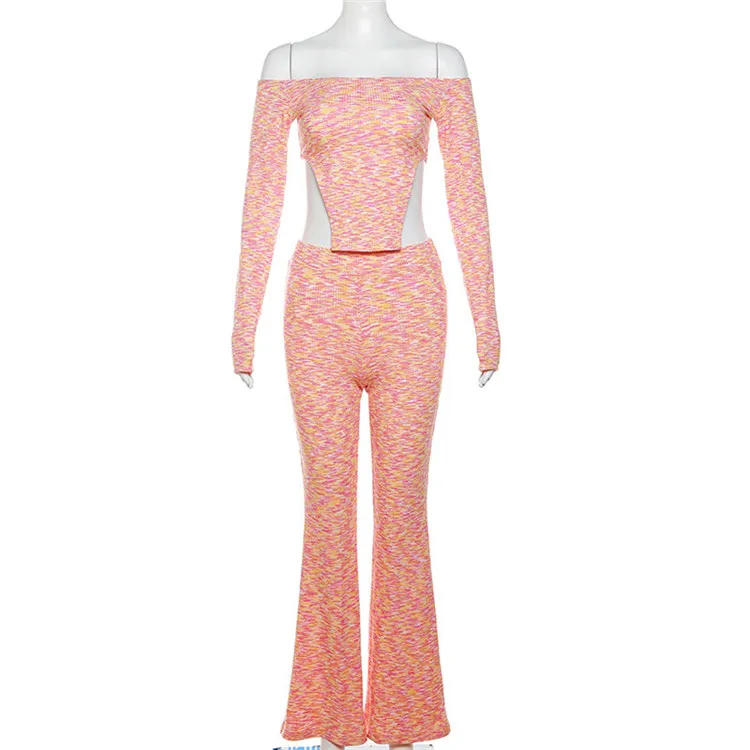 Pink Long Sleeve Pants 2 Two Piece Set casual Party For Women Fashion Bodycon High Waist Off Shoulder Pants Sets