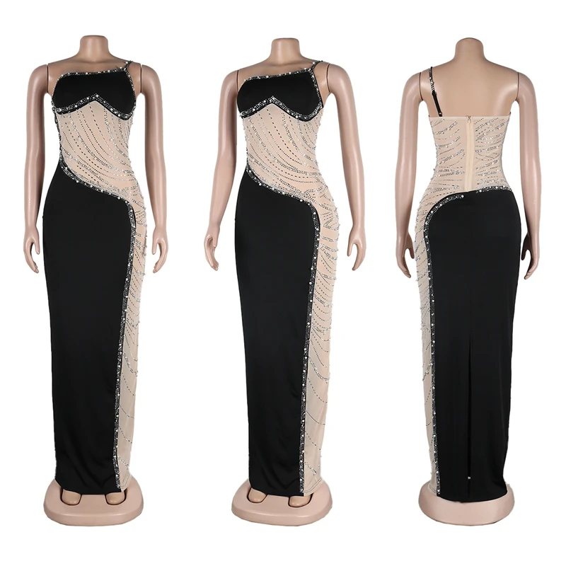 pink one shoulder rhinestone mesh patchwork long tail ball gown dinner wedding evening dresses for ladies women long ball gown