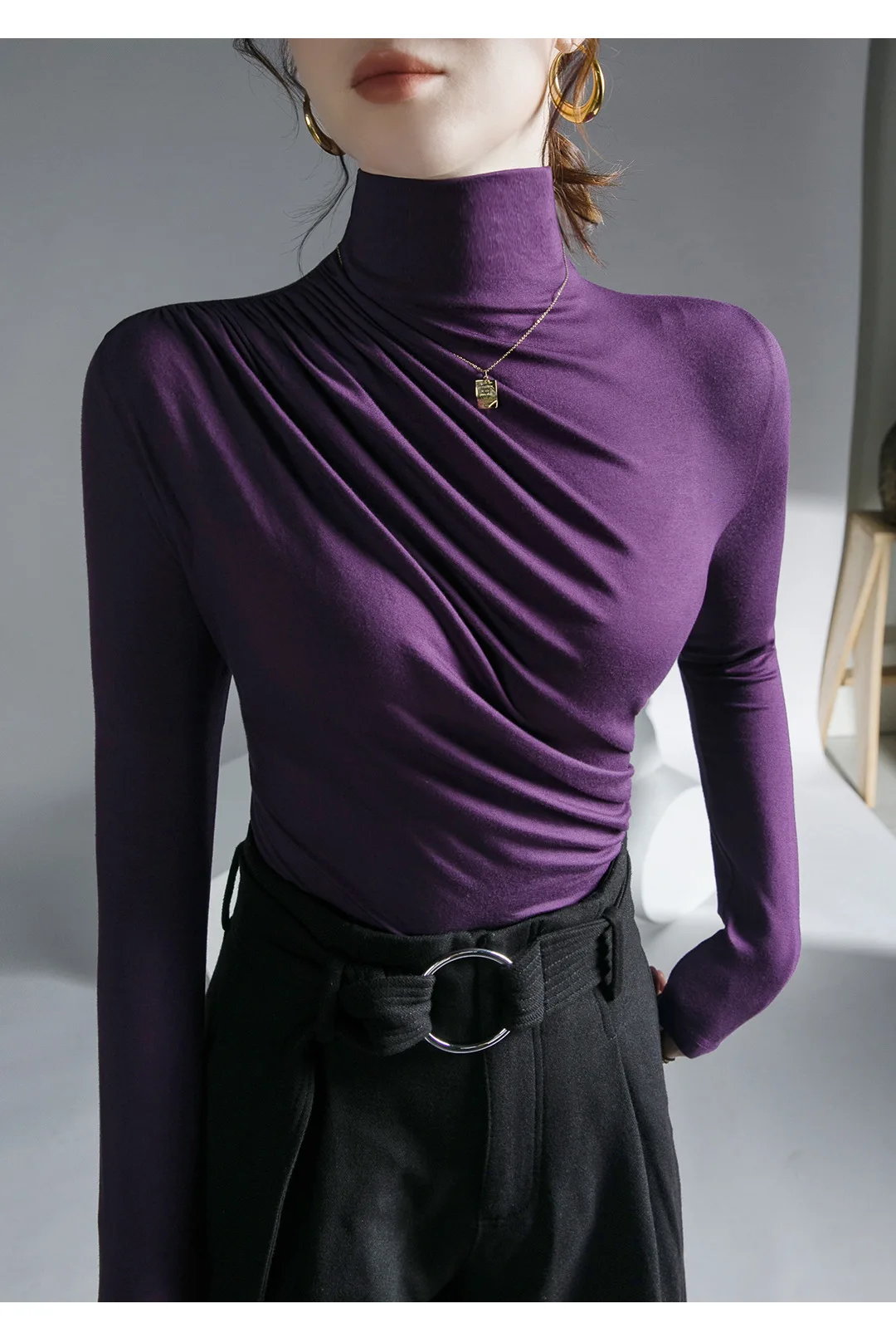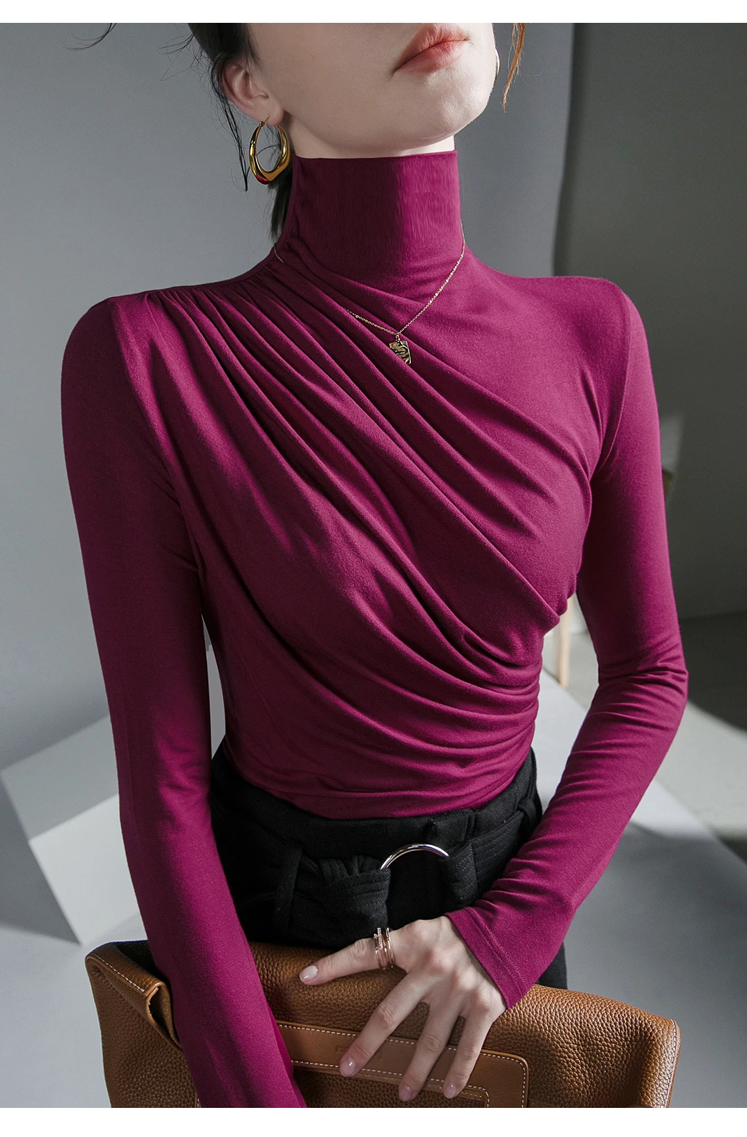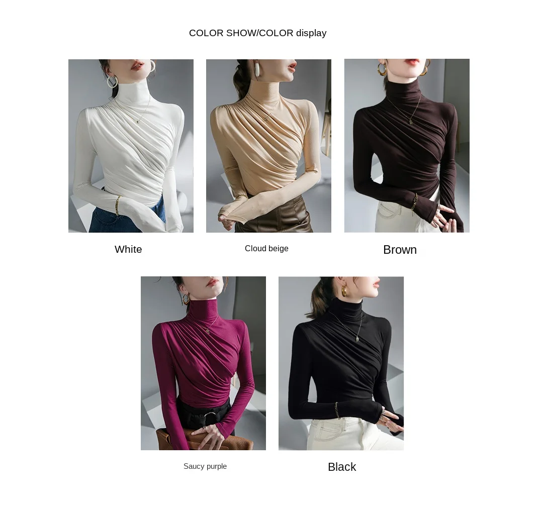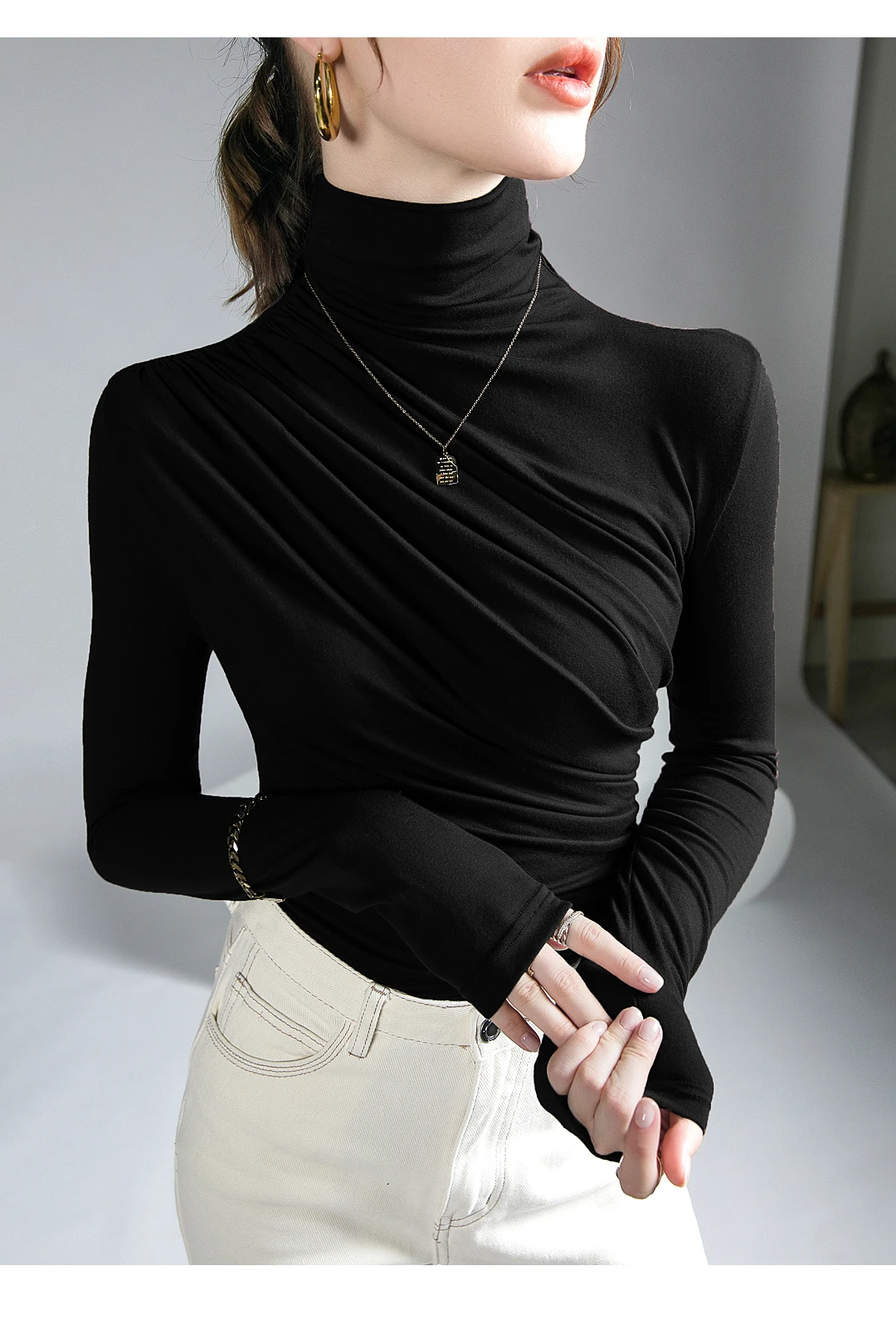Pleated T-shirt Stretch Autumn and Winter Turtleneck Bottoming Pullover Women's Casual White Basic Top Shirts Harajuku Gothic
