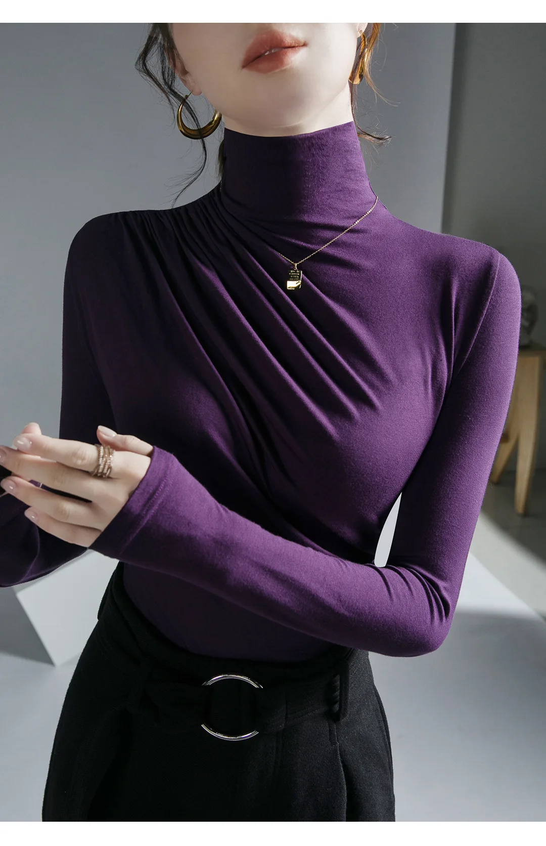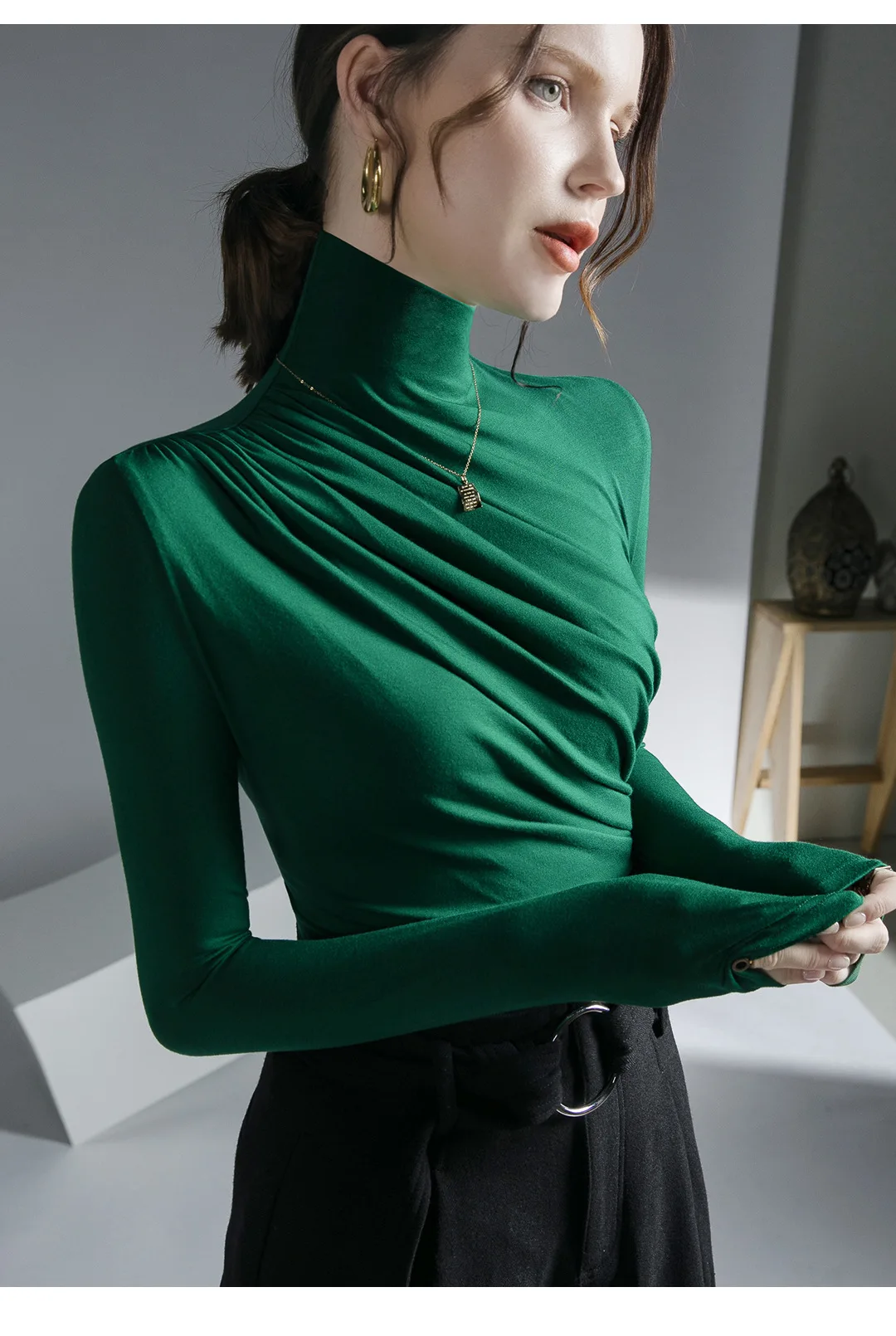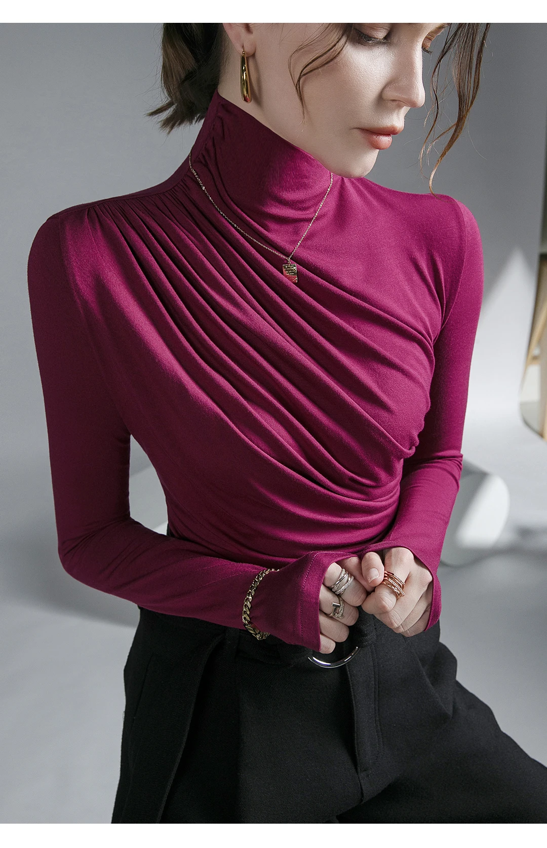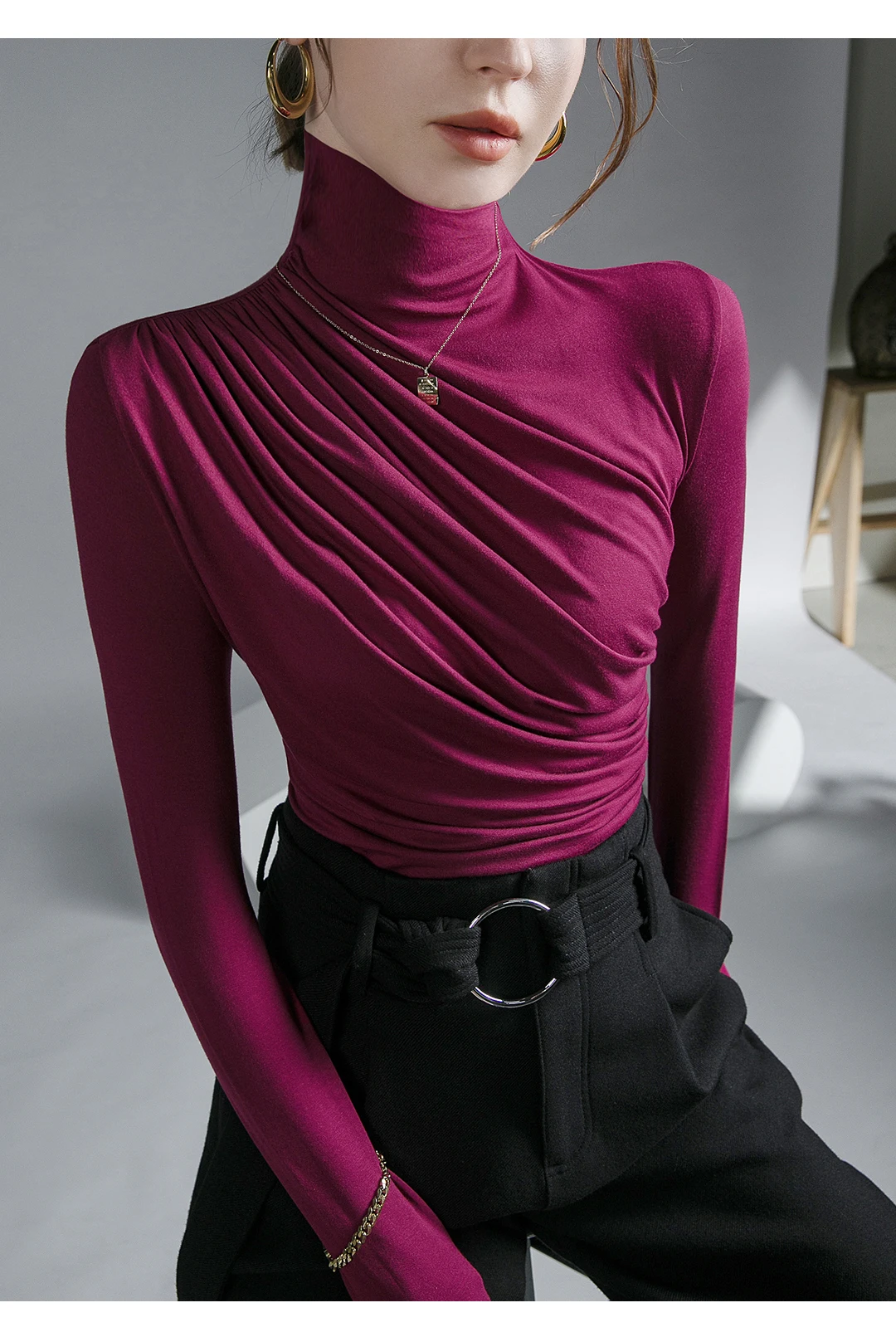 Pleated T-shirt Stretch Autumn and Winter Turtleneck Bottoming Pullover Women's Casual White Basic Top Shirts Harajuku Gothic