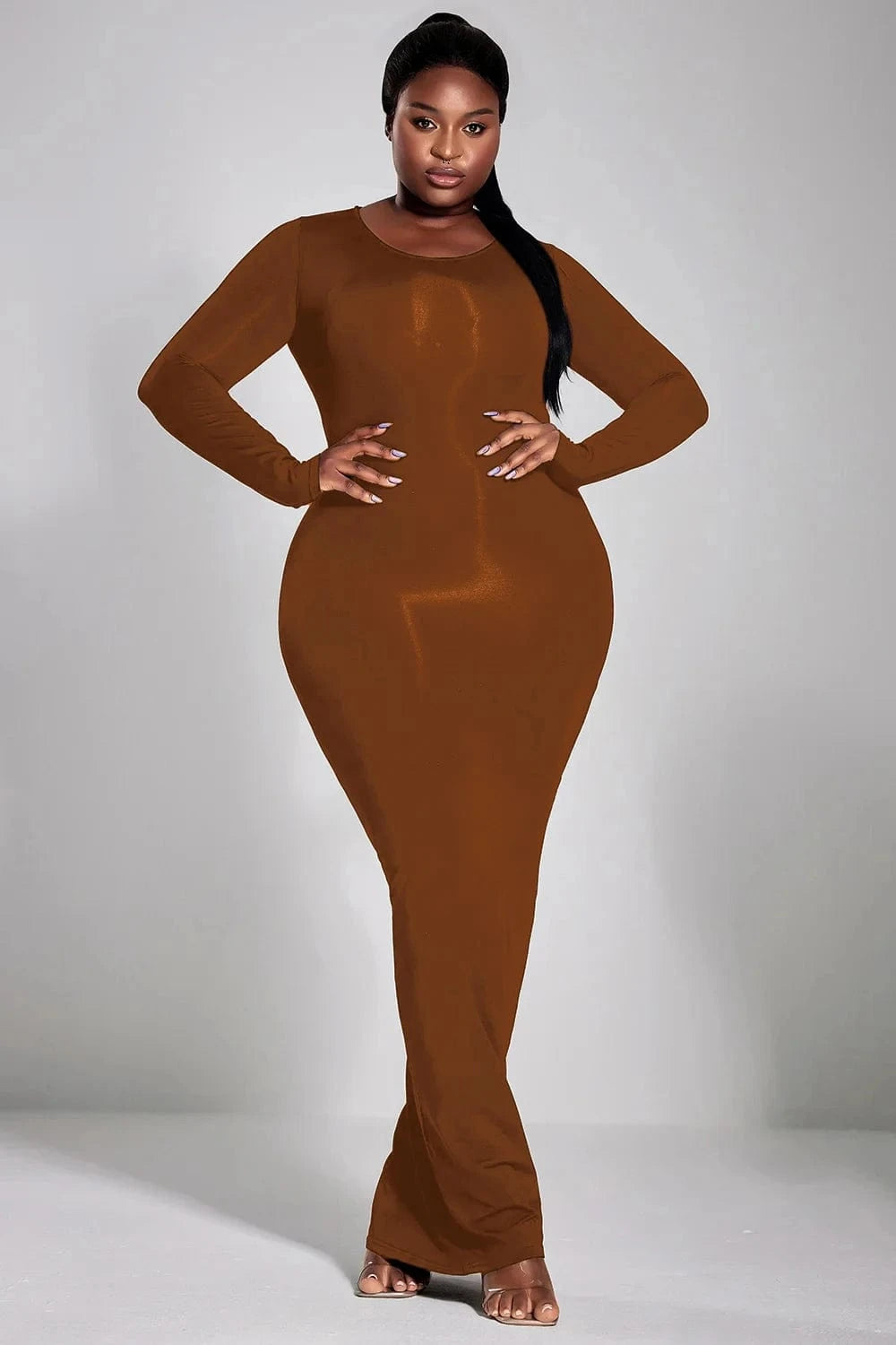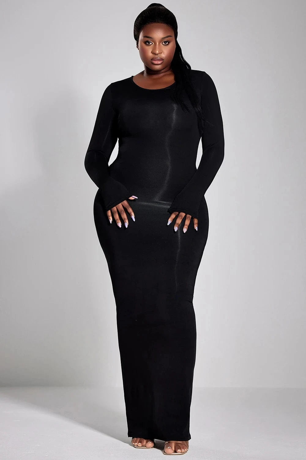 Plus Size Casual Dress Black Round-Neck Long Sleeve Knitted Maxi Dress