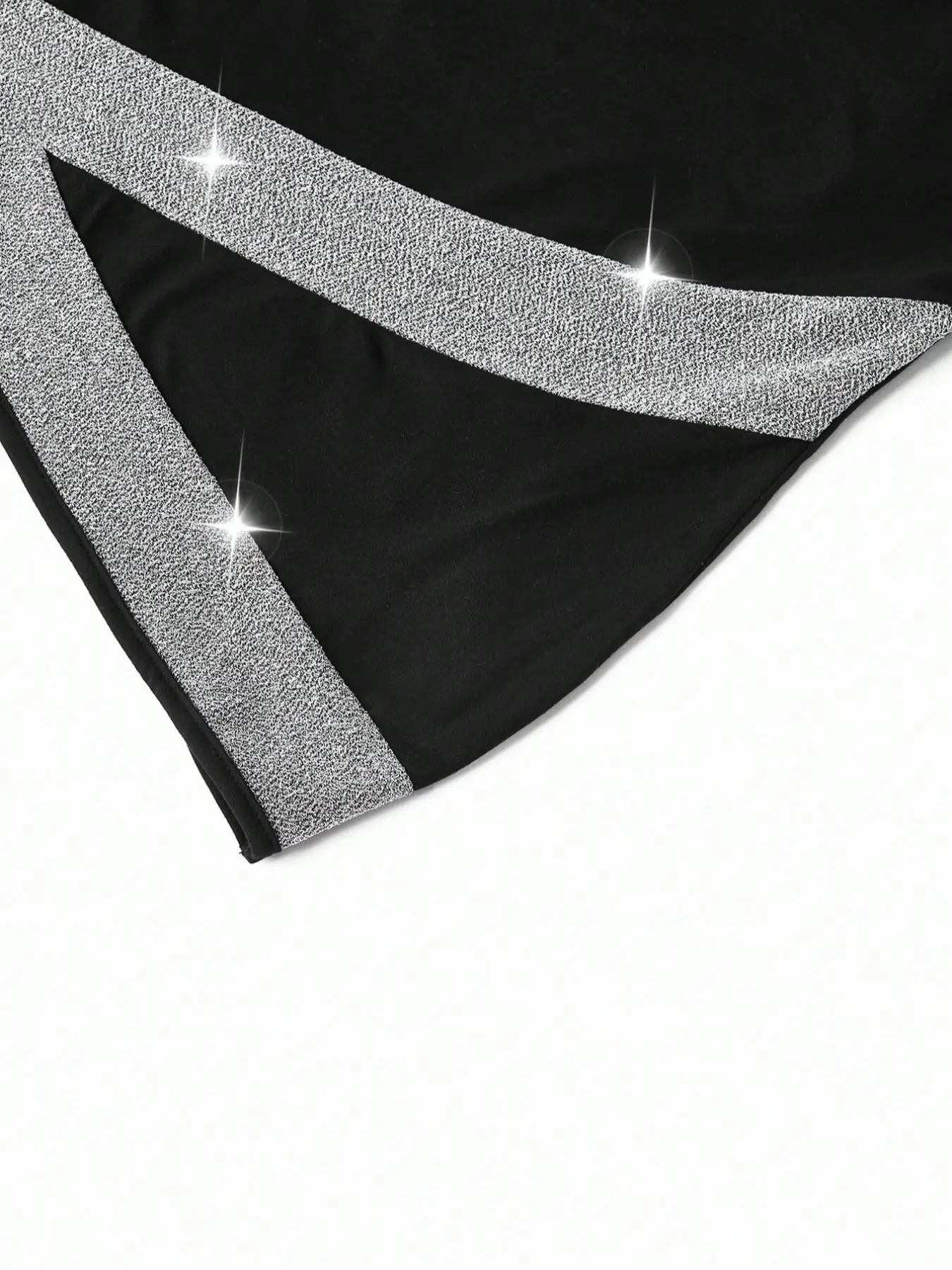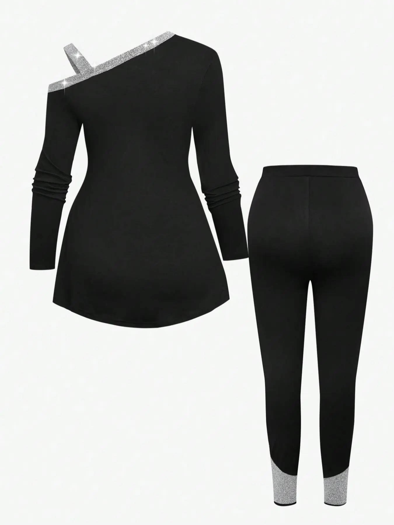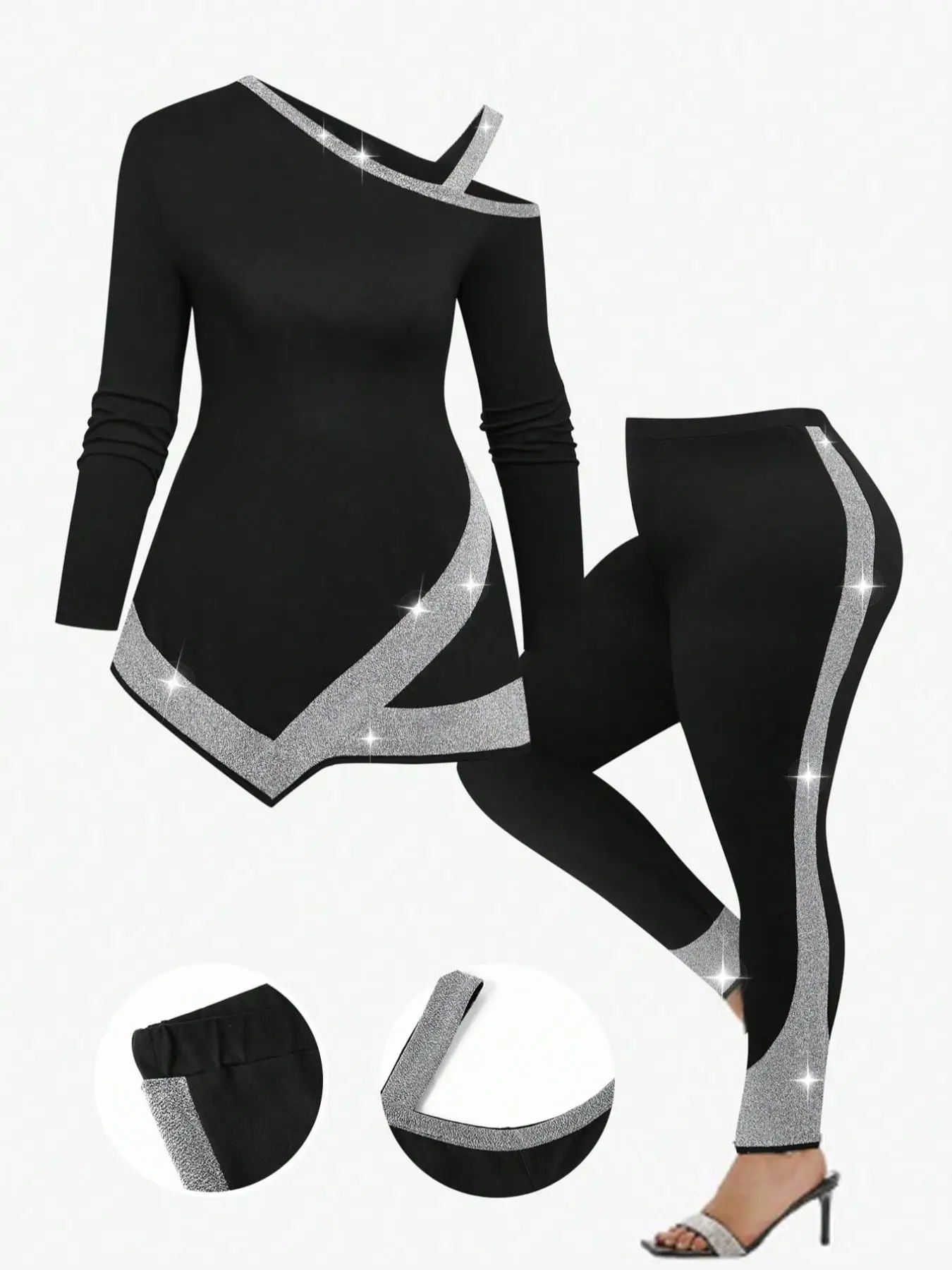 【Plus Size】 Two-Piece Set Patchwork Asymmetrical Neck Tee & Elastic Waist Pants, Casual Long Sleeve Asymmetrical Hem Top & Skinn