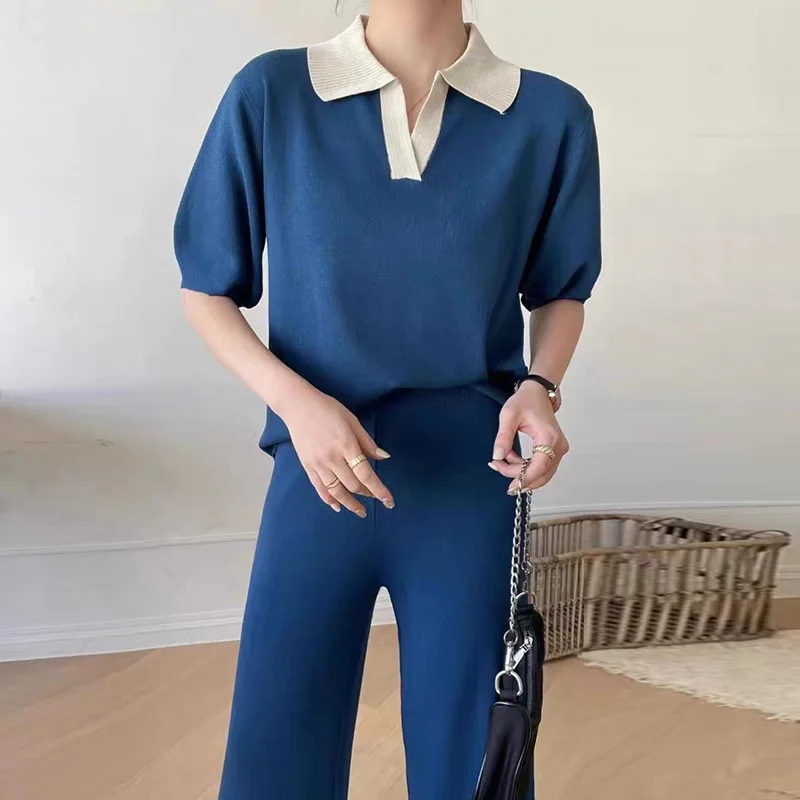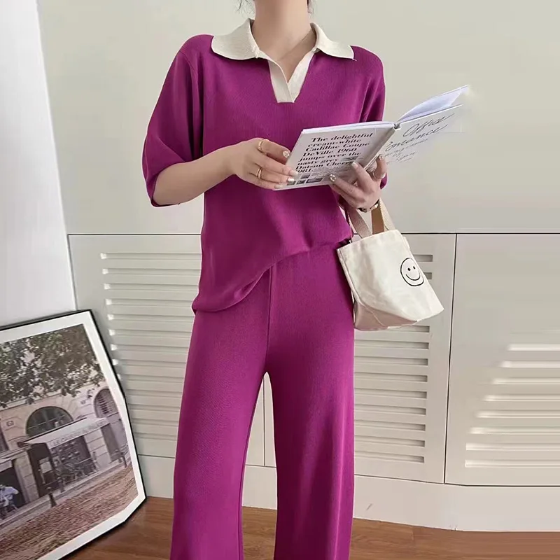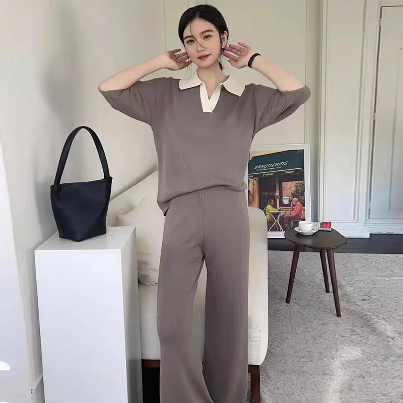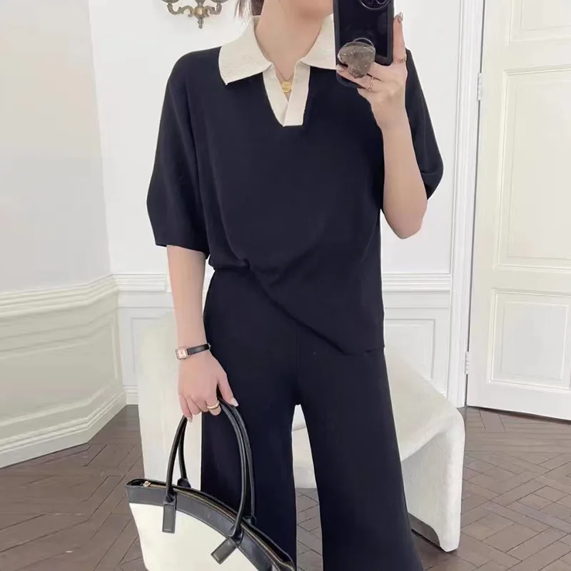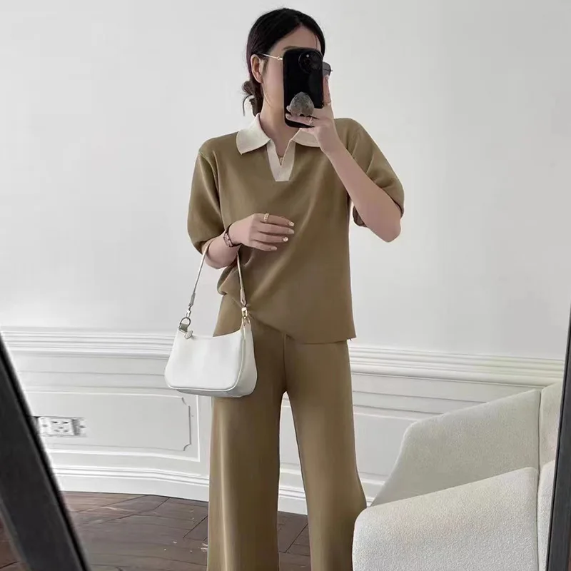 Polo neck short sleeve knitting shirt women summer thin wide leg pants two-piece set