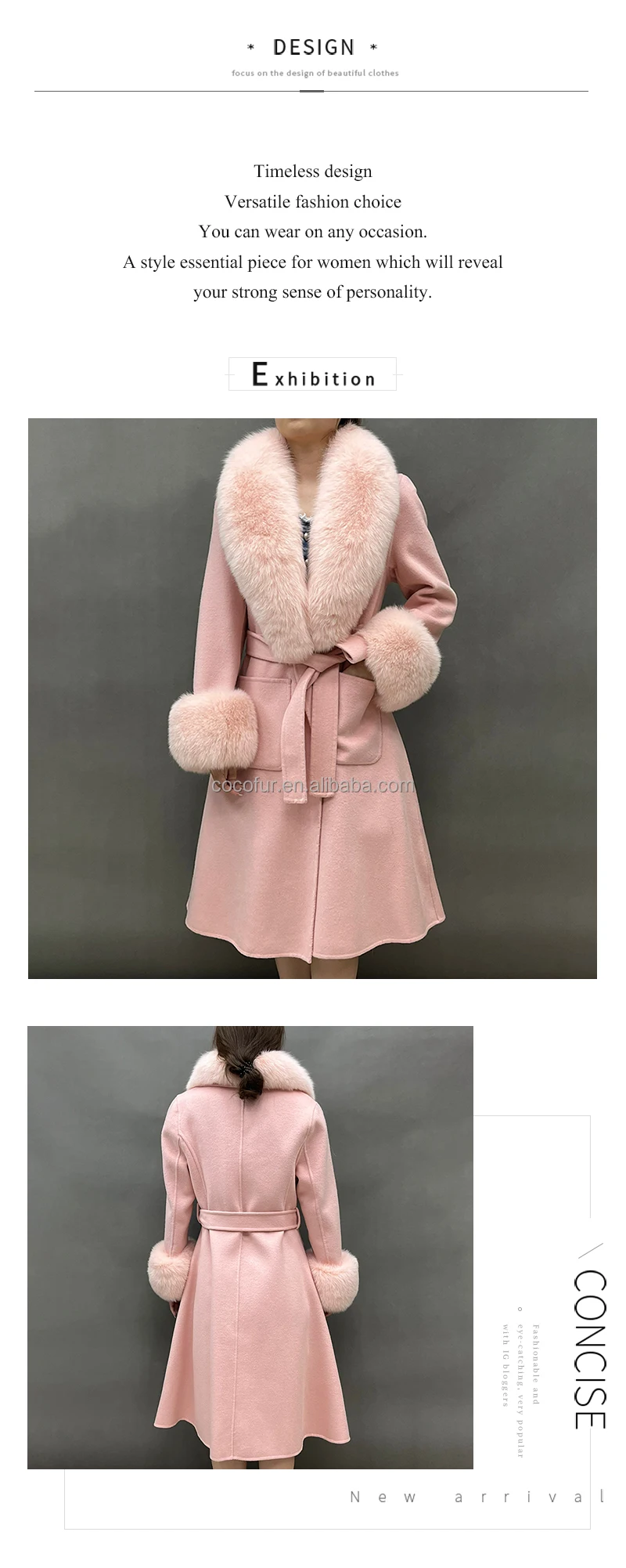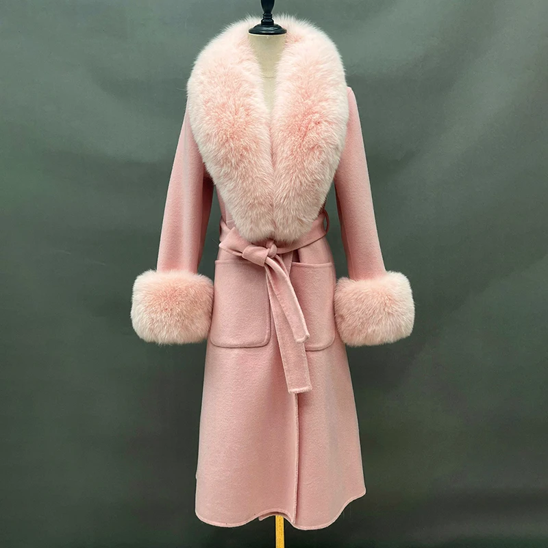 Pretty Pink Real fox Fur Trim Cashmere Coat Women Elegant Reversible Wool Coat with Fur