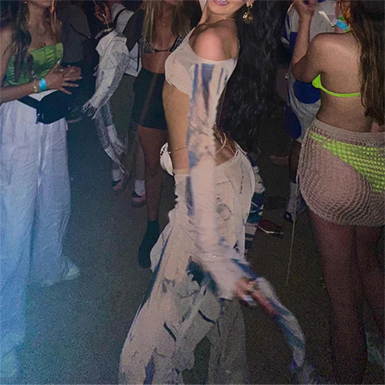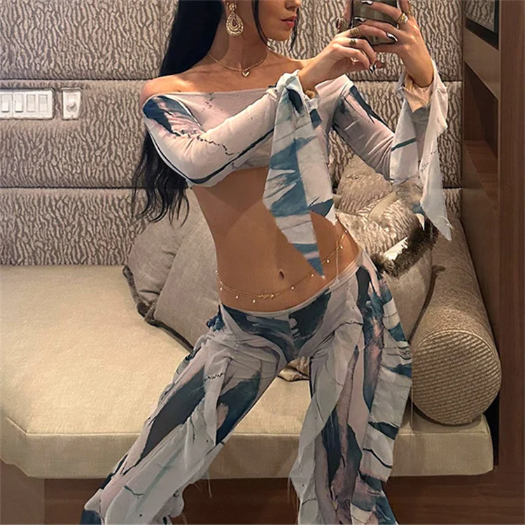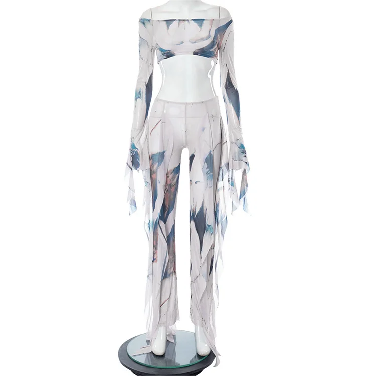 Print Ruffle Mesh Pants 2 Piece Set Women Long Sleeve Off Shoulder Crop Top Pants Matching Outifts