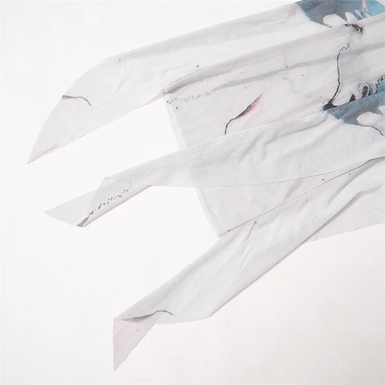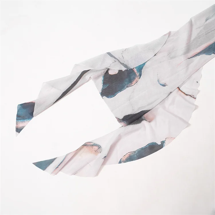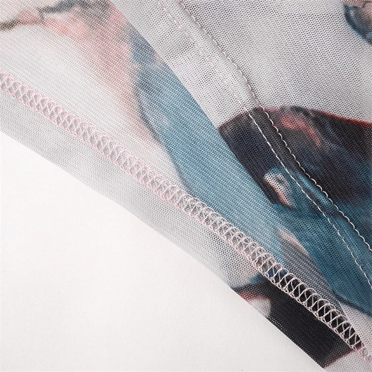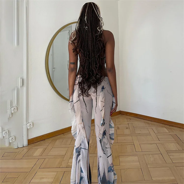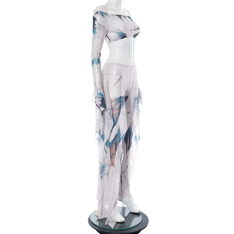 Print Ruffle Mesh Pants 2 Piece Set Women Long Sleeve Off Shoulder Crop Top Pants Matching Outfits