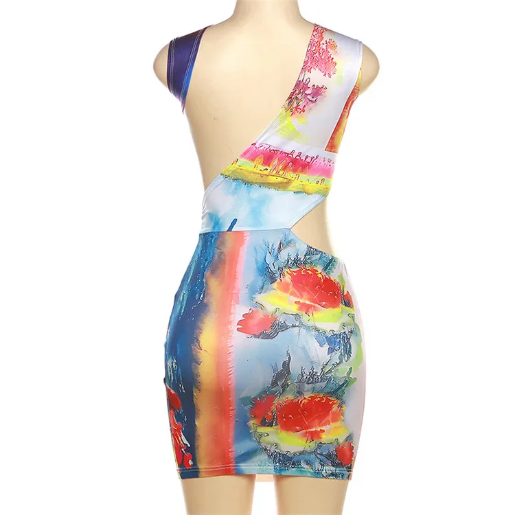 Print Sleeveless Backless Hollow Out Sexy Slim Mini Dress 2024 Summer Women Fashion Dress