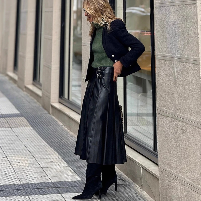 PU High Waist Pleated Women's Long Skirt Fashion Temperament Black Commuting Skirt New 2025 Street Decoration Autumn Half Skirt