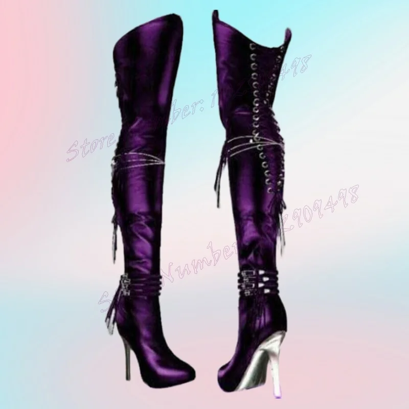 Purple Cross Tied Over The Knee Boots Patent Leather Pointed Toe Shoes for Women Thin High Heels Shoes 2025 Zapatos Para Mujere