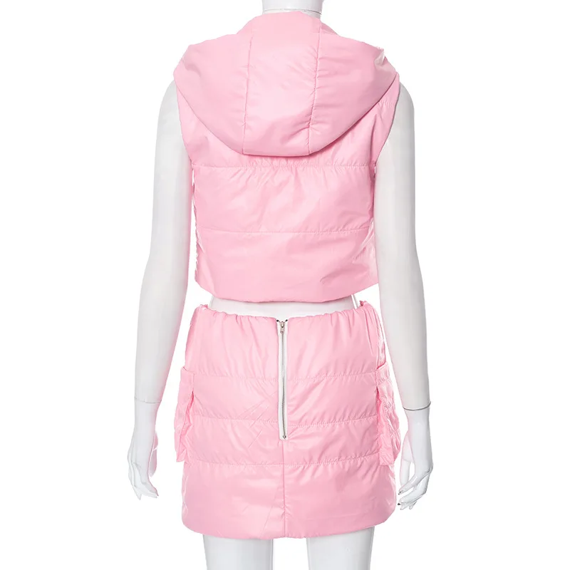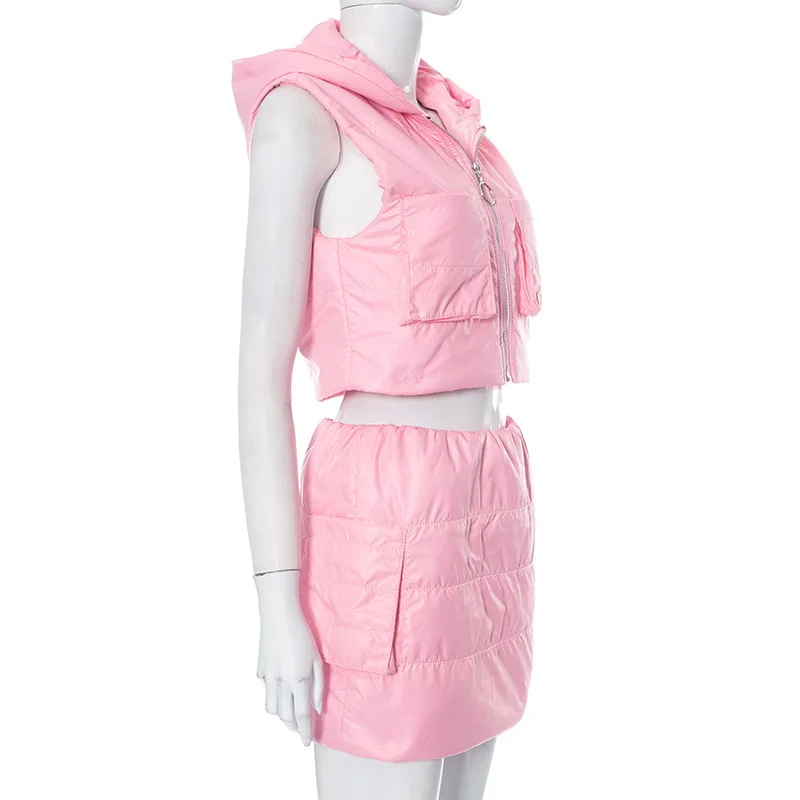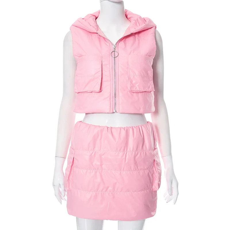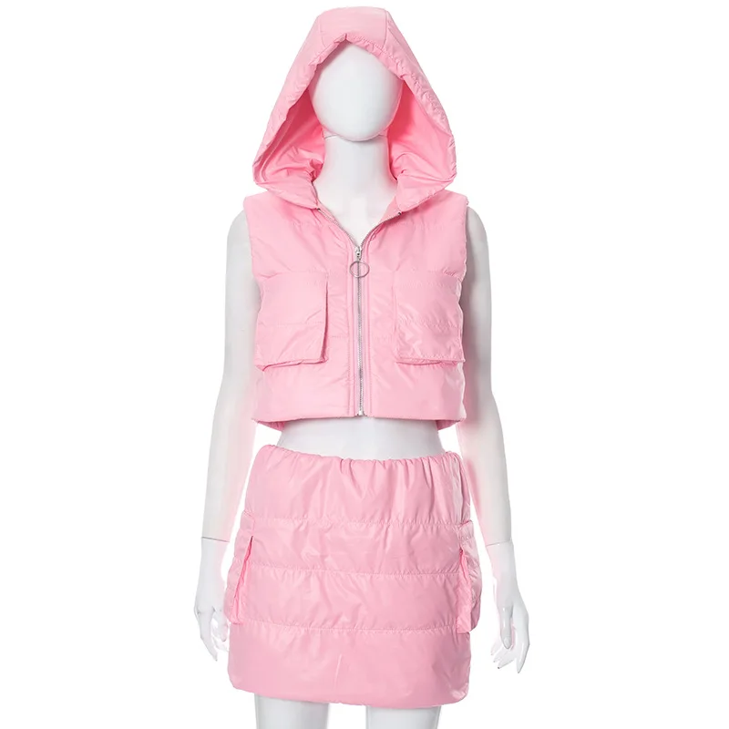 Q23st385 Autumn Women's Cotton Set Solid Hoodie Zipper Sleeveless Skinny Crop Top Pockets Mini Skirt 2pcs Set For Woman