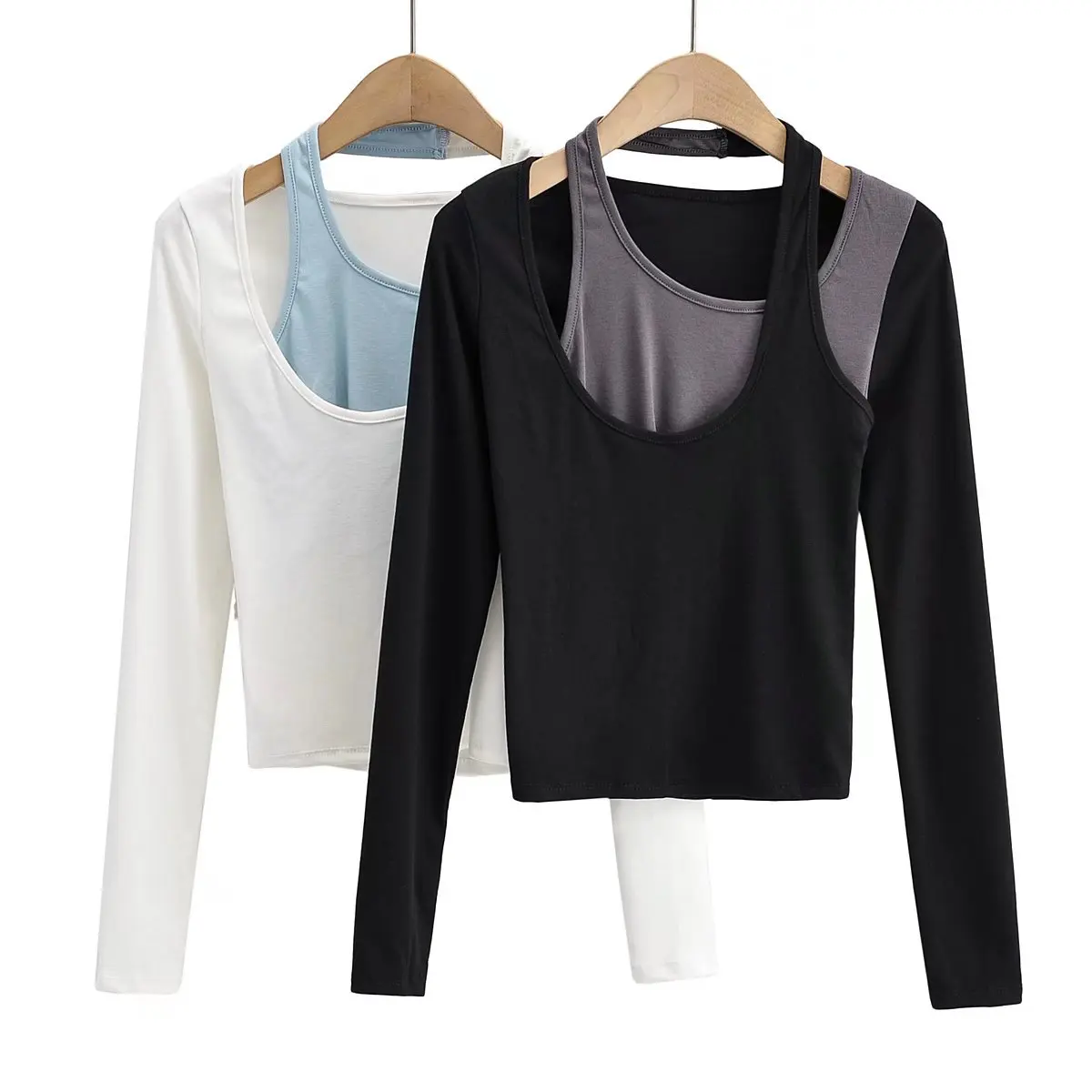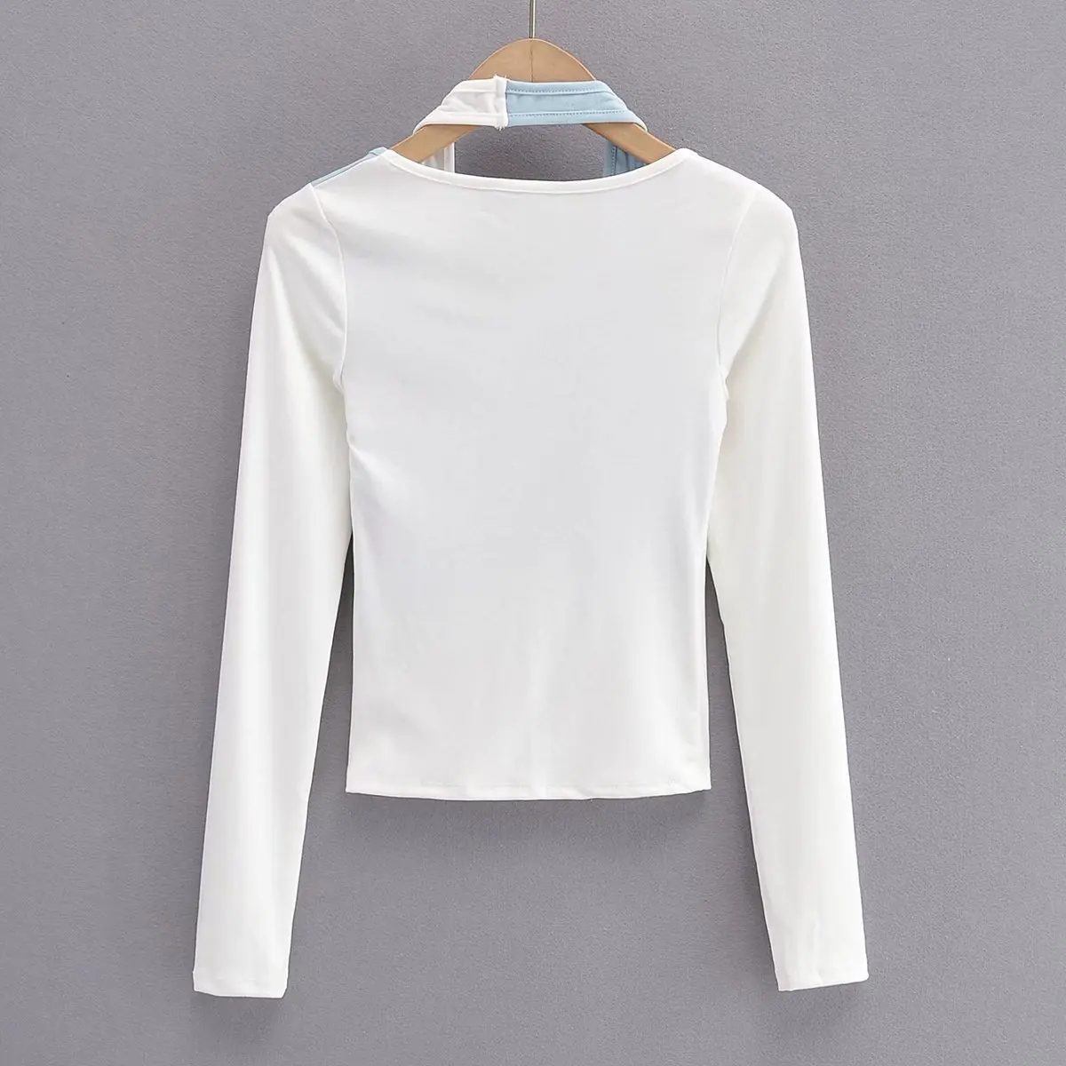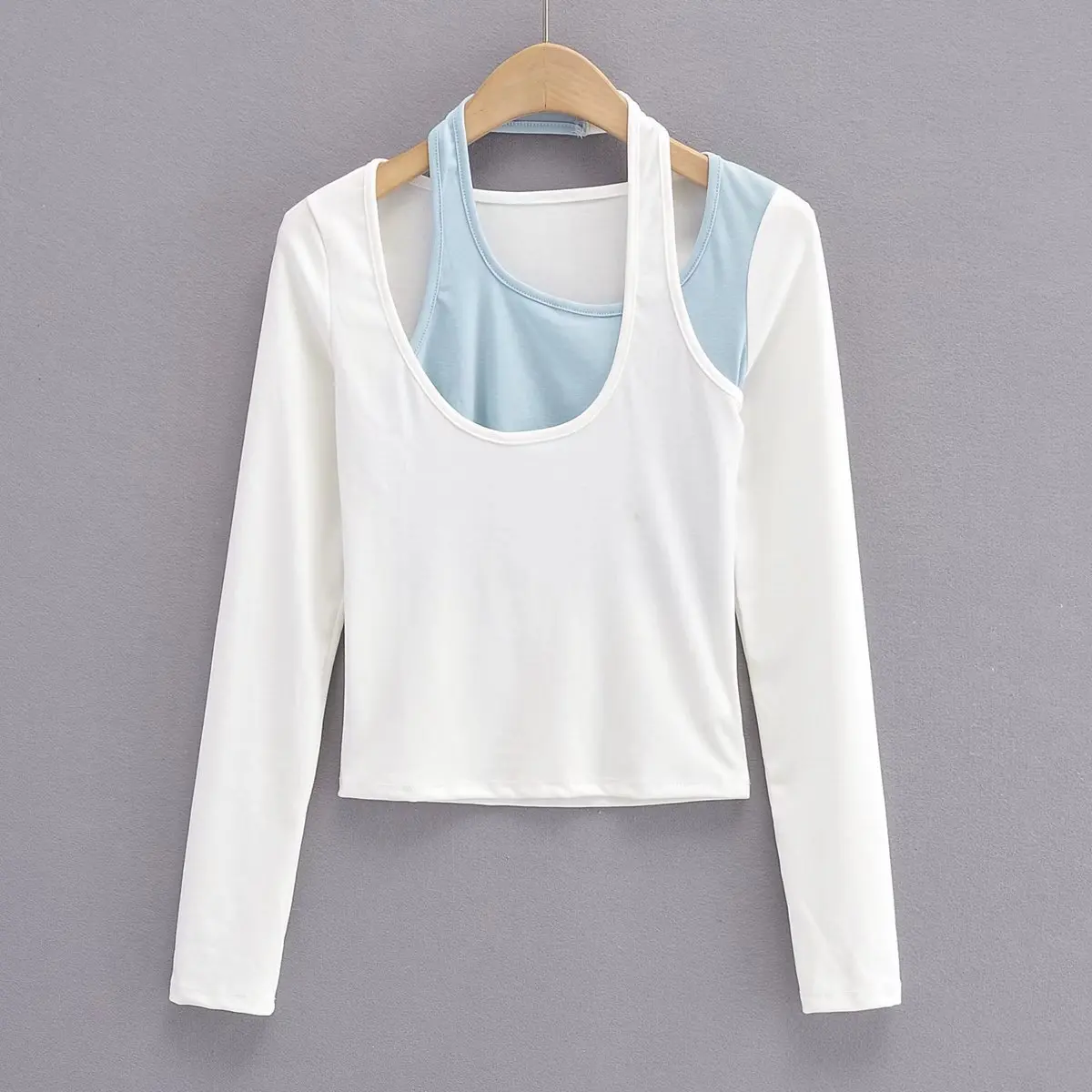 Women's fashion contrast color hanging neck two piece long sleeves slim T-shirt