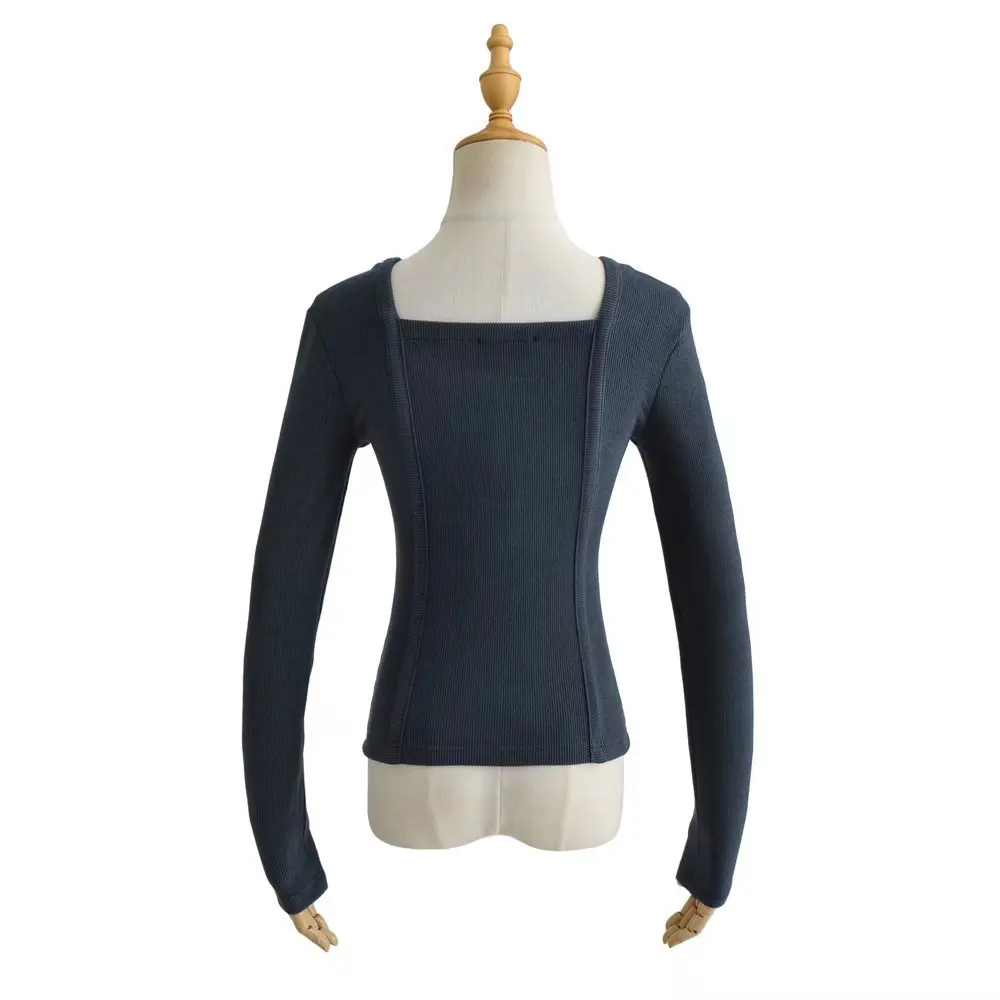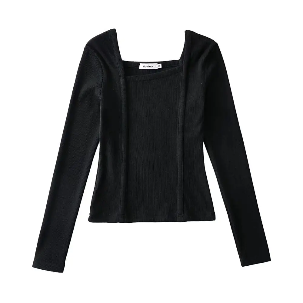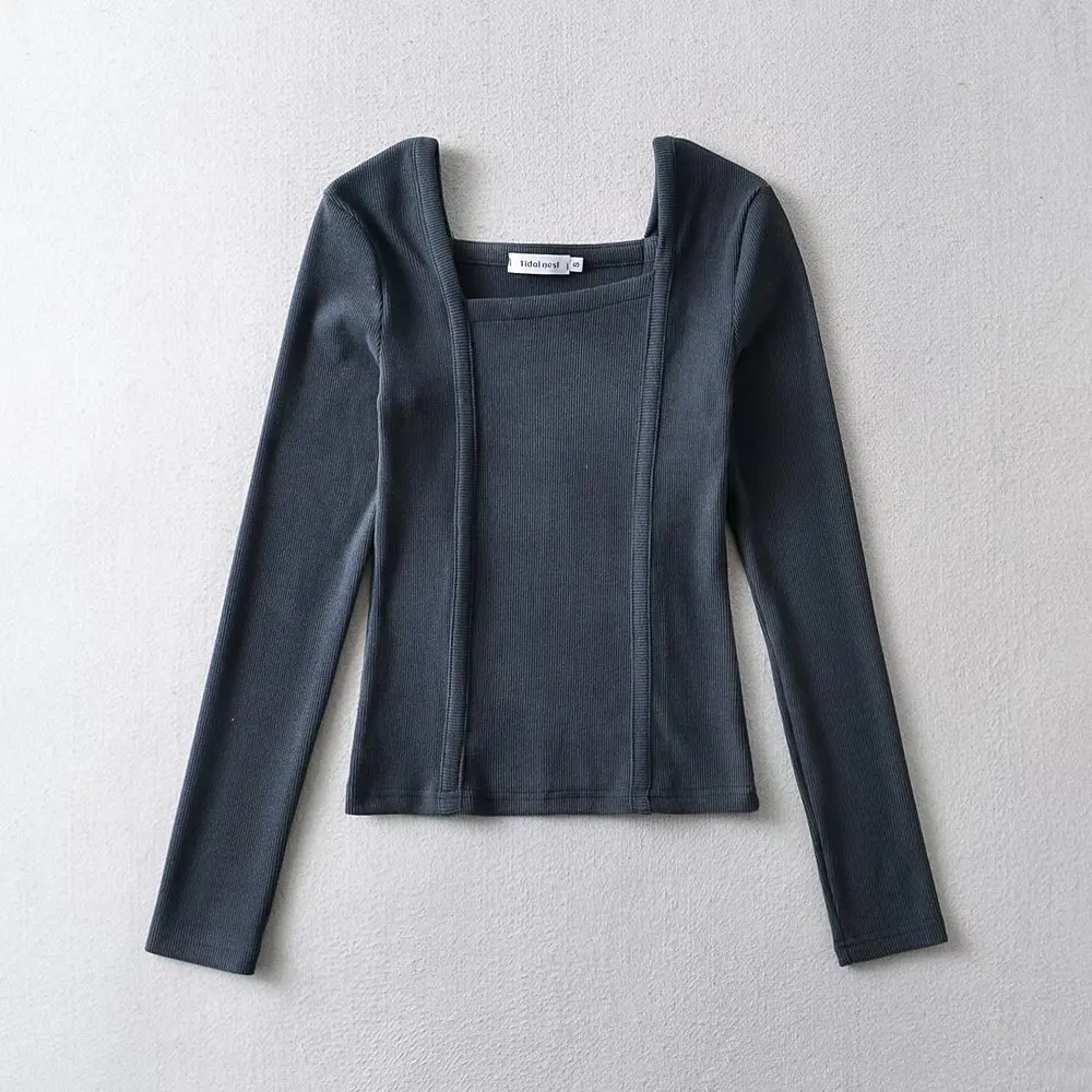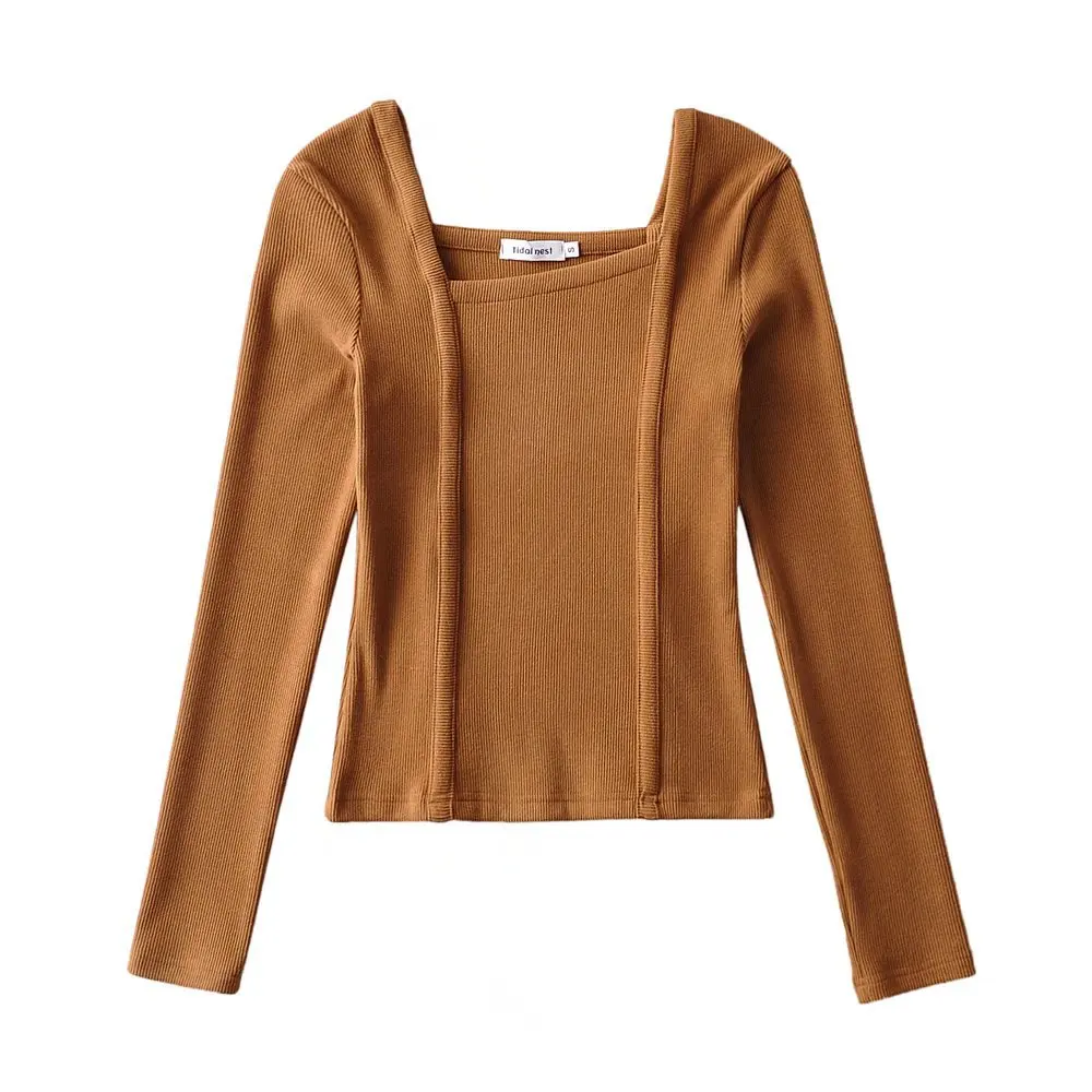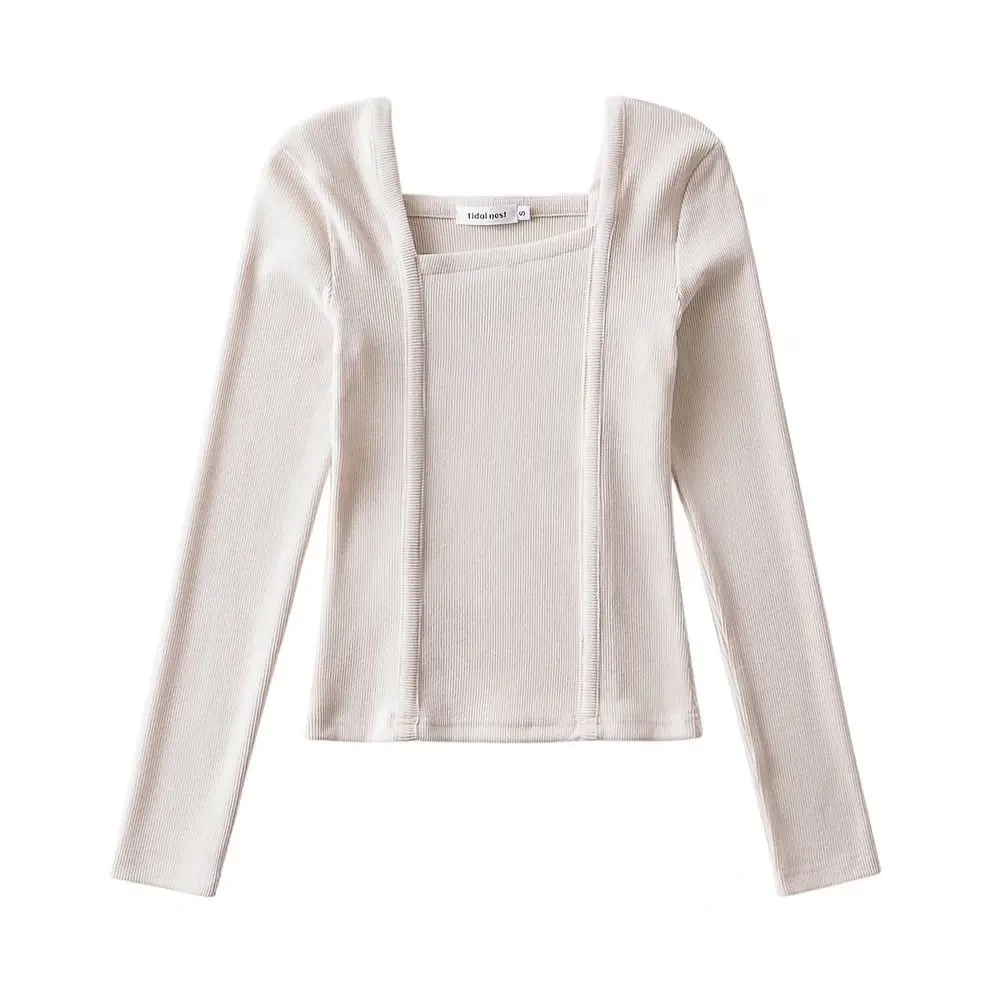 R20122S Women's fashion solid color front pressure line asymmetric front collar bottoming top knitted shirt tops