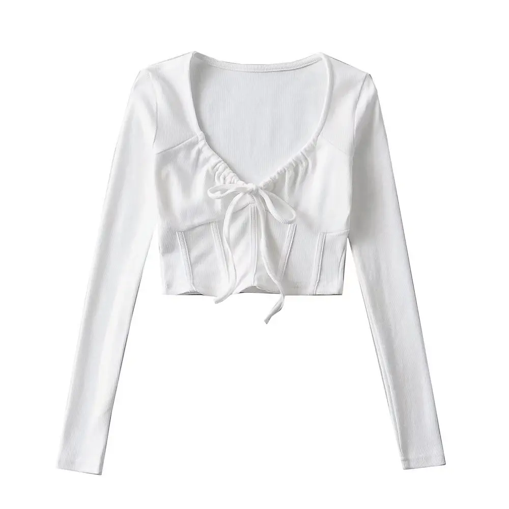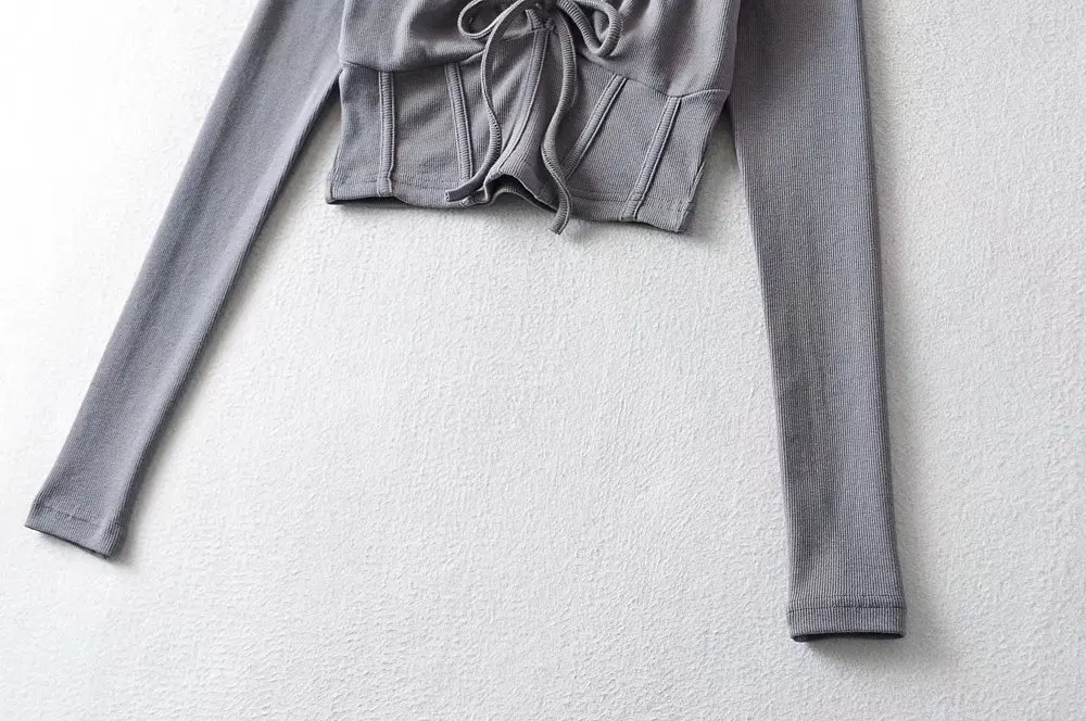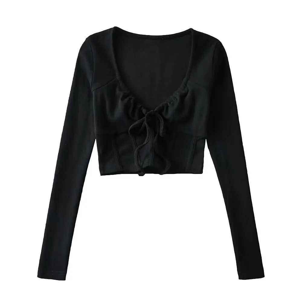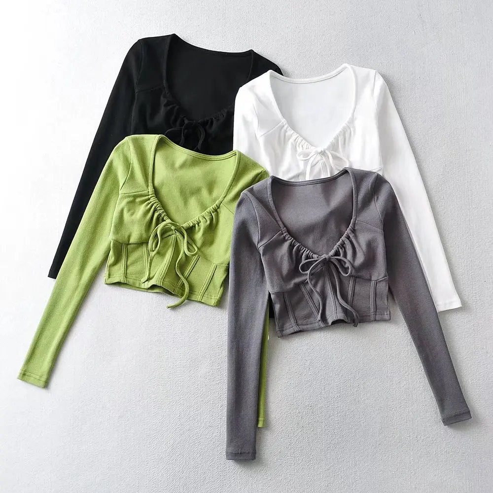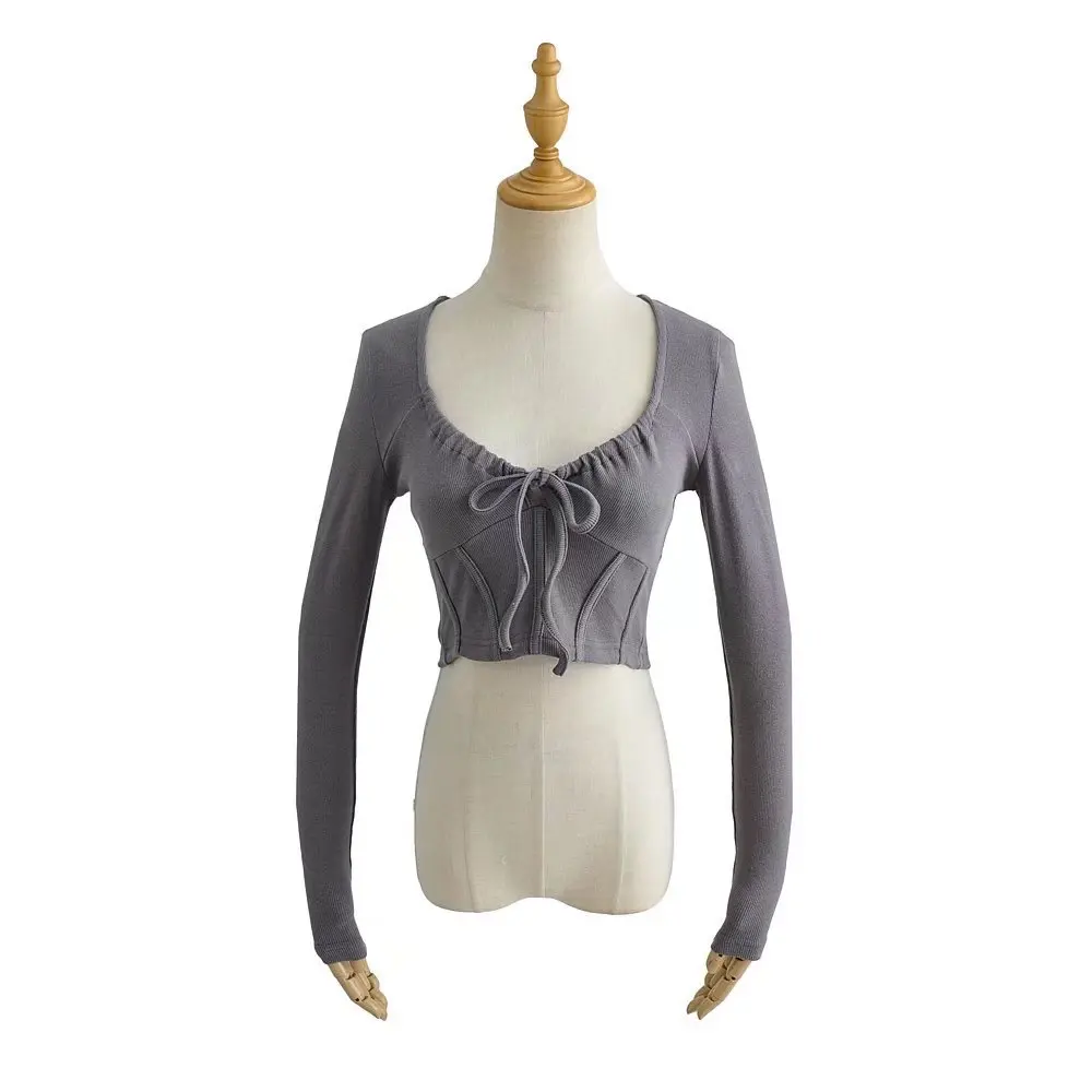 R20129S 2022 New design women's fashion solid color slim short drawstring fishbone stickers long-sleeved T-shirt