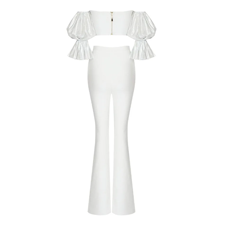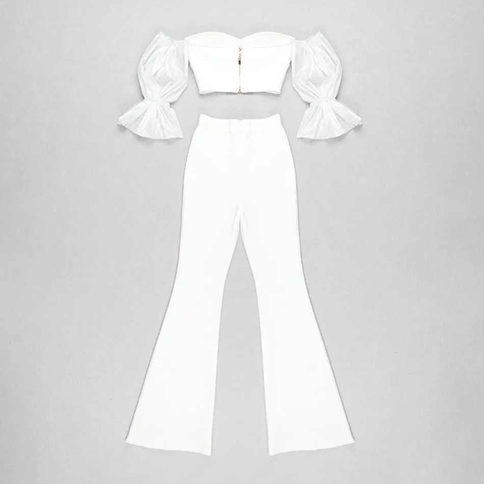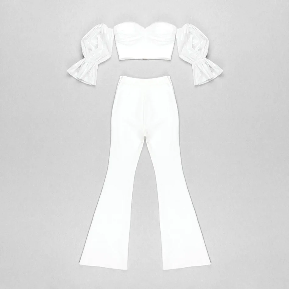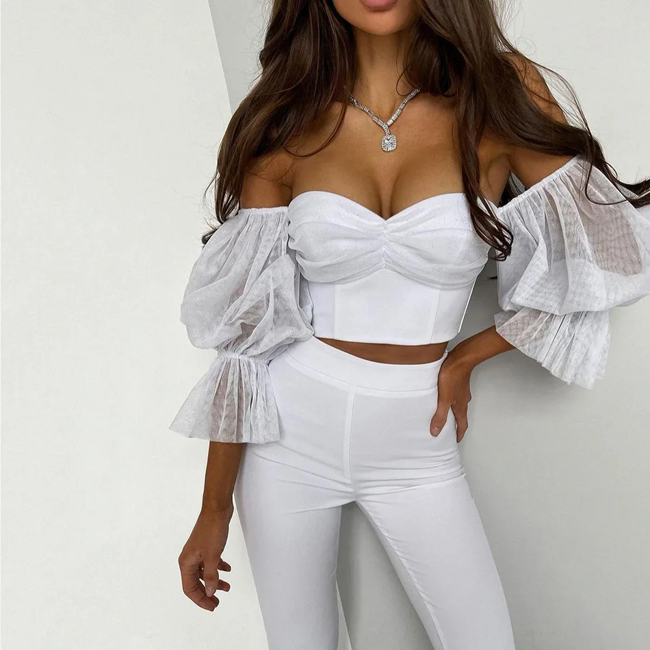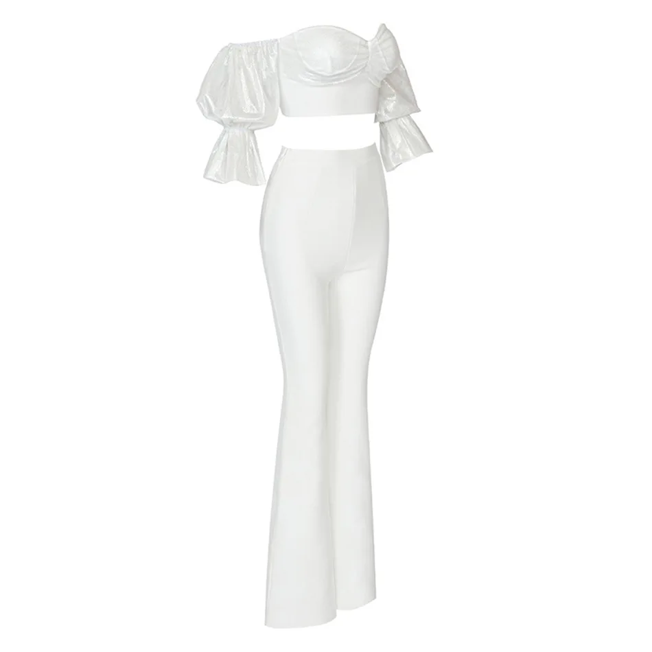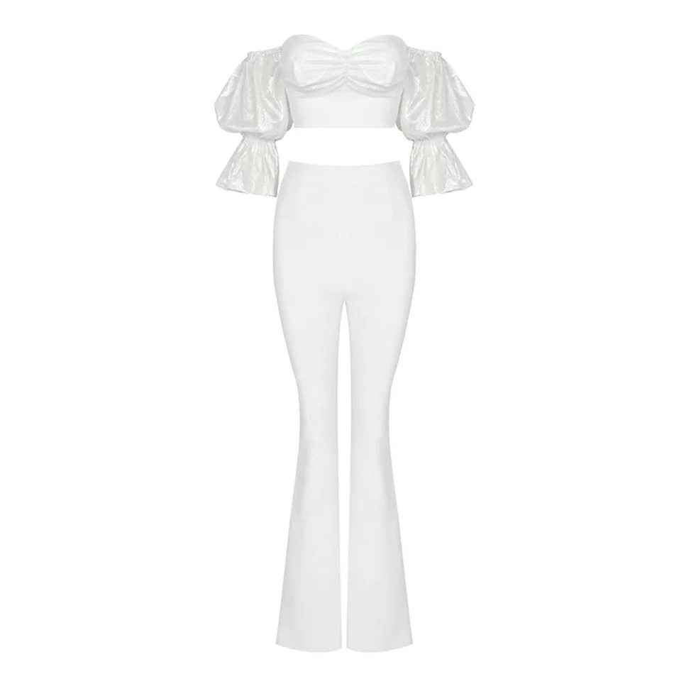 R30383S 2022 summer white tube top five-point puff sleeve stretch trousers sexy bandage two-piece set women casual pants suits