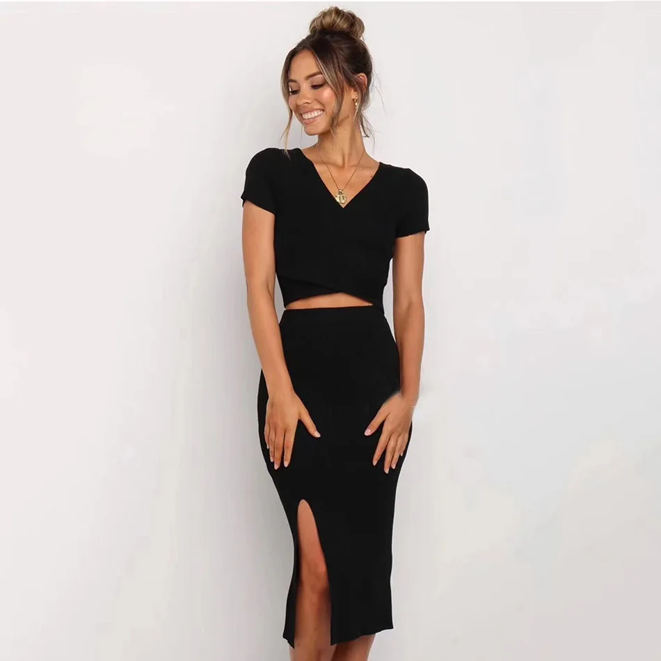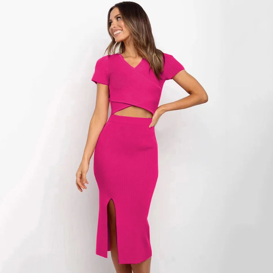 R30384S 2022 Casual Knit Sweater Set V-Neck Short Sleeve Short Sweater Suit High Waist Slit Mid Skirt Two Piece Set Women Casual