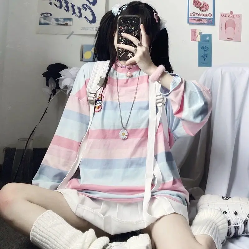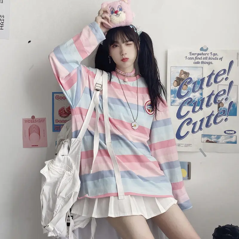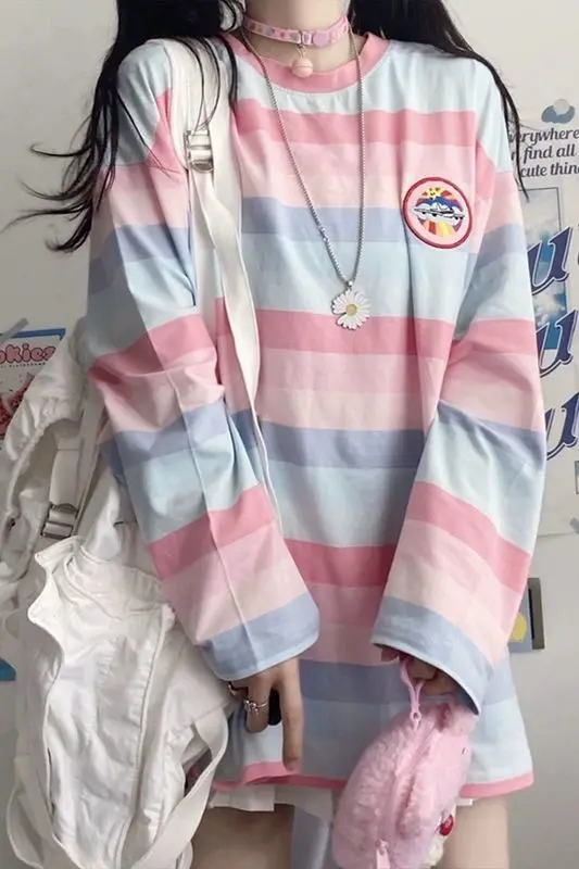 Rainbow Funny T Shirts Women Embroidery Striped Long Sleeve Shirt Cute Tops Spring Ladies Clothes 2022 Fashion Kpop New