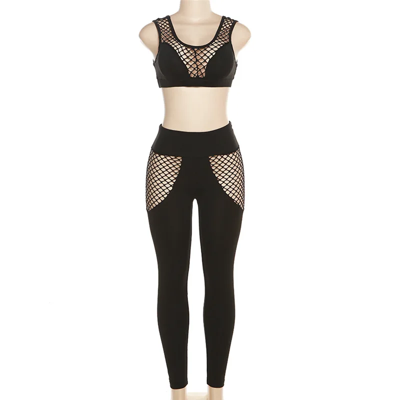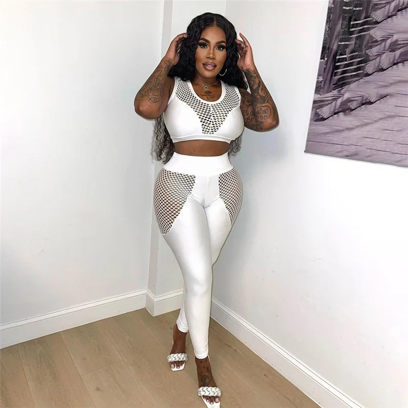 Ready to ship 2023 summer casual lounge wear mesh tank top slim fit two piece pants set