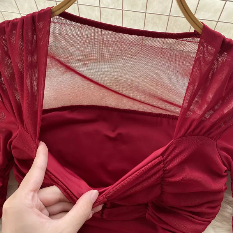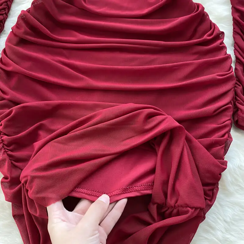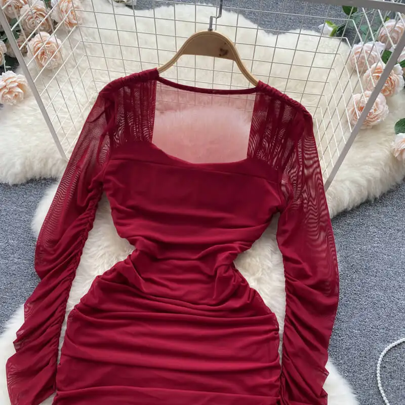 Red Square Neck Fall Women's Waisted Pleated Long Sleeve Bodycon Mini Dresses