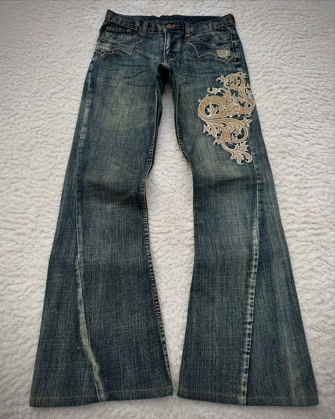 Retro Shallow Water Washing High-bright Lines Thorn Art Embroidery Pattern Y2K Blue Jeans Women's Personalized Micro-flare Pants