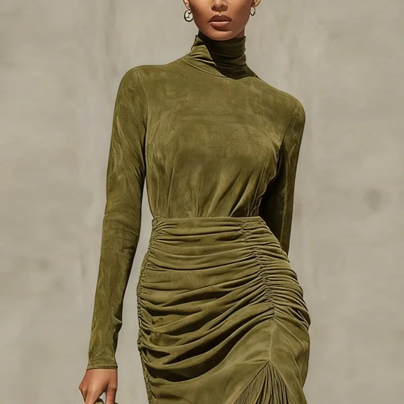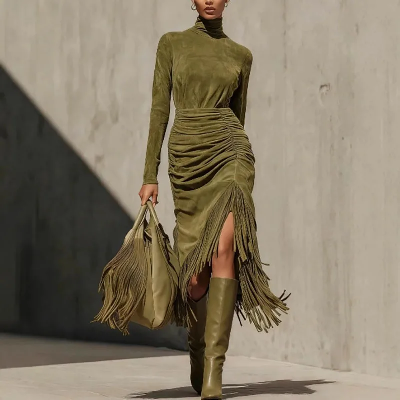 Retro Solid High Waist Tassels Pleated Dress Woman Elegant Turtleneck Irregular Party Dresses Autumn Long Sleeve Slim Sexy Dress