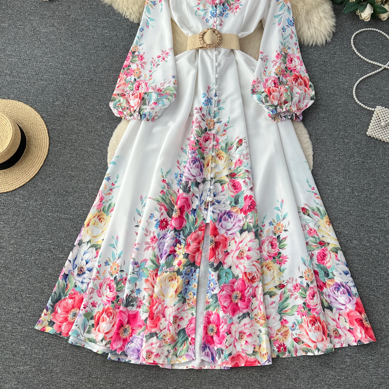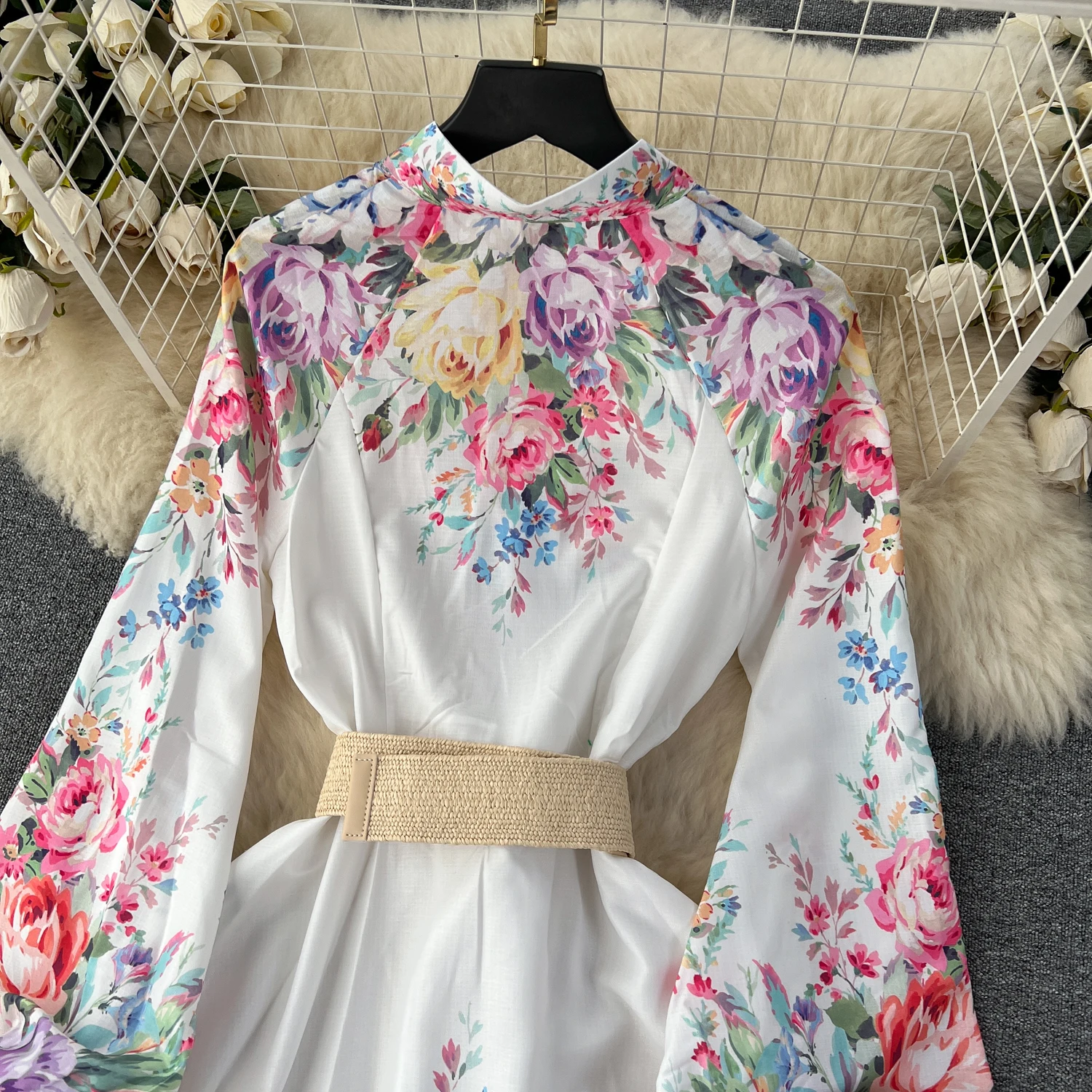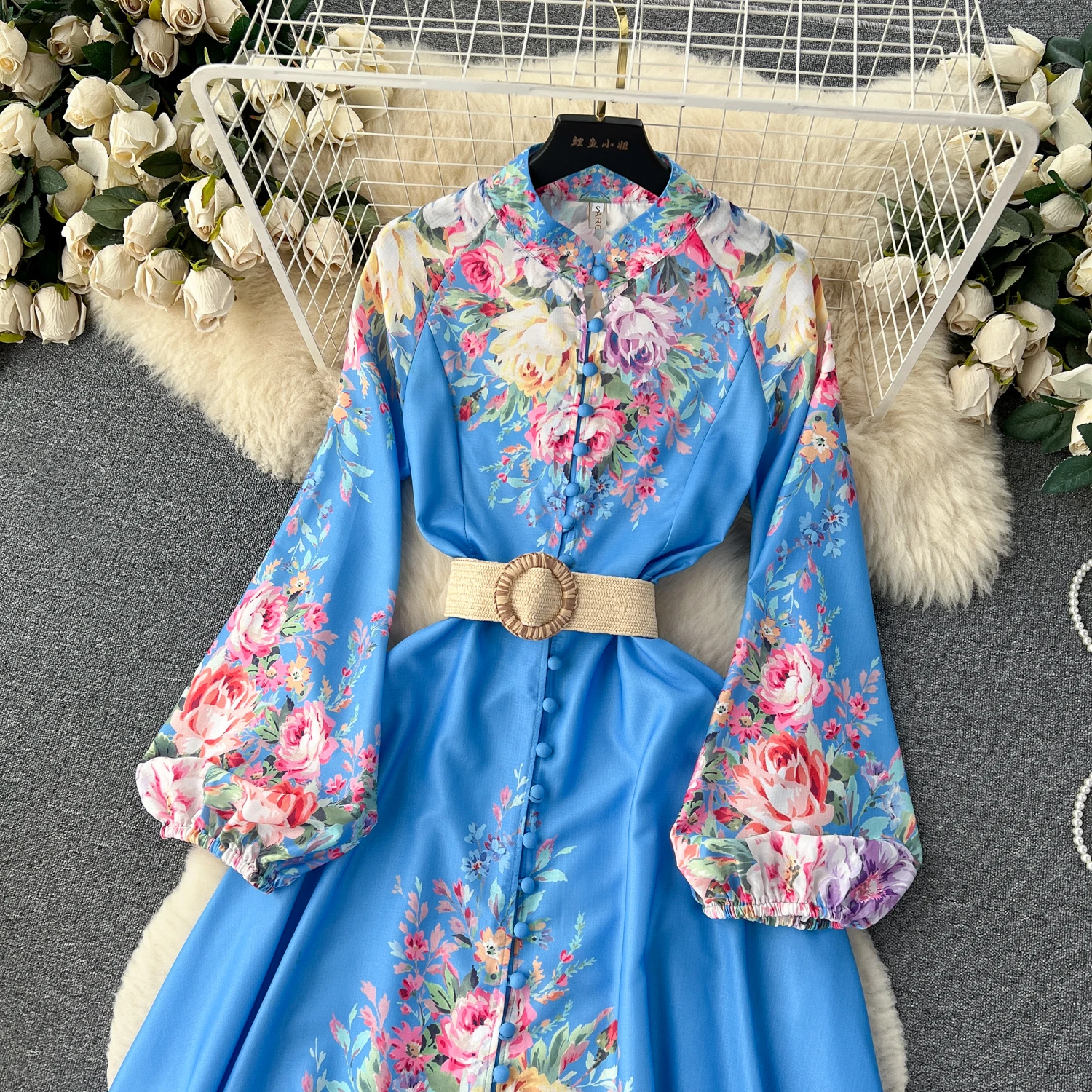 Retro Style Lantern Long Sleeve Standing Neck Single breasted Printed Dress Women's Large Swing Long Dress grown dress for woman