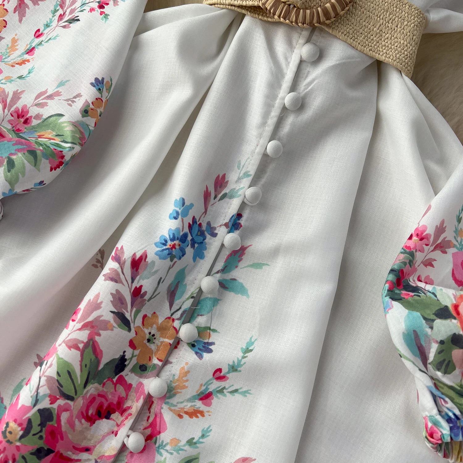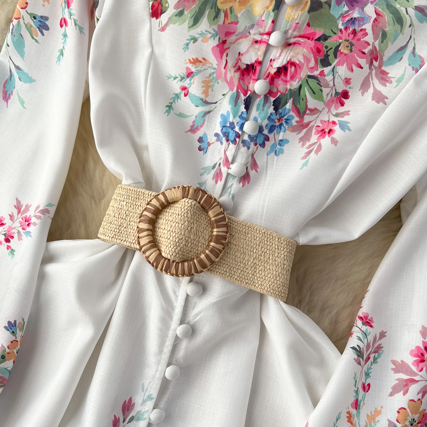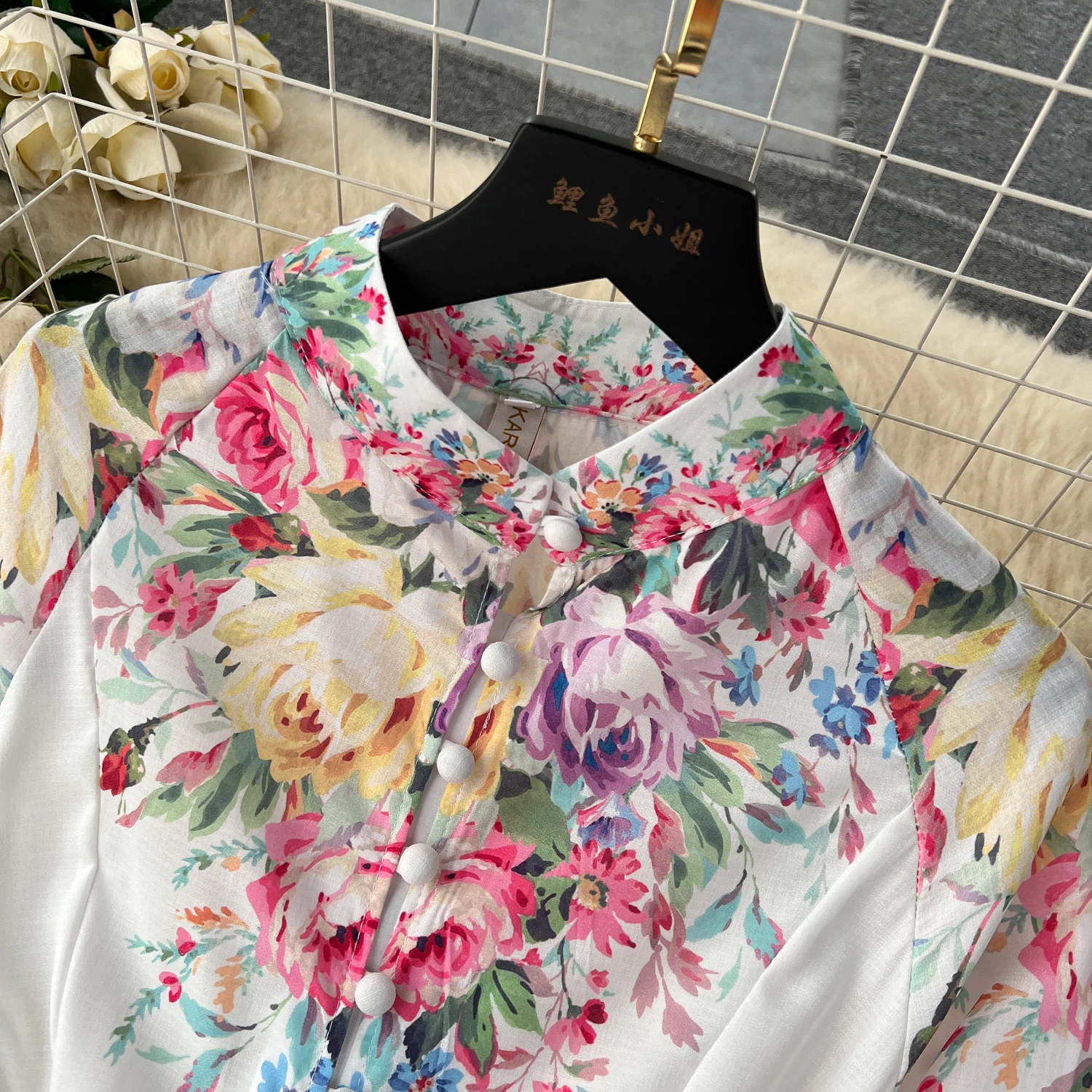 Retro Style Lantern Long Sleeve Standing Neck Single breasted Printed Dress Women's Large Swing Long Dress grown dress for woman