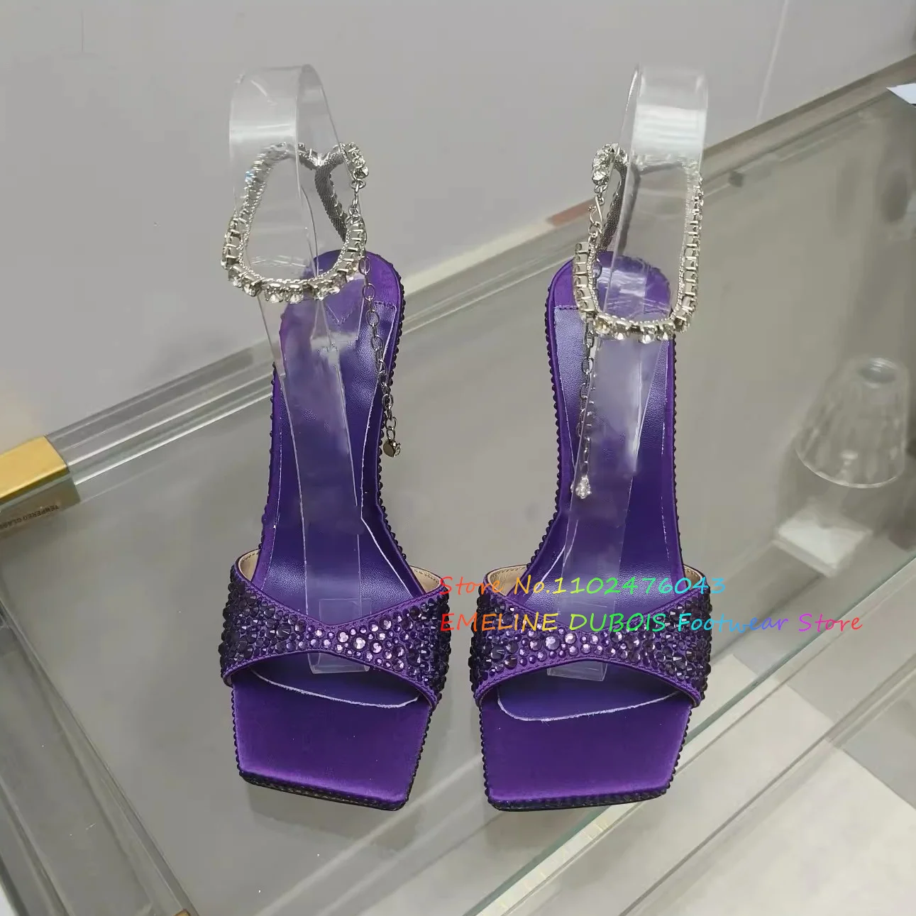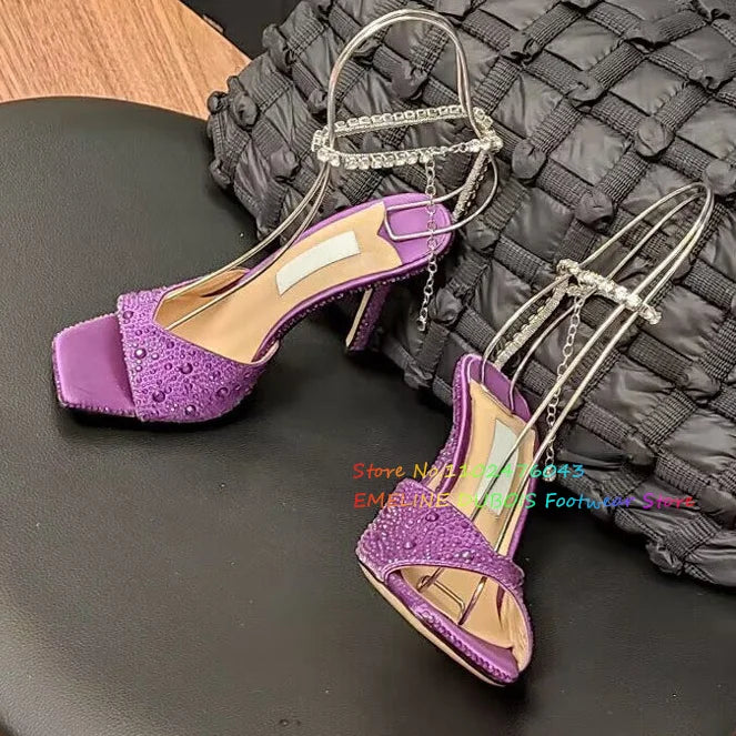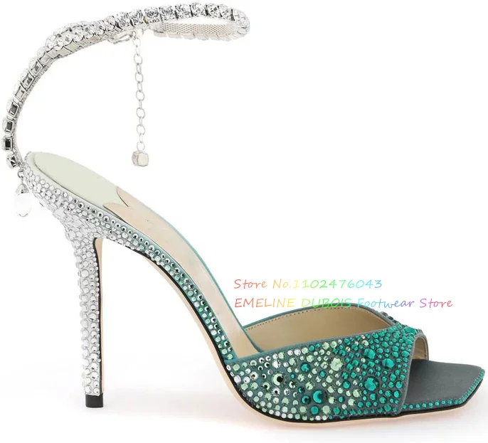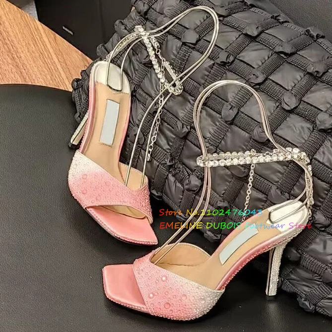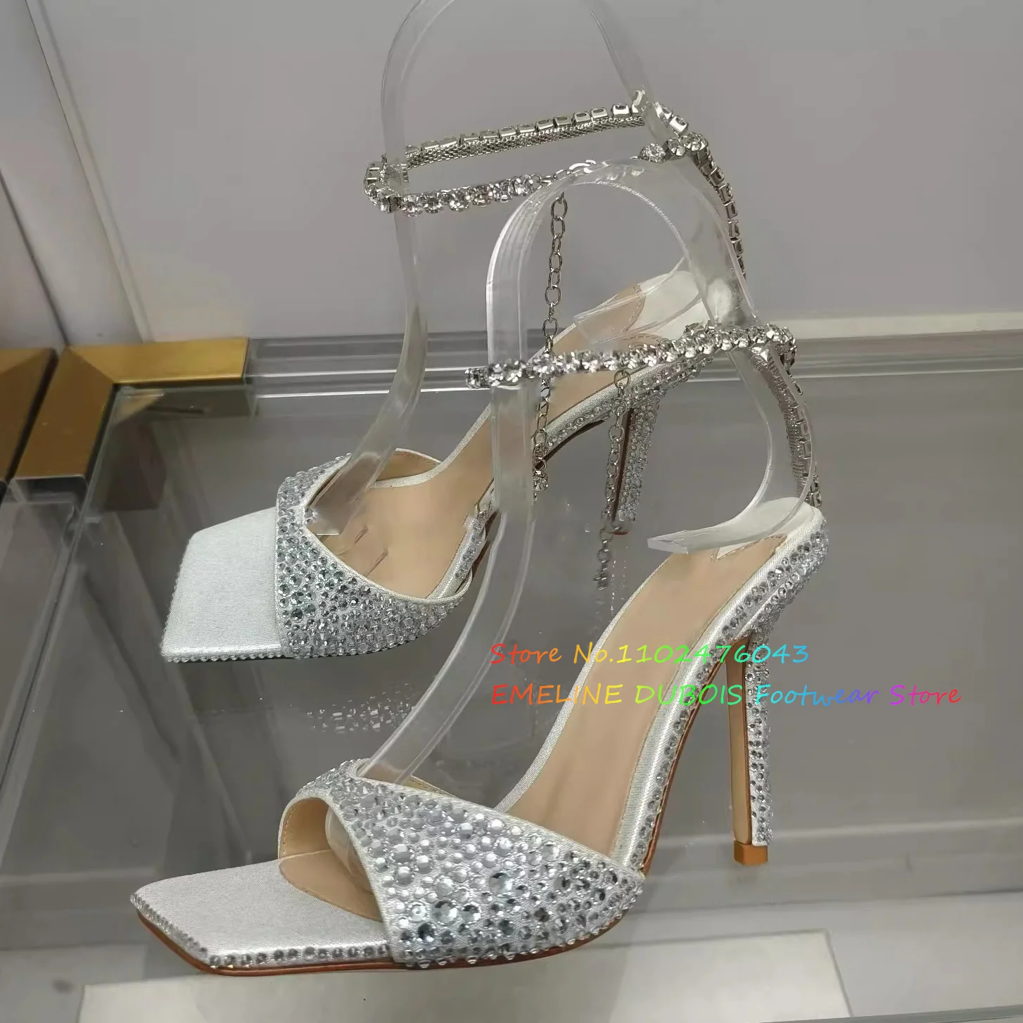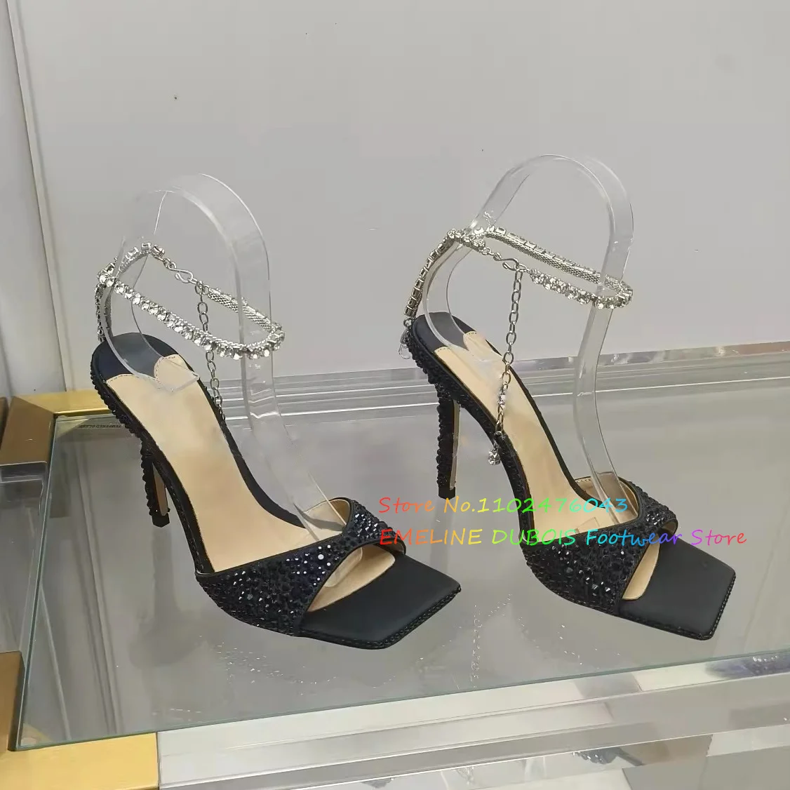 Rhinestone Chain Square Toe High Heel Sandals Women Sexy New Peep Toe Stiletto Heel Crystal Designer Brand Ladies Dress Shoes