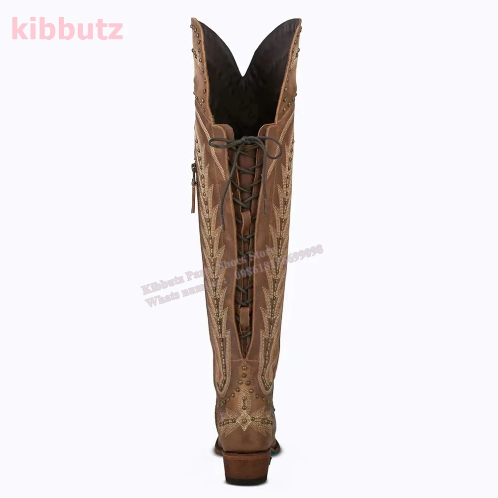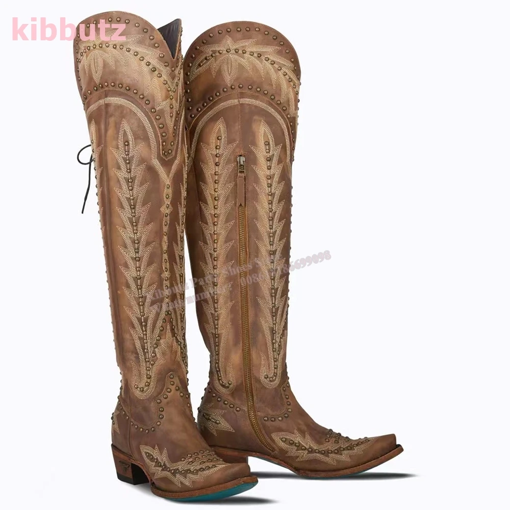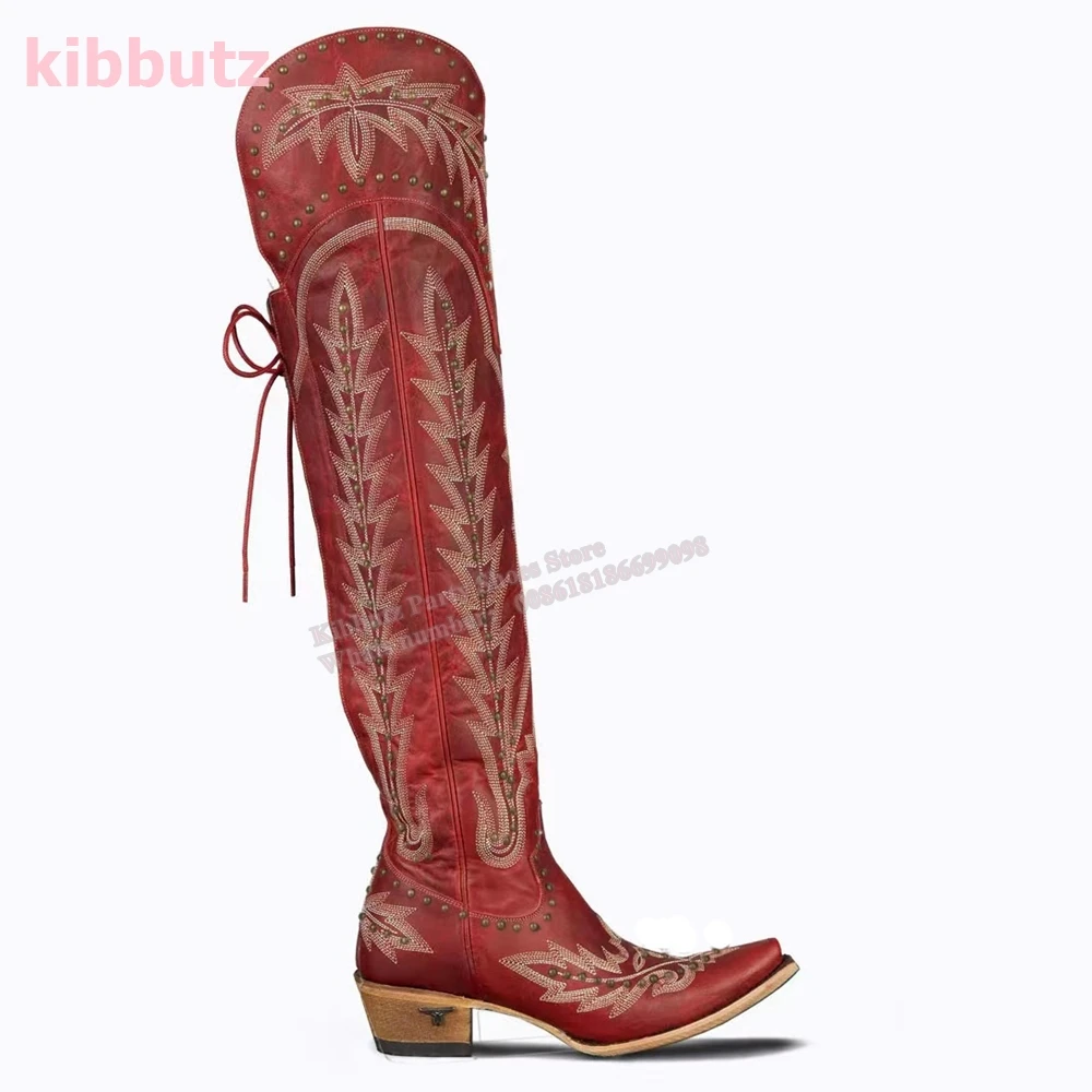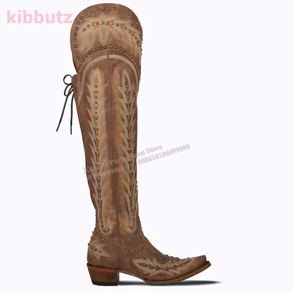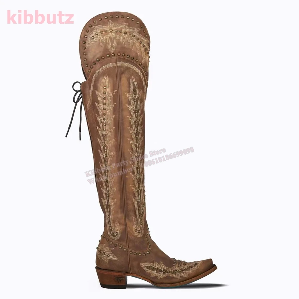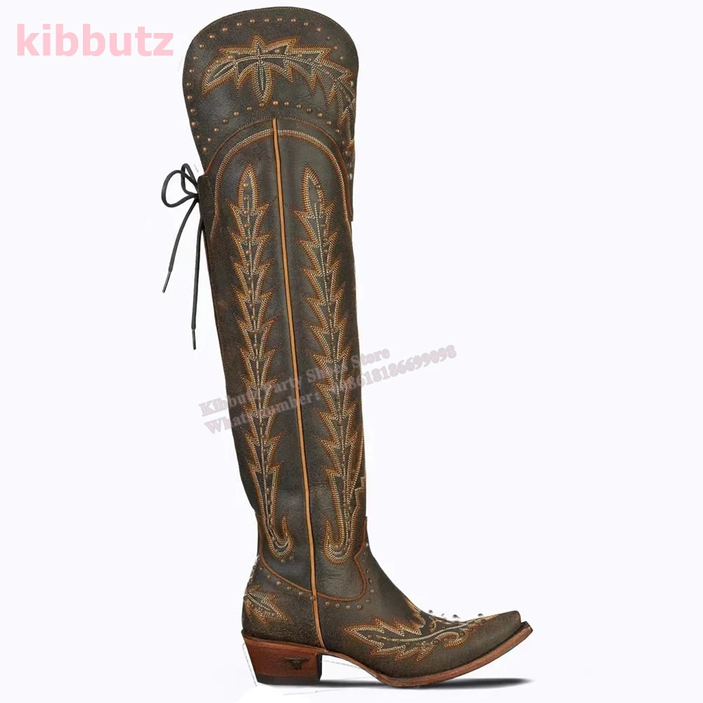 Rivet Cowboy Vintage Boots Over The Knee High Embroidery Lace-Up Luxury Leather Pointed Toe Chunky Heels Fashion Concise Shoes