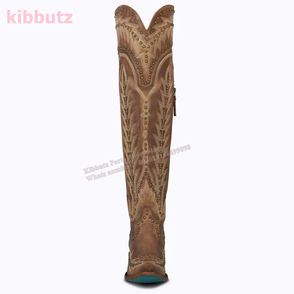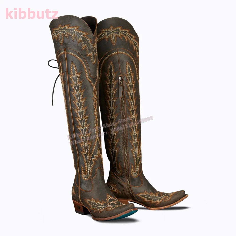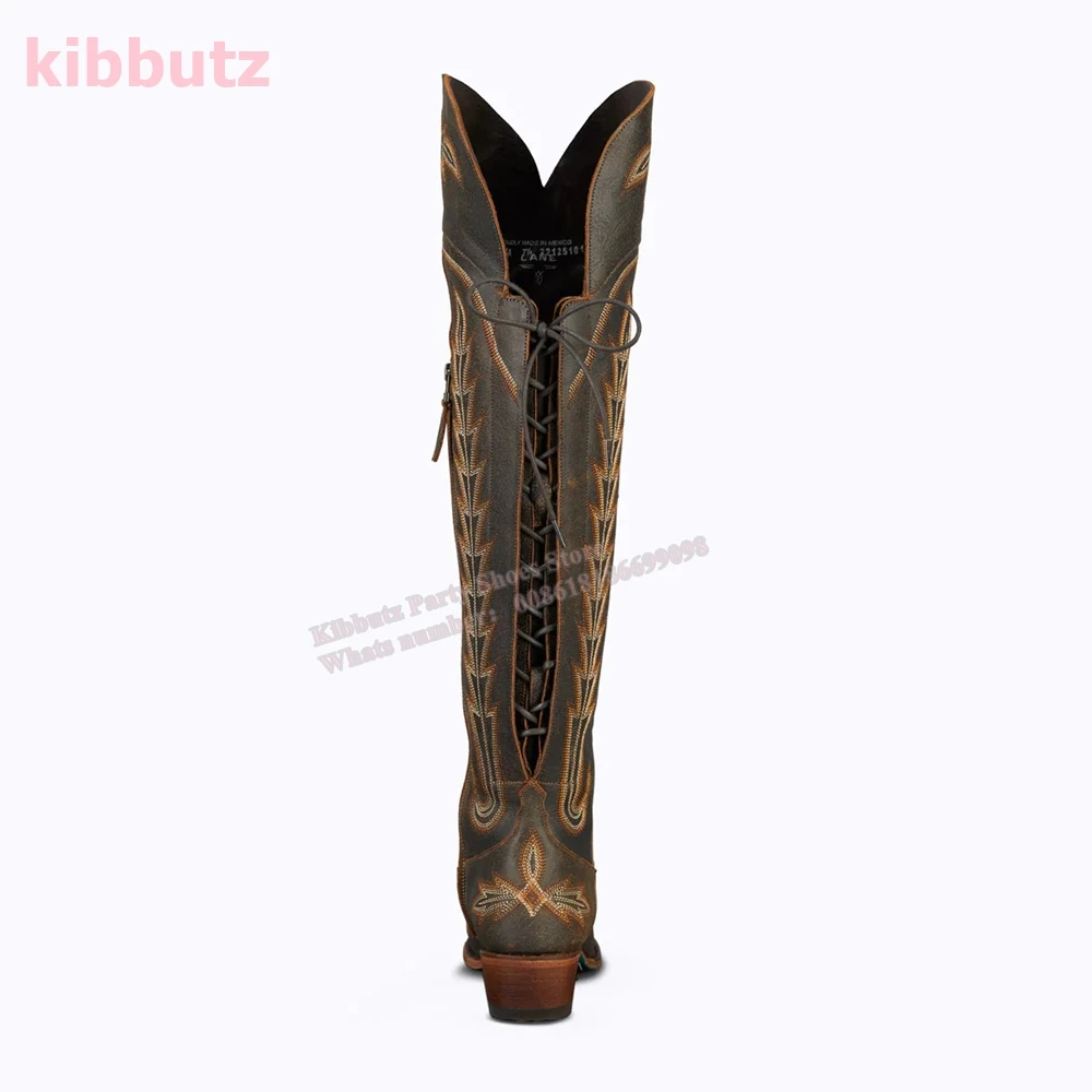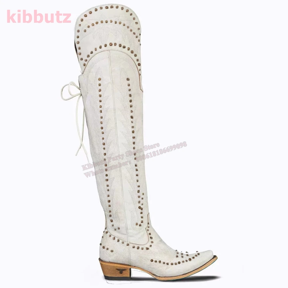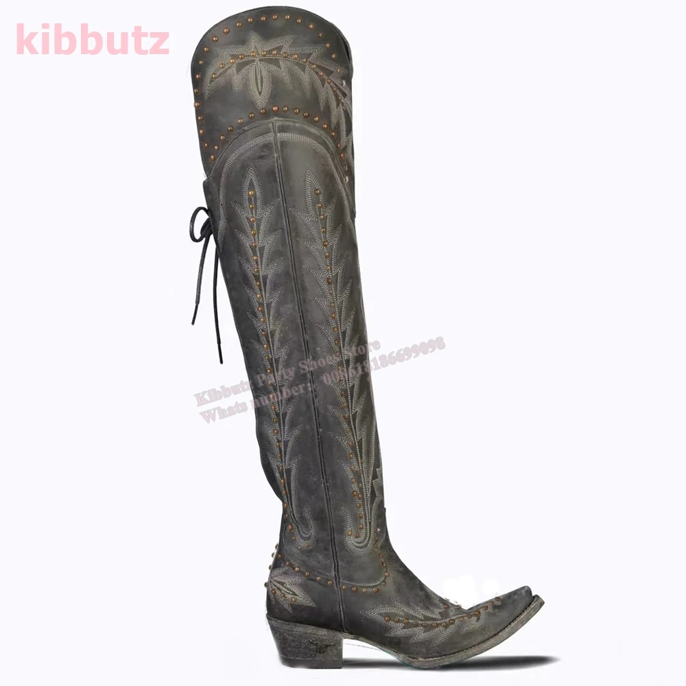 Rivet Cowboy Vintage Boots Over The Knee High Embroidery Lace-Up Luxury Leather Pointed Toe Chunky Heels Fashion Concise Shoes