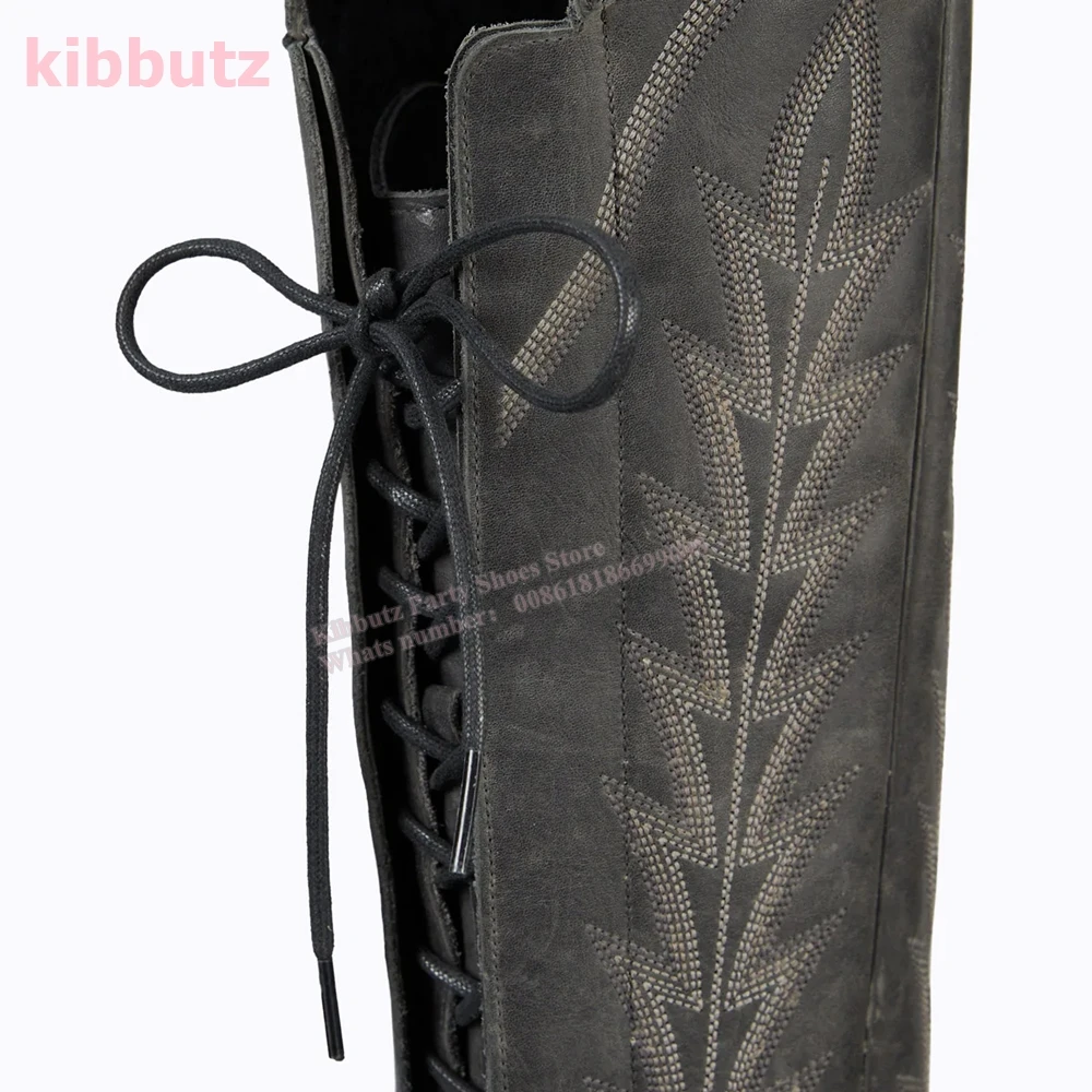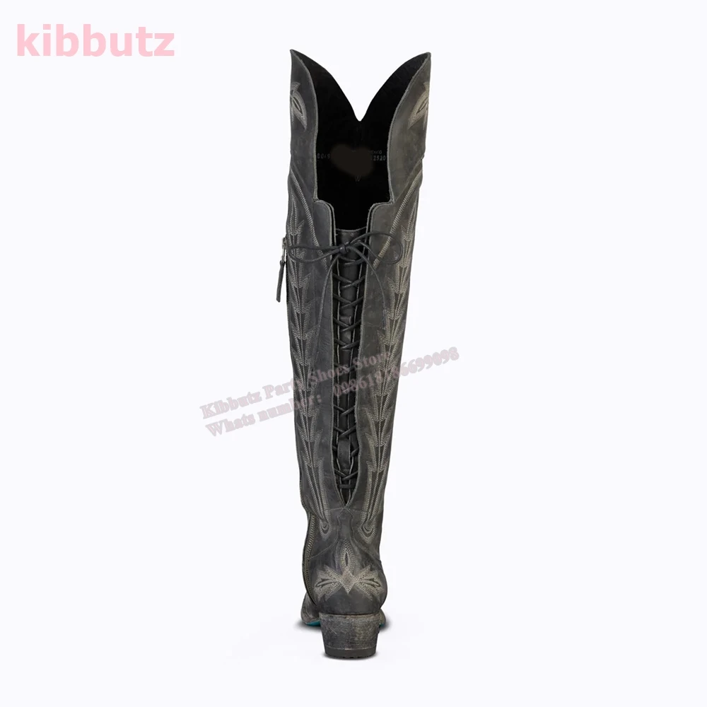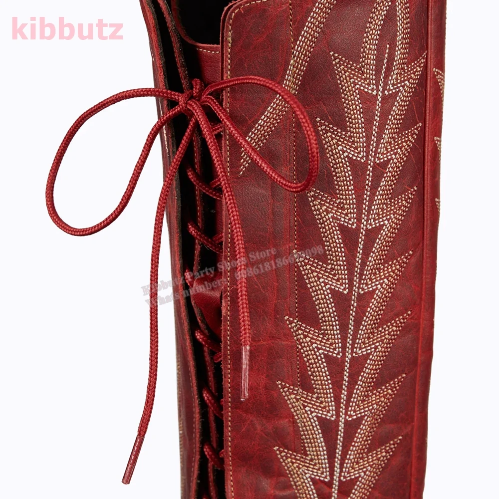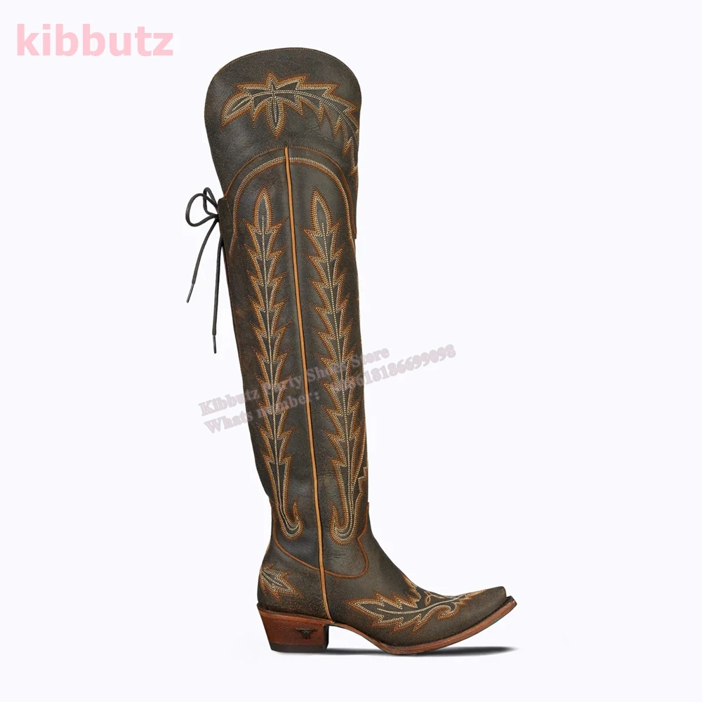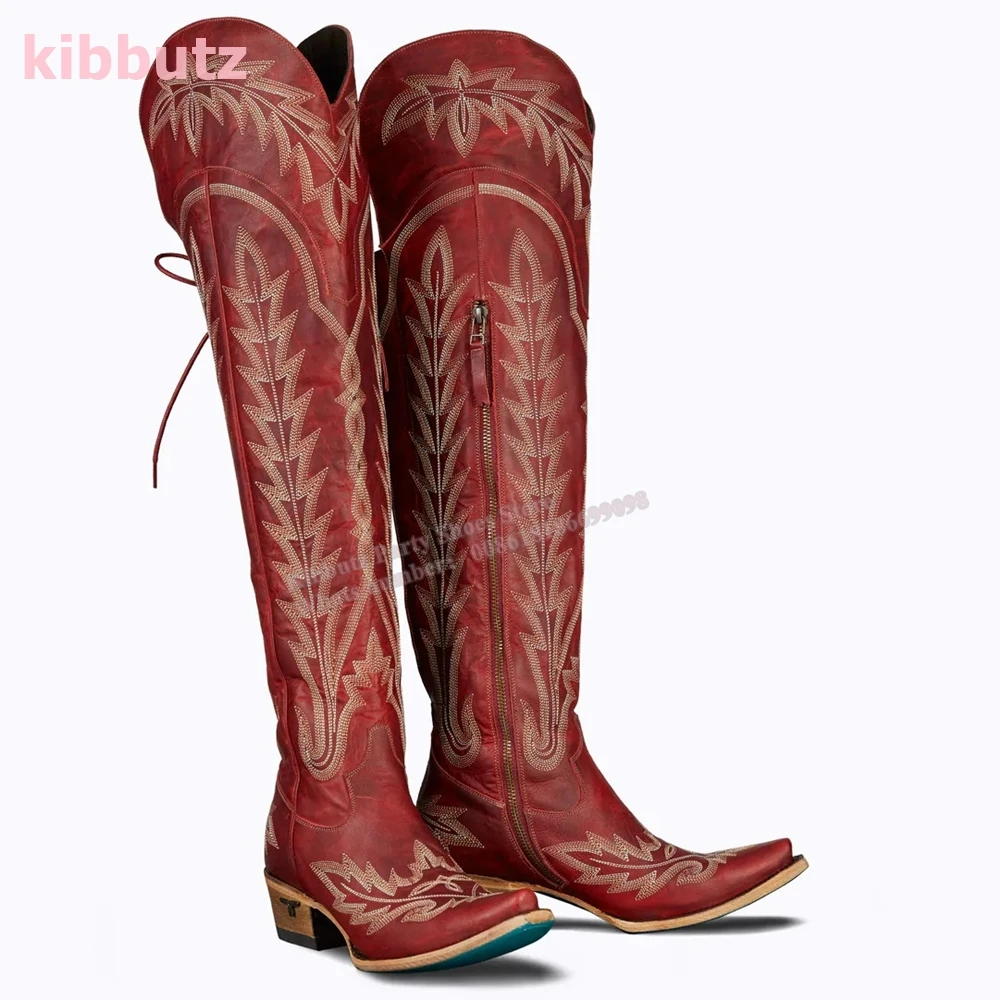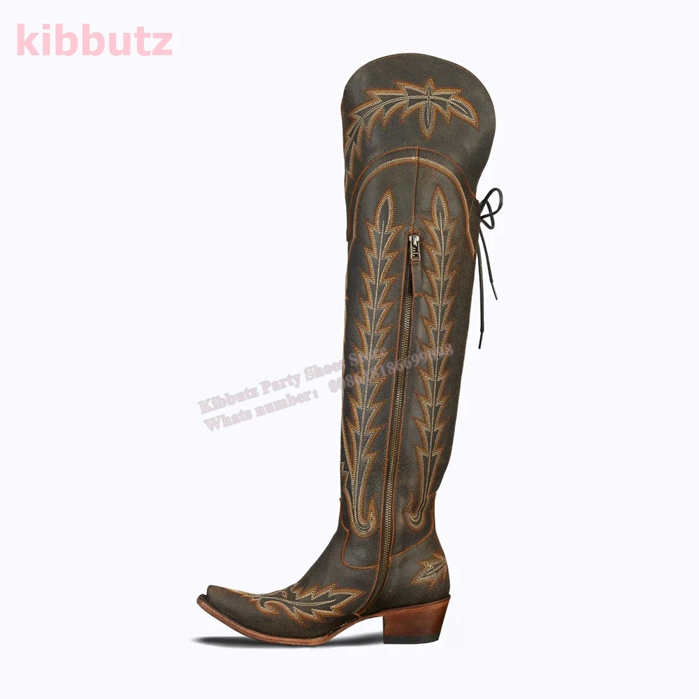 Rivet Cowboy Vintage Boots Over The Knee High Embroidery Lace-Up Luxury Leather Pointed Toe Chunky Heels Fashion Concise Shoes