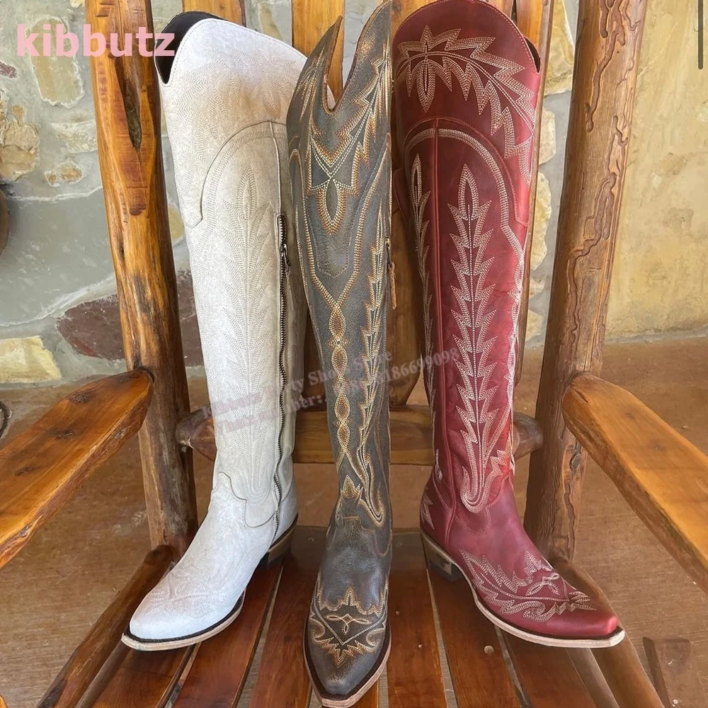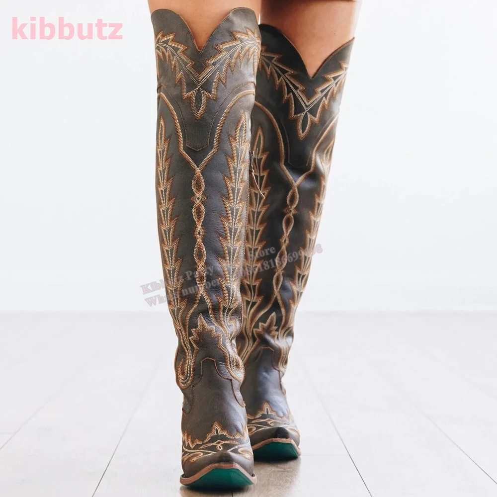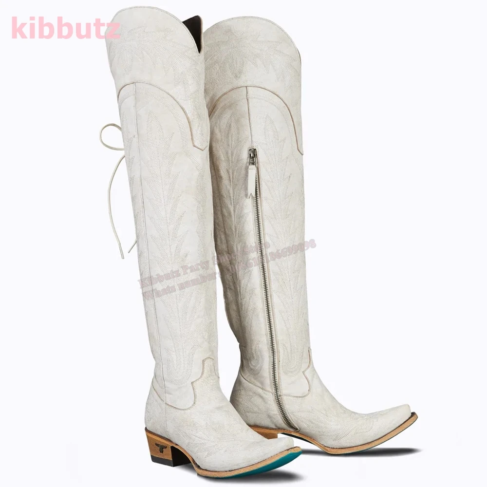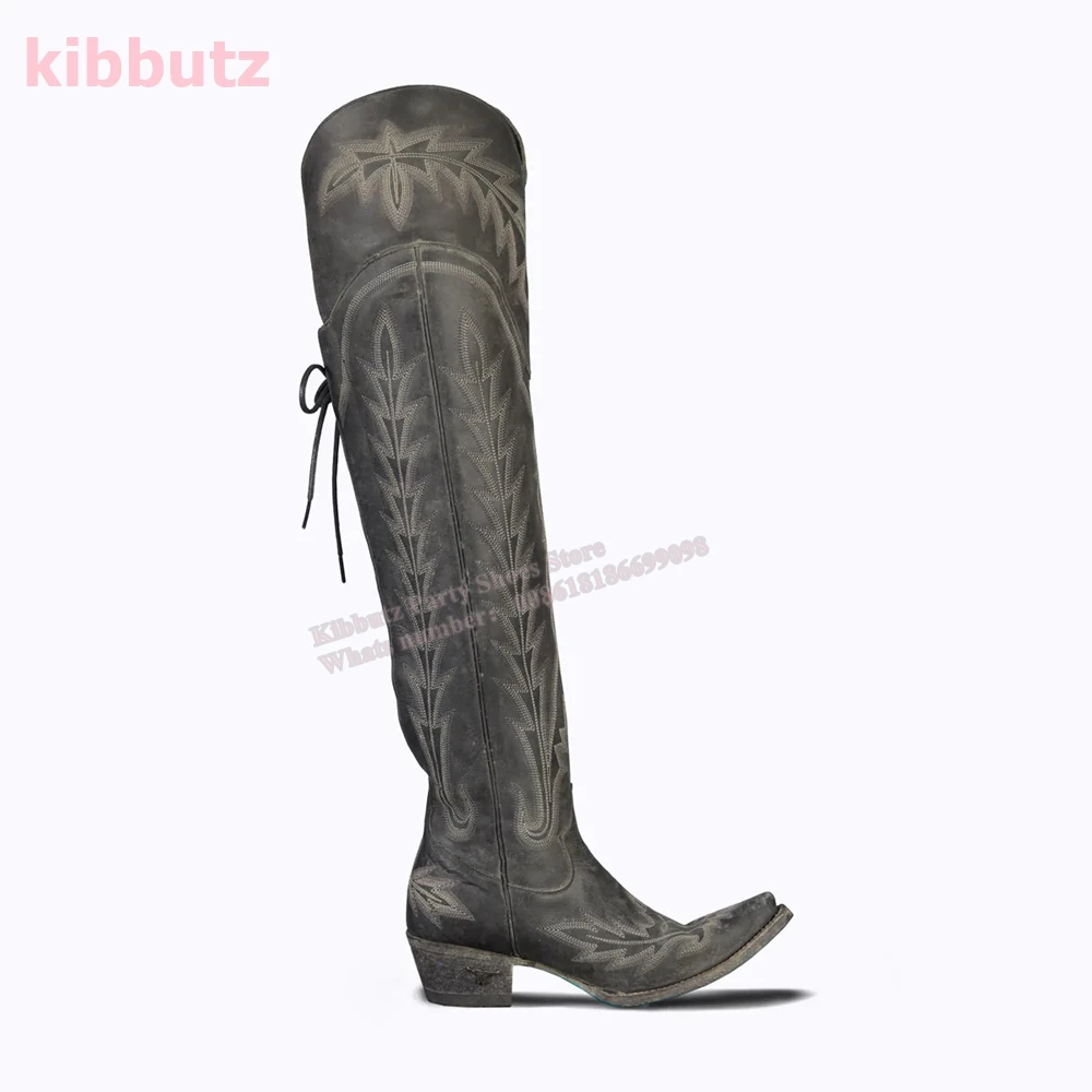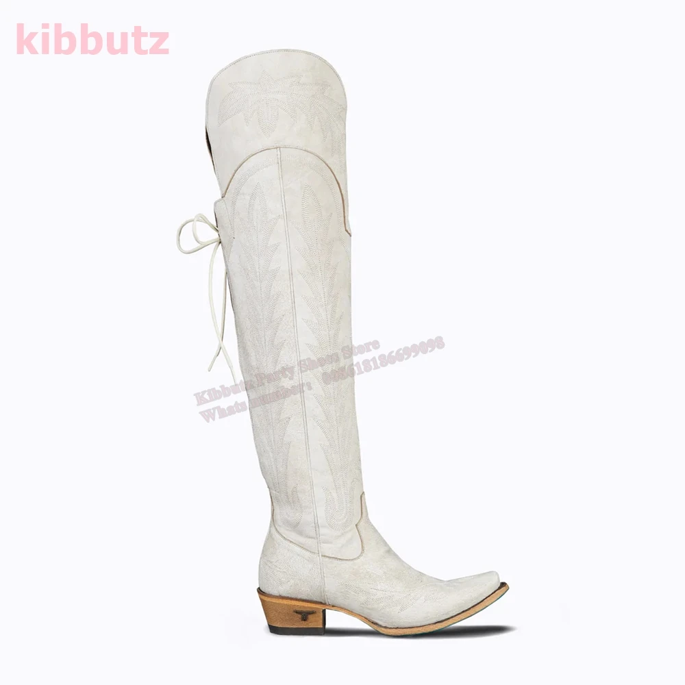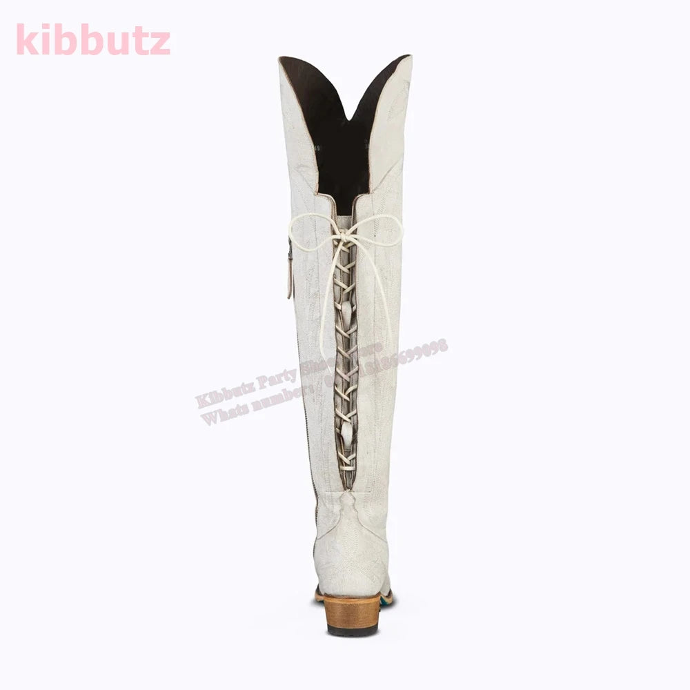 Rivet Cowboy Vintage Boots Over The Knee High Embroidery Lace-Up Luxury Leather Pointed Toe Chunky Heels Fashion Concise Shoes