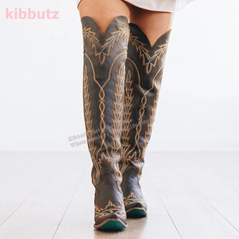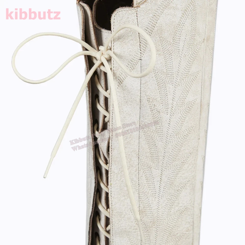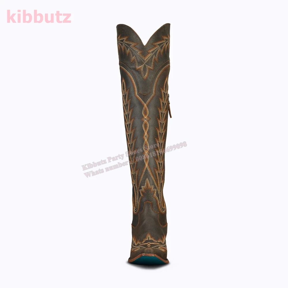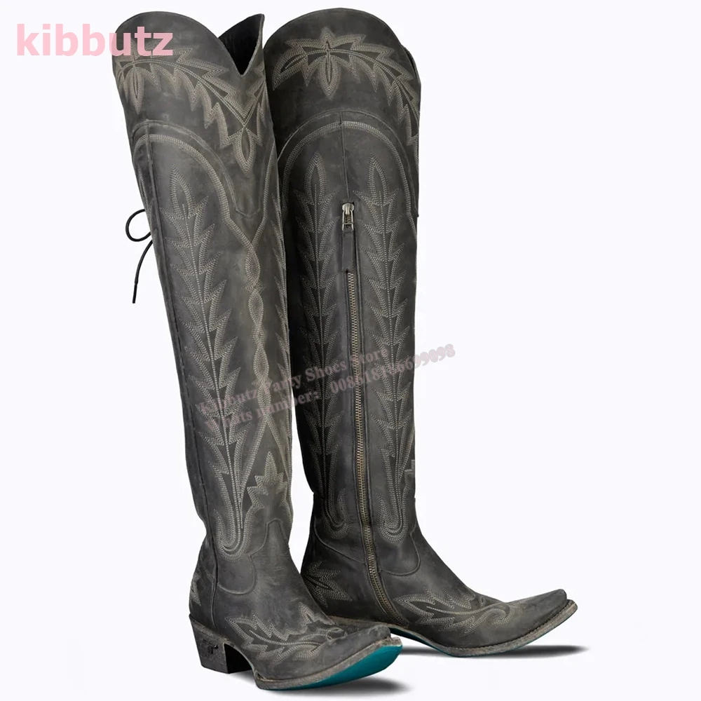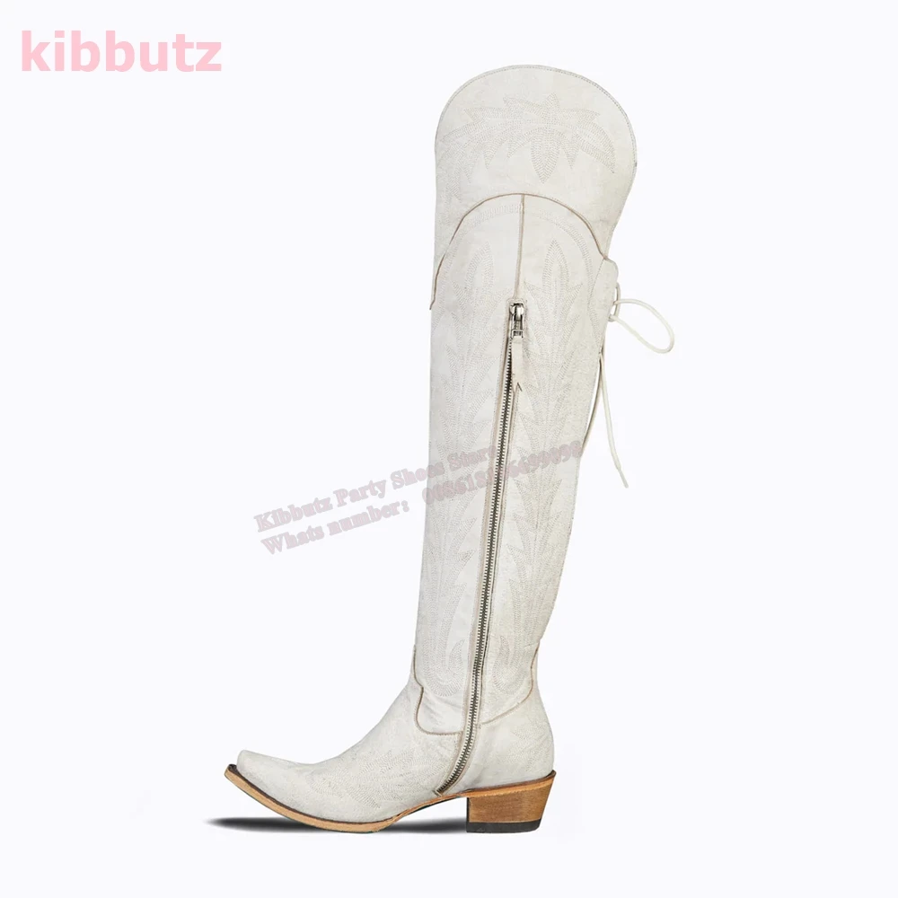 Rivet Cowboy Vintage Boots Over The Knee High Embroidery Lace-Up Luxury Leather Pointed Toe Chunky Heels Fashion Concise Shoes